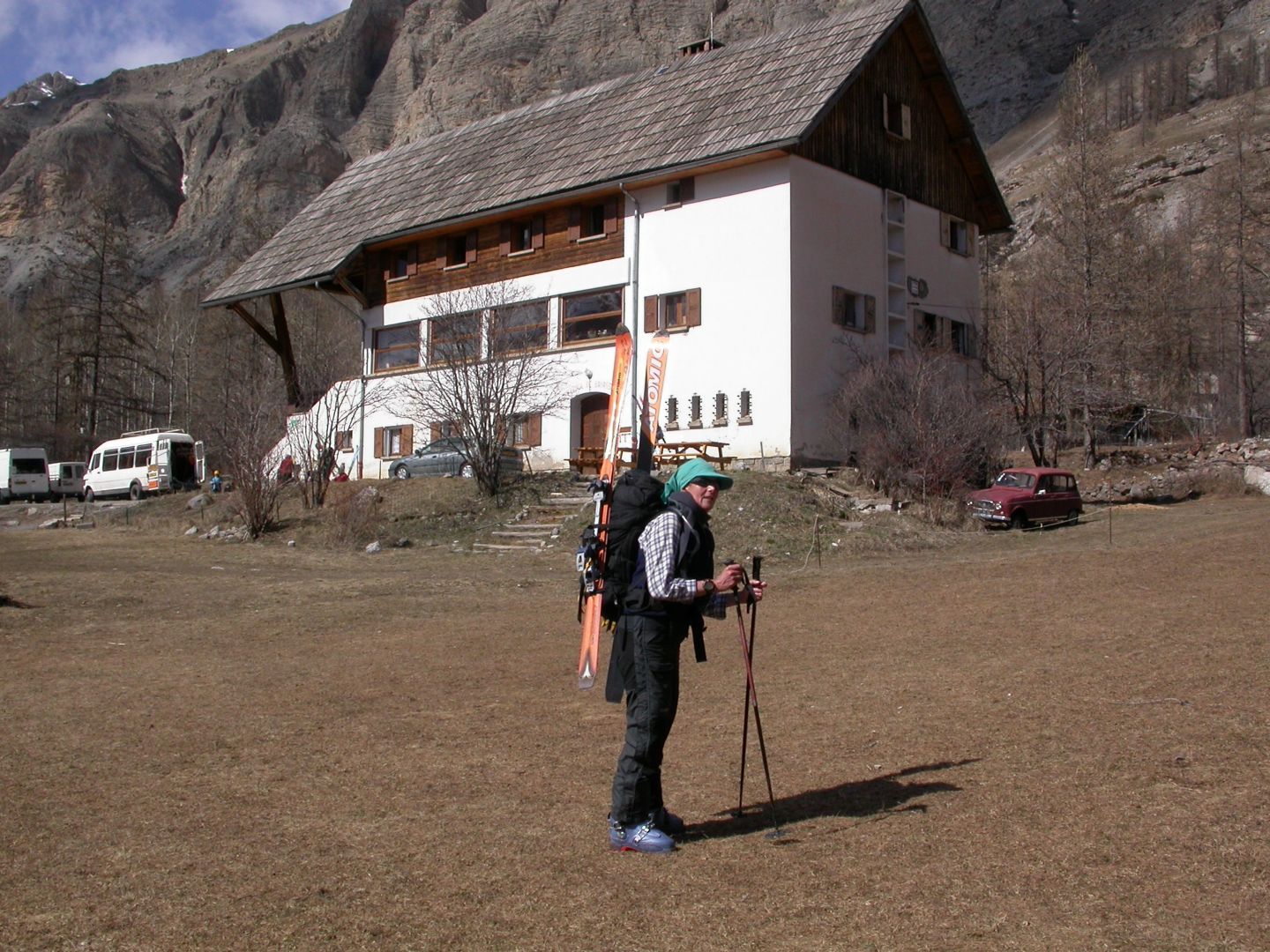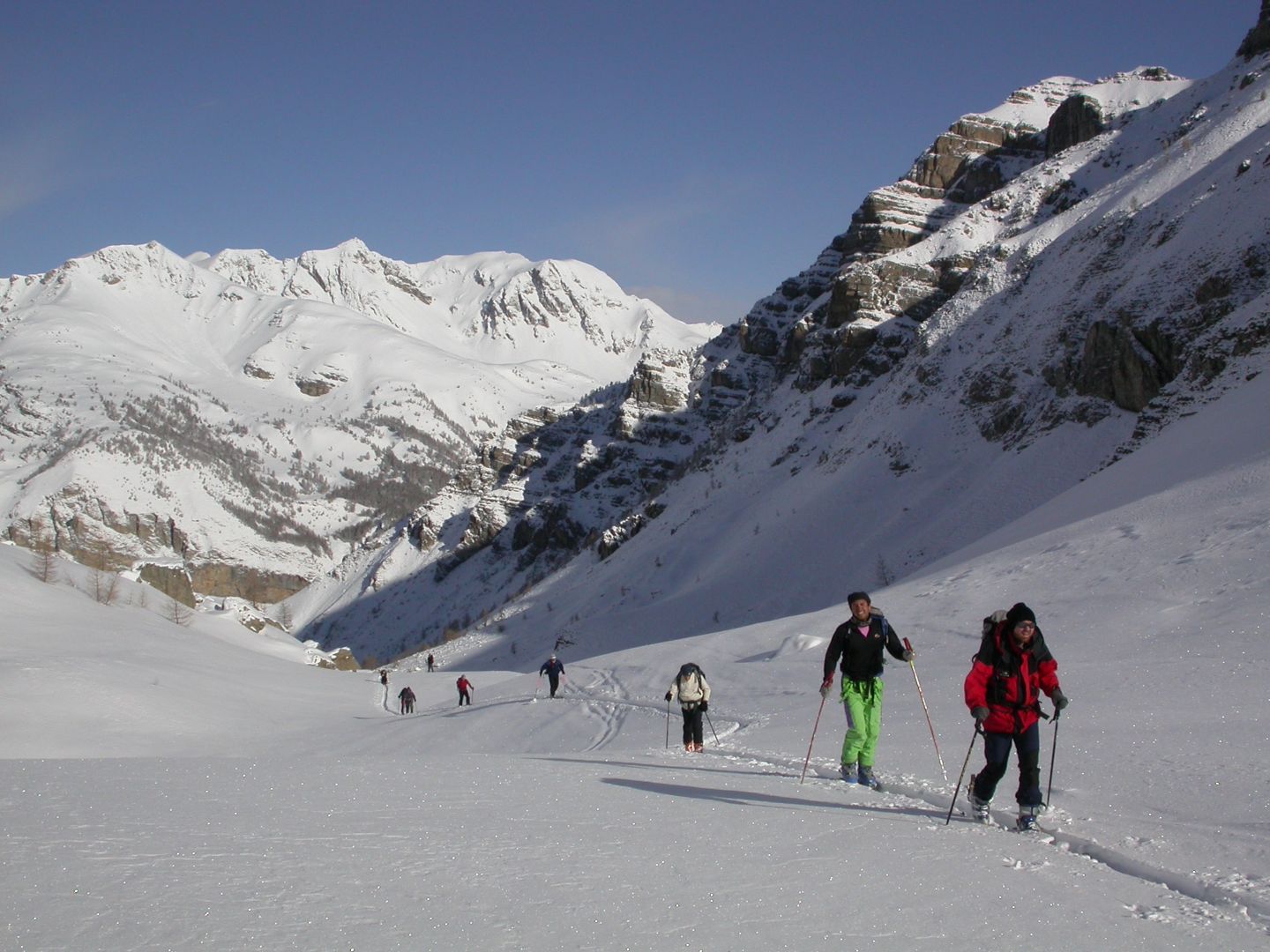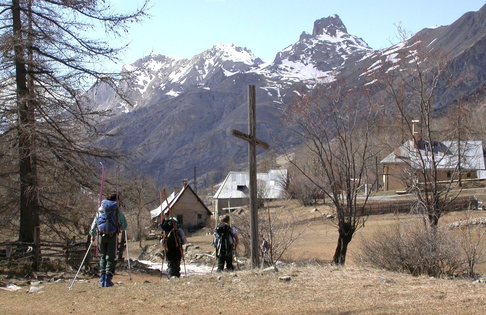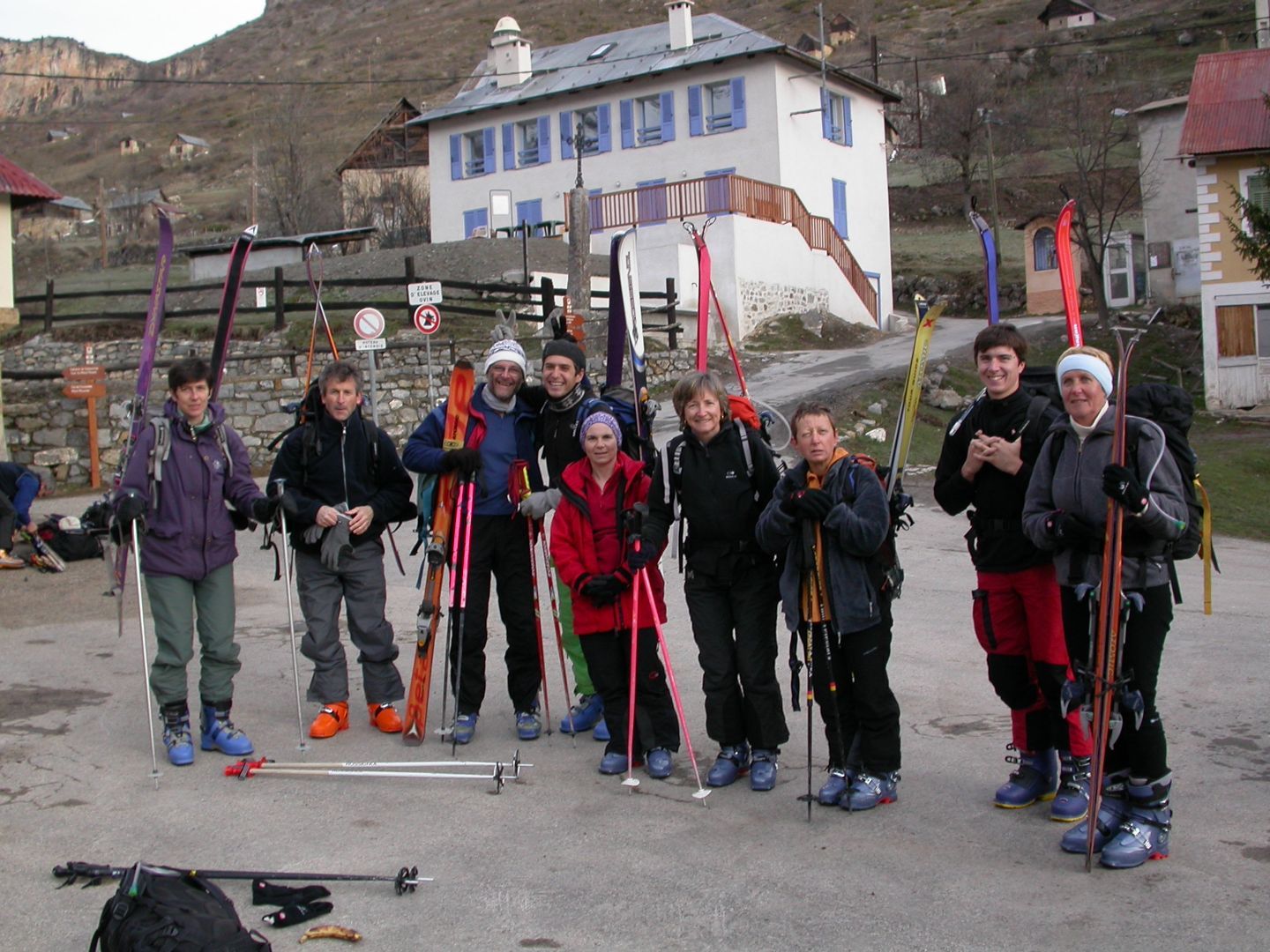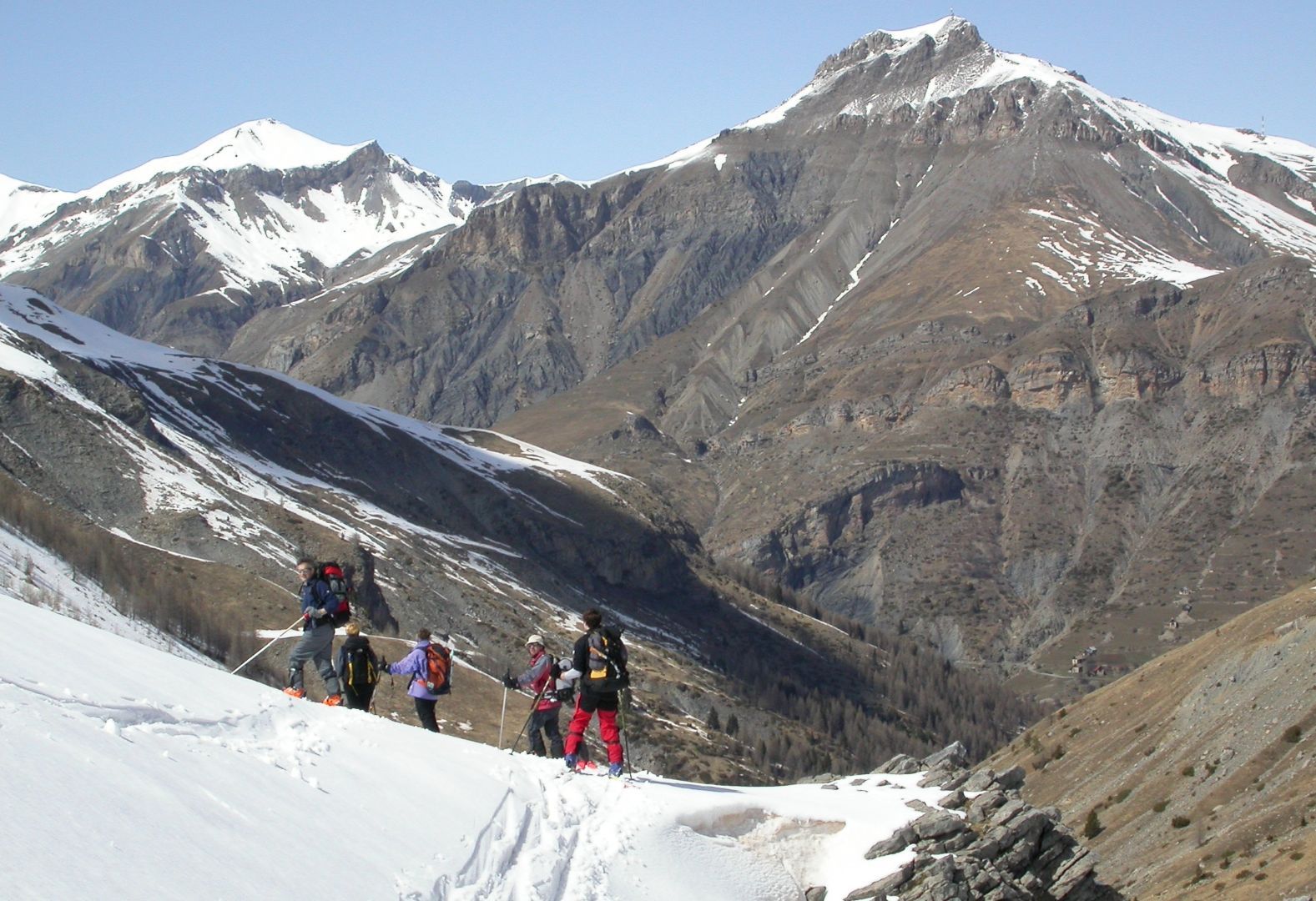 - Lundi : le col de la Roche Trouée (2583m) et la pointe de la Côte de l’Âne (2916m) depuis St Dalmas de Selvage (1500m). Remontée du vallon de Gialorgues jusqu’au refuge du même nom, puis col de la Roche Trouée. Dénivelé de montée : 1100m. Descente en face nord par une belle pente raide en neige dure… pour rejoindre le haut du vallon de Sanguinière. Pause « casse-croute » : il est midi !!!!!! Une fois rassasiés, ascension par un vent d’une rare violence de la face ouest de la pointe de la Côte de l’Âne qui s’atteint par une fine et aérienne arête de neige suivie d’une escalade débonnaire de la pyramide rocheuse sommitale. Dénivelé total de montée : 1500m. Descente sur le vallon de Sanguinière pour rejoindre le hameau d’Estenc (1778m) au cadre enchanteur. Etape au relais hôtel de la Cayolle chez Axelle.