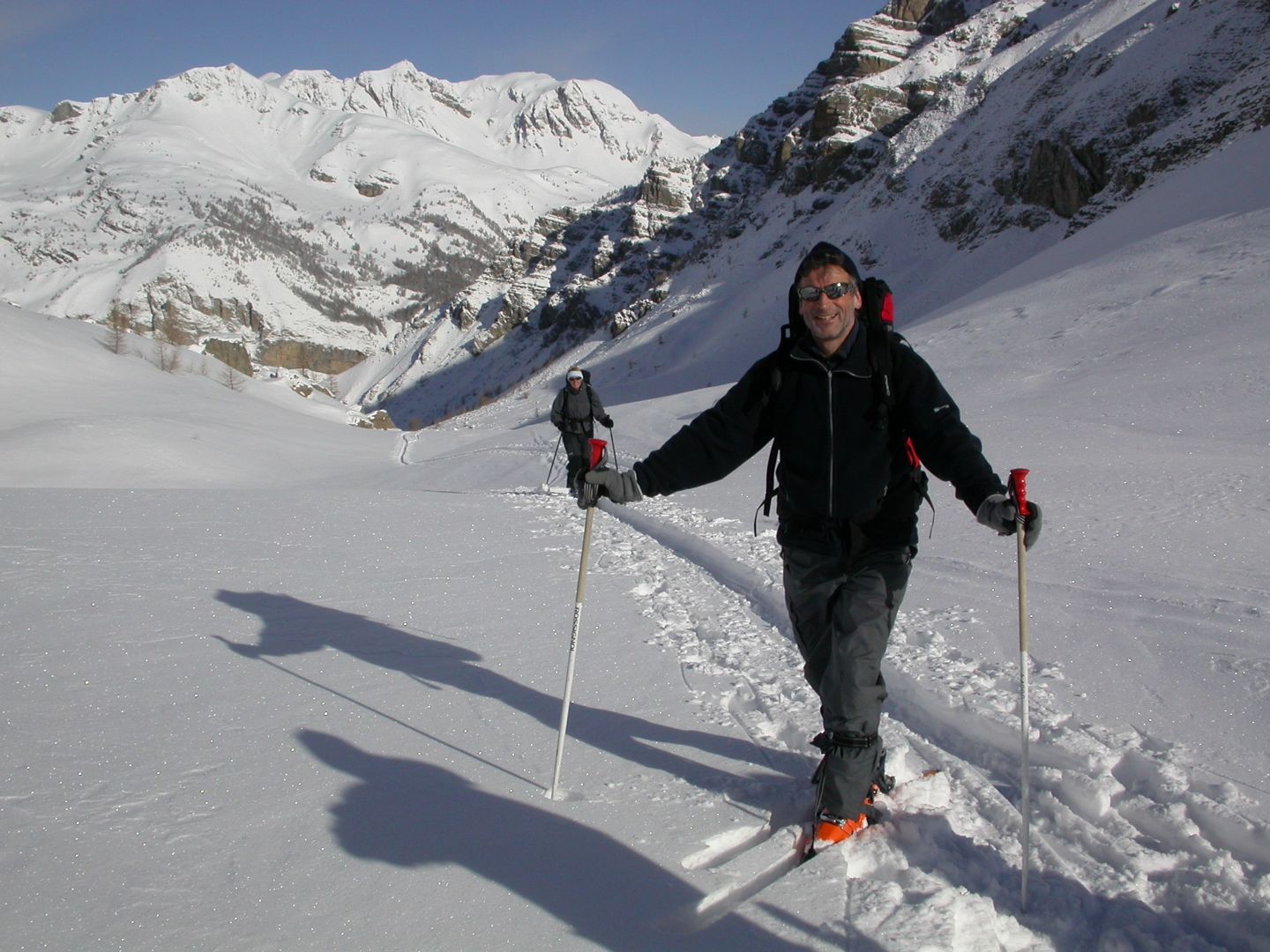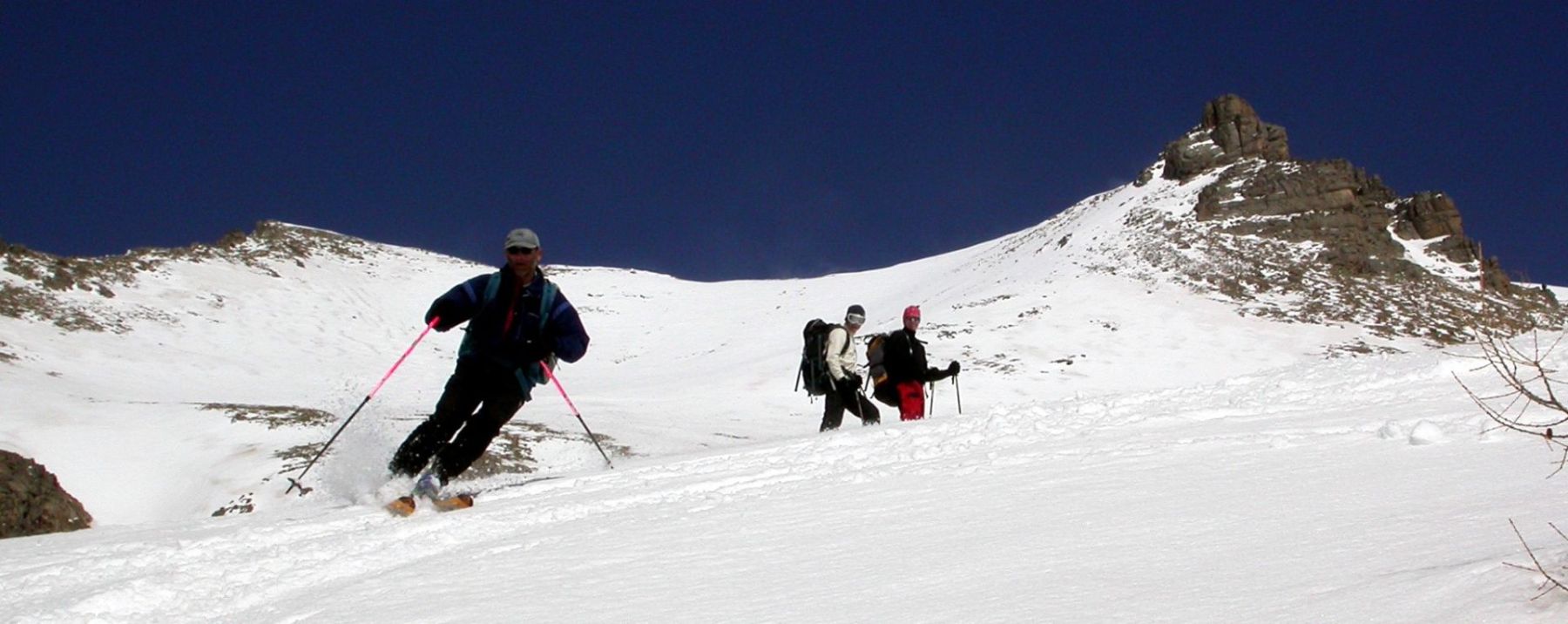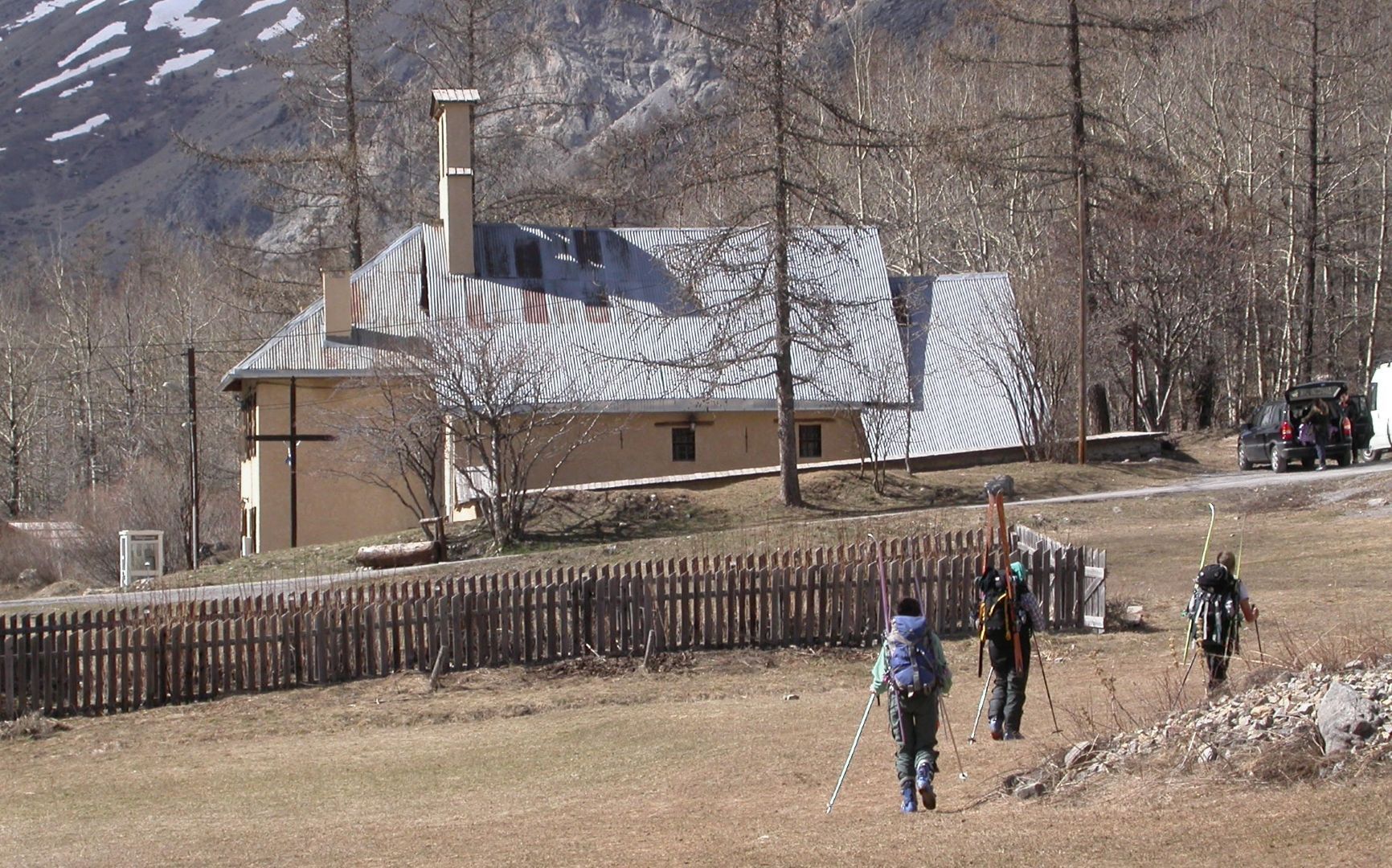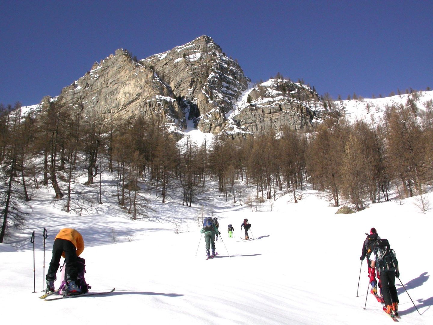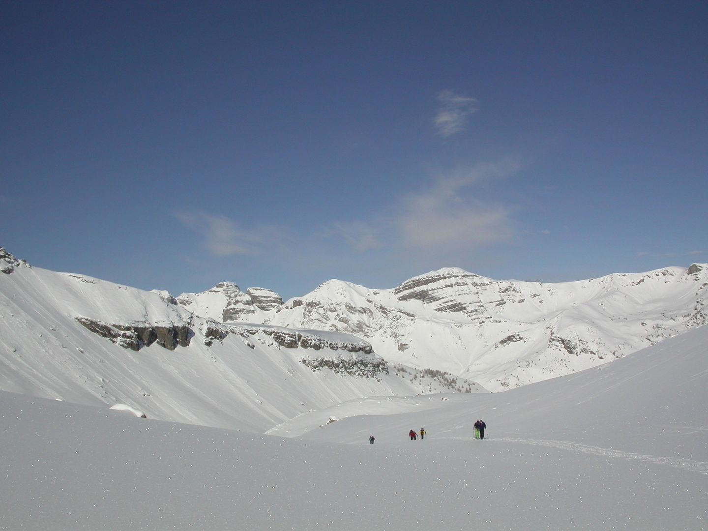 - Lundi : le col de la Roche Trouée (2583m) et la pointe de la Côte de l’Âne (2916m) depuis St Dalmas de Selvage (1500m). Remontée du vallon de Gialorgues jusqu’au refuge du même nom, puis col de la Roche Trouée. Dénivelé de montée : 1100m. Descente en face nord par une belle pente raide en neige dure… pour rejoindre le haut du vallon de Sanguinière. Pause « casse-croute » : il est midi !!!!!! Une fois rassasiés, ascension par un vent d’une rare violence de la face ouest de la pointe de la Côte de l’Âne qui s’atteint par une fine et aérienne arête de neige suivie d’une escalade débonnaire de la pyramide rocheuse sommitale. Dénivelé total de montée : 1500m. Descente sur le vallon de Sanguinière pour rejoindre le hameau d’Estenc (1778m) au cadre enchanteur. Etape au relais hôtel de la Cayolle chez Axelle.