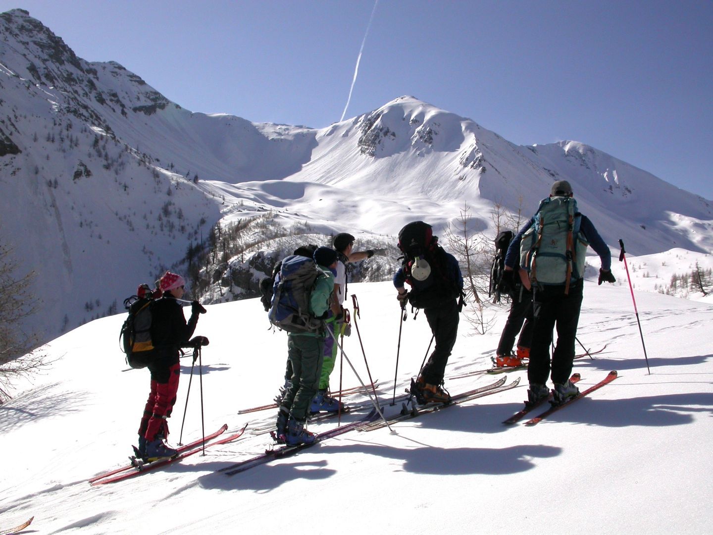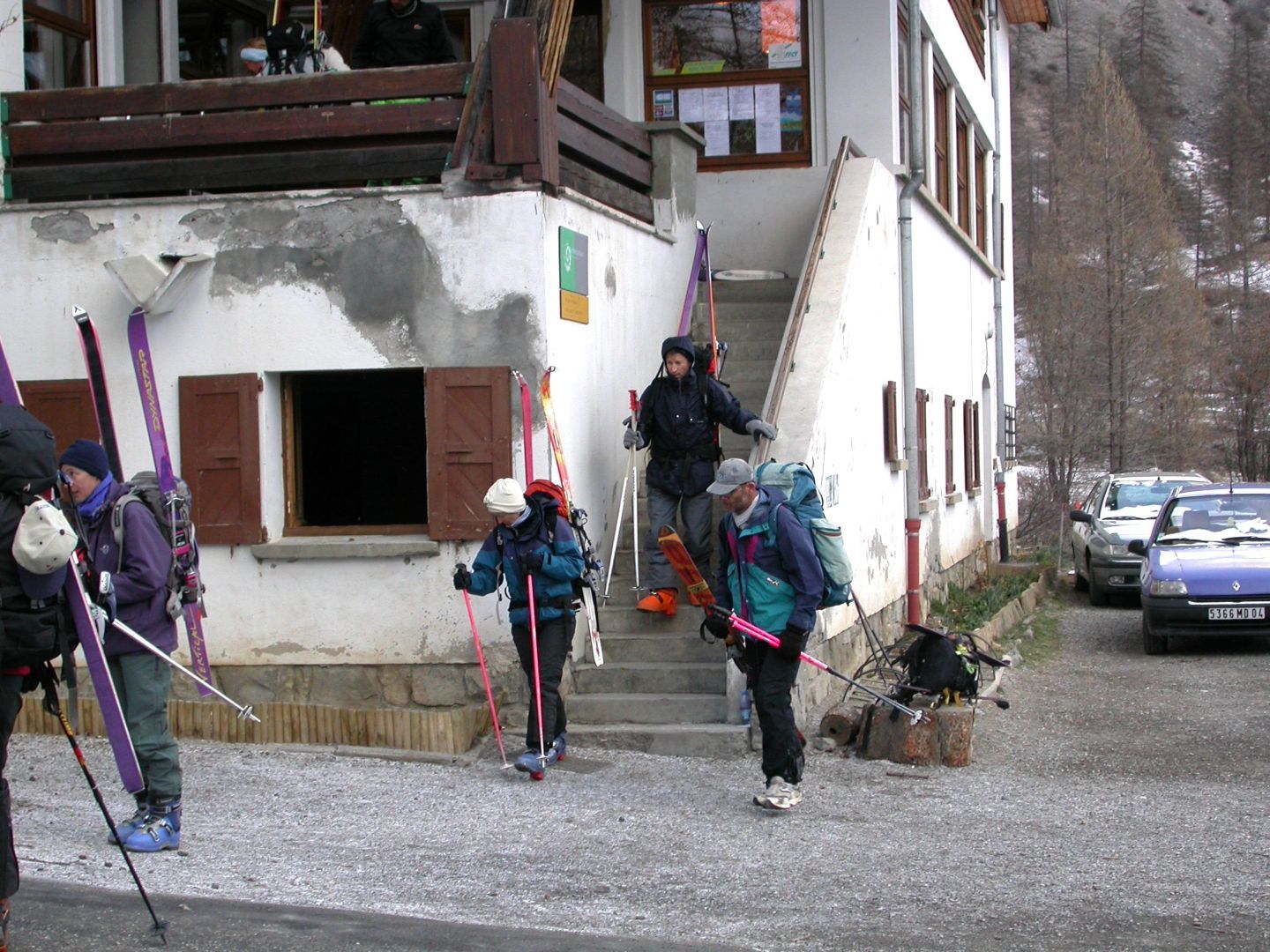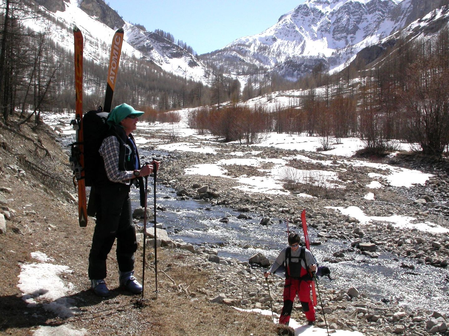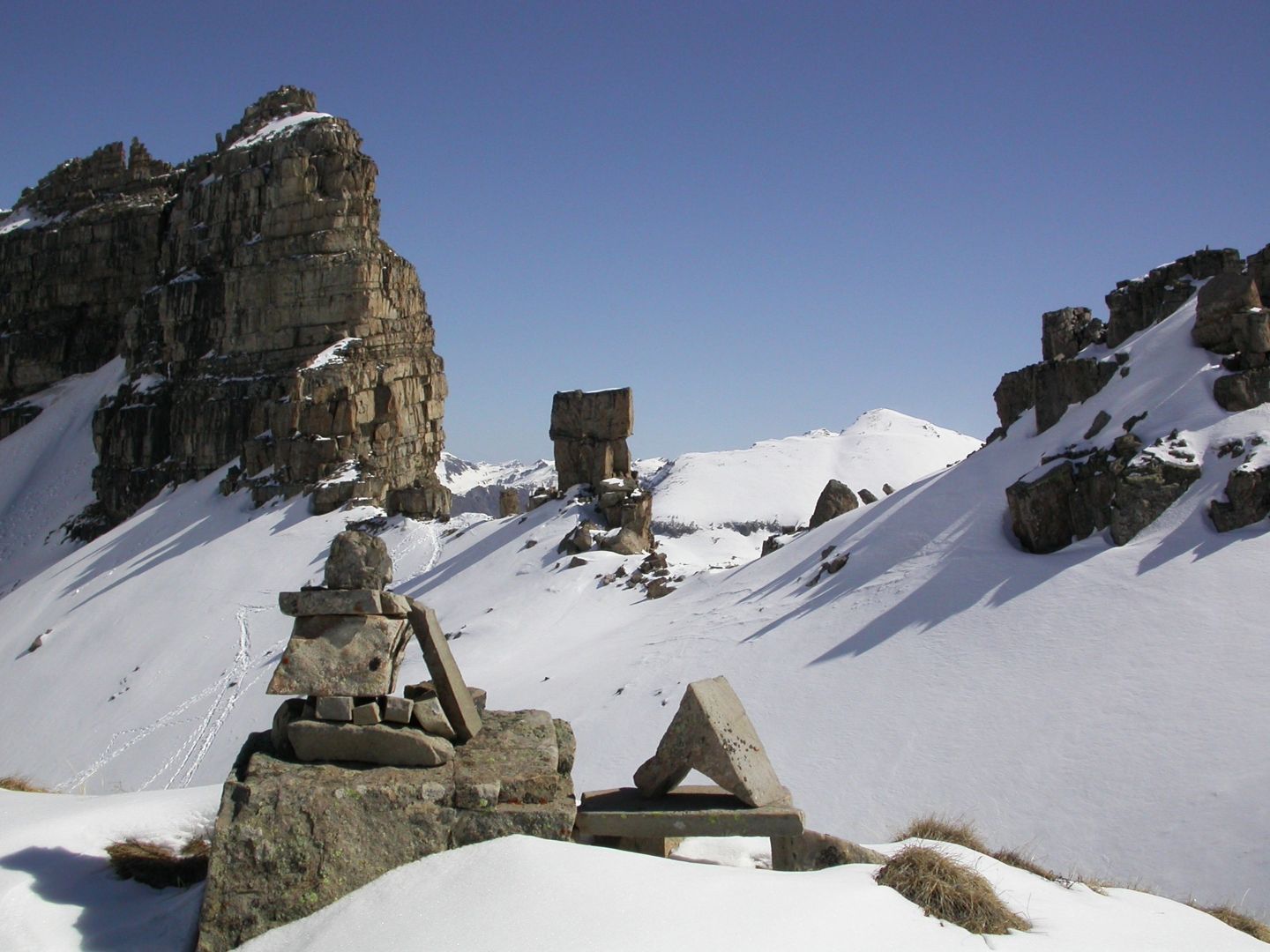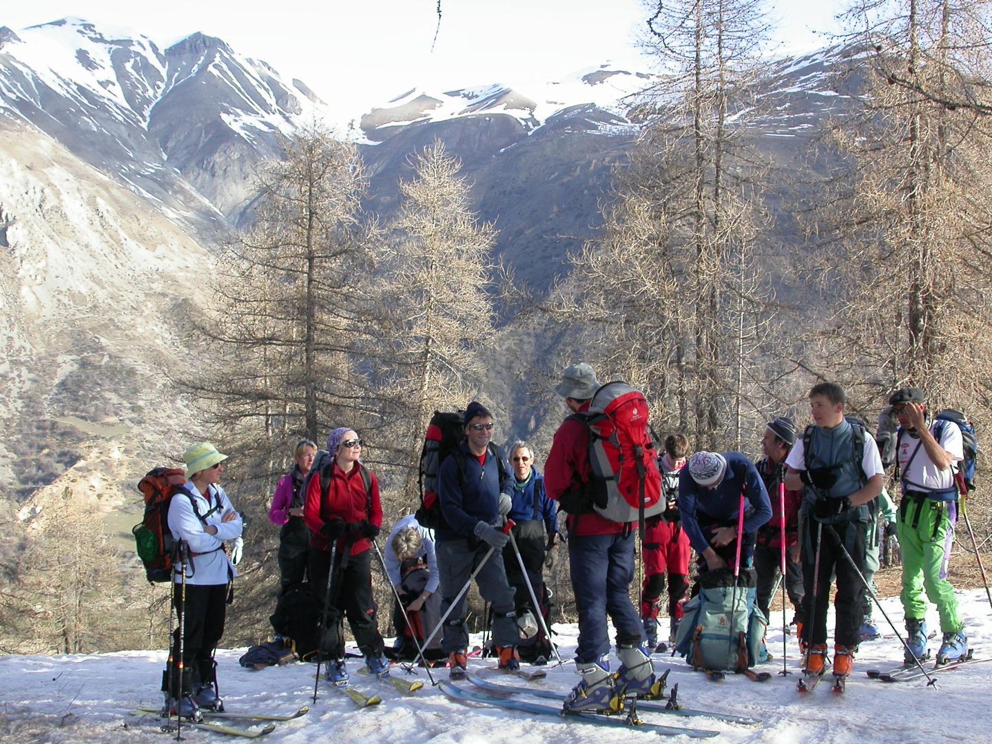 - Lundi : le col de la Roche Trouée (2583m) et la pointe de la Côte de l’Âne (2916m) depuis St Dalmas de Selvage (1500m). Remontée du vallon de Gialorgues jusqu’au refuge du même nom, puis col de la Roche Trouée. Dénivelé de montée : 1100m. Descente en face nord par une belle pente raide en neige dure… pour rejoindre le haut du vallon de Sanguinière. Pause « casse-croute » : il est midi !!!!!! Une fois rassasiés, ascension par un vent d’une rare violence de la face ouest de la pointe de la Côte de l’Âne qui s’atteint par une fine et aérienne arête de neige suivie d’une escalade débonnaire de la pyramide rocheuse sommitale. Dénivelé total de montée : 1500m. Descente sur le vallon de Sanguinière pour rejoindre le hameau d’Estenc (1778m) au cadre enchanteur. Etape au relais hôtel de la Cayolle chez Axelle.