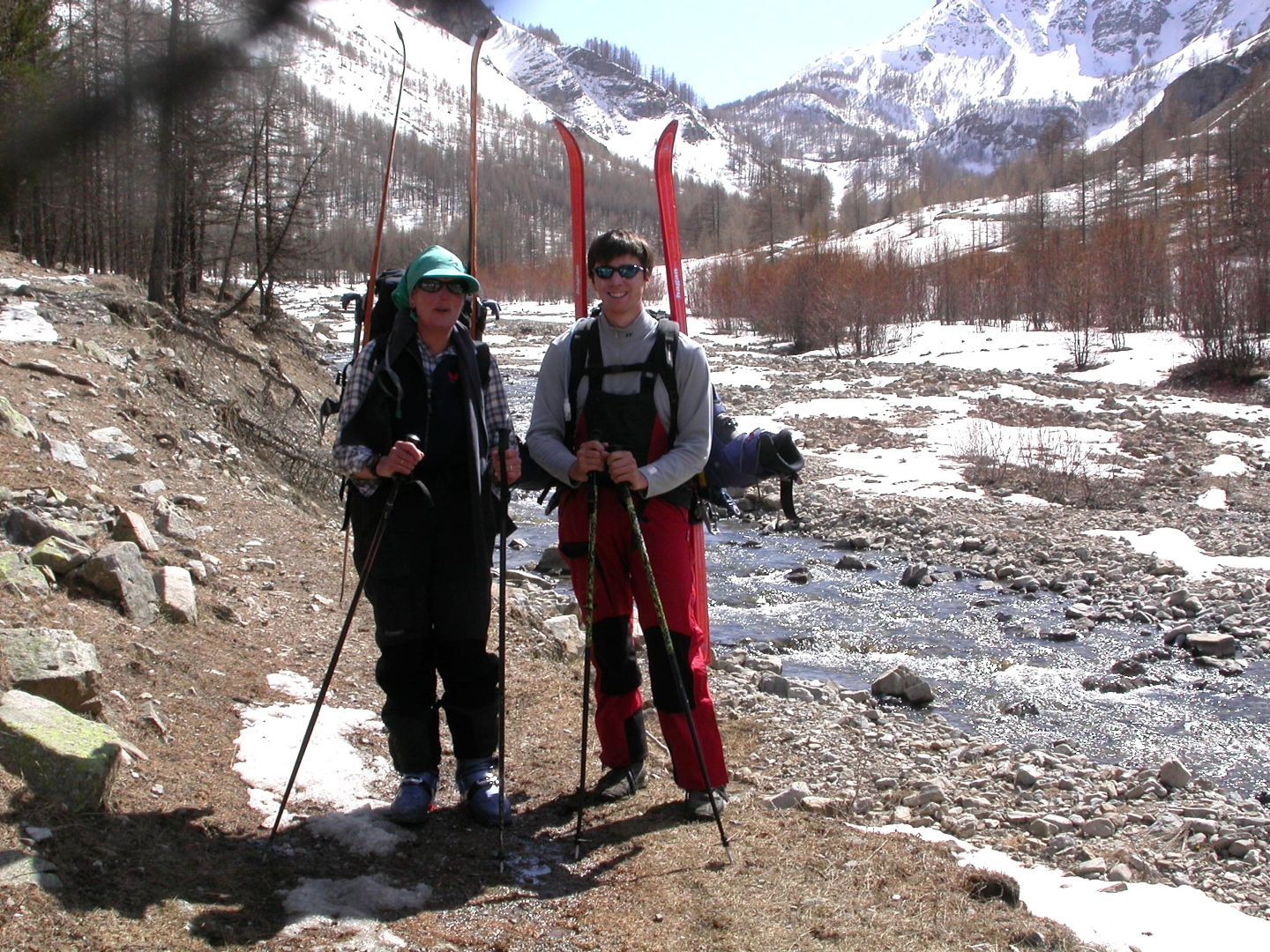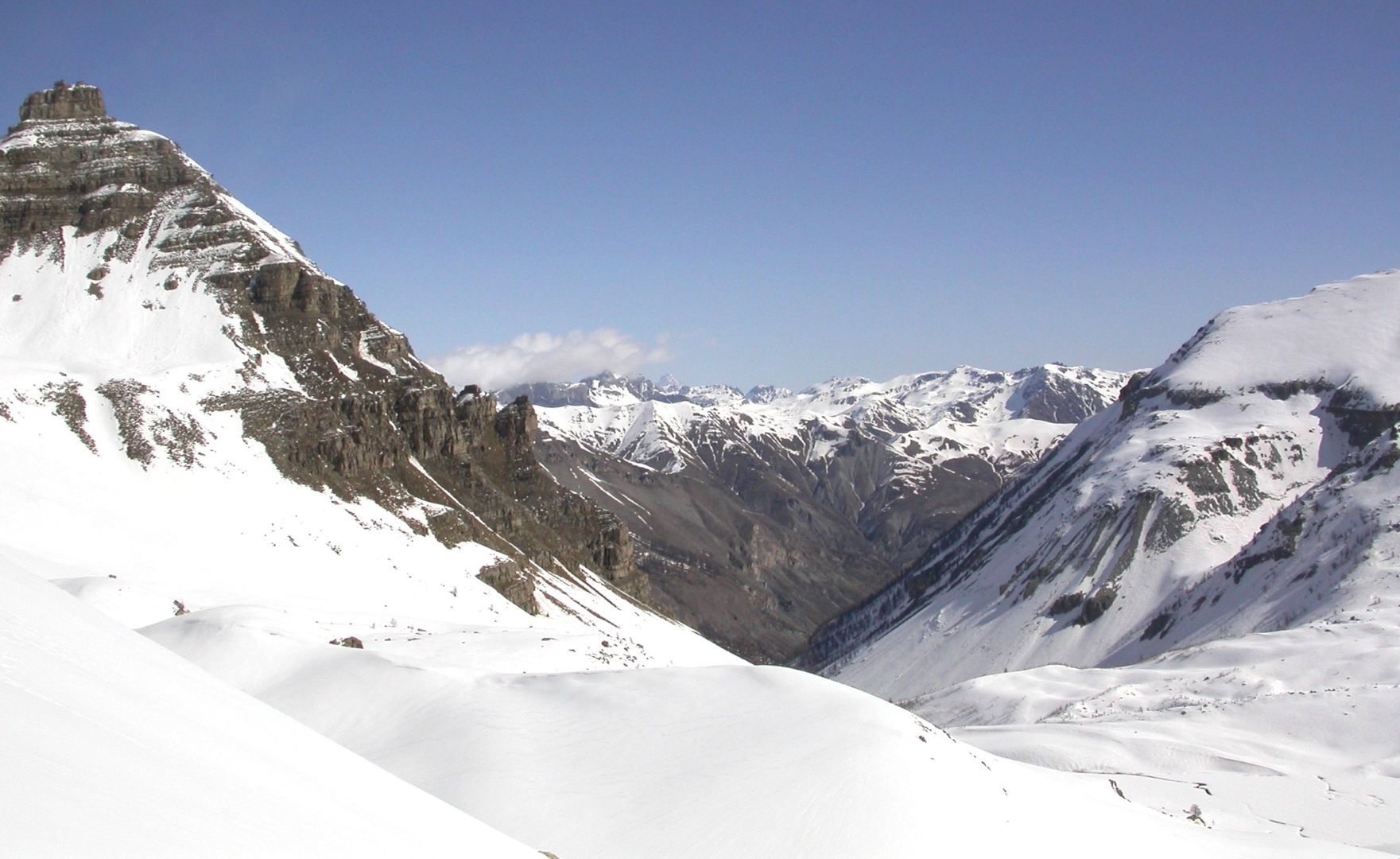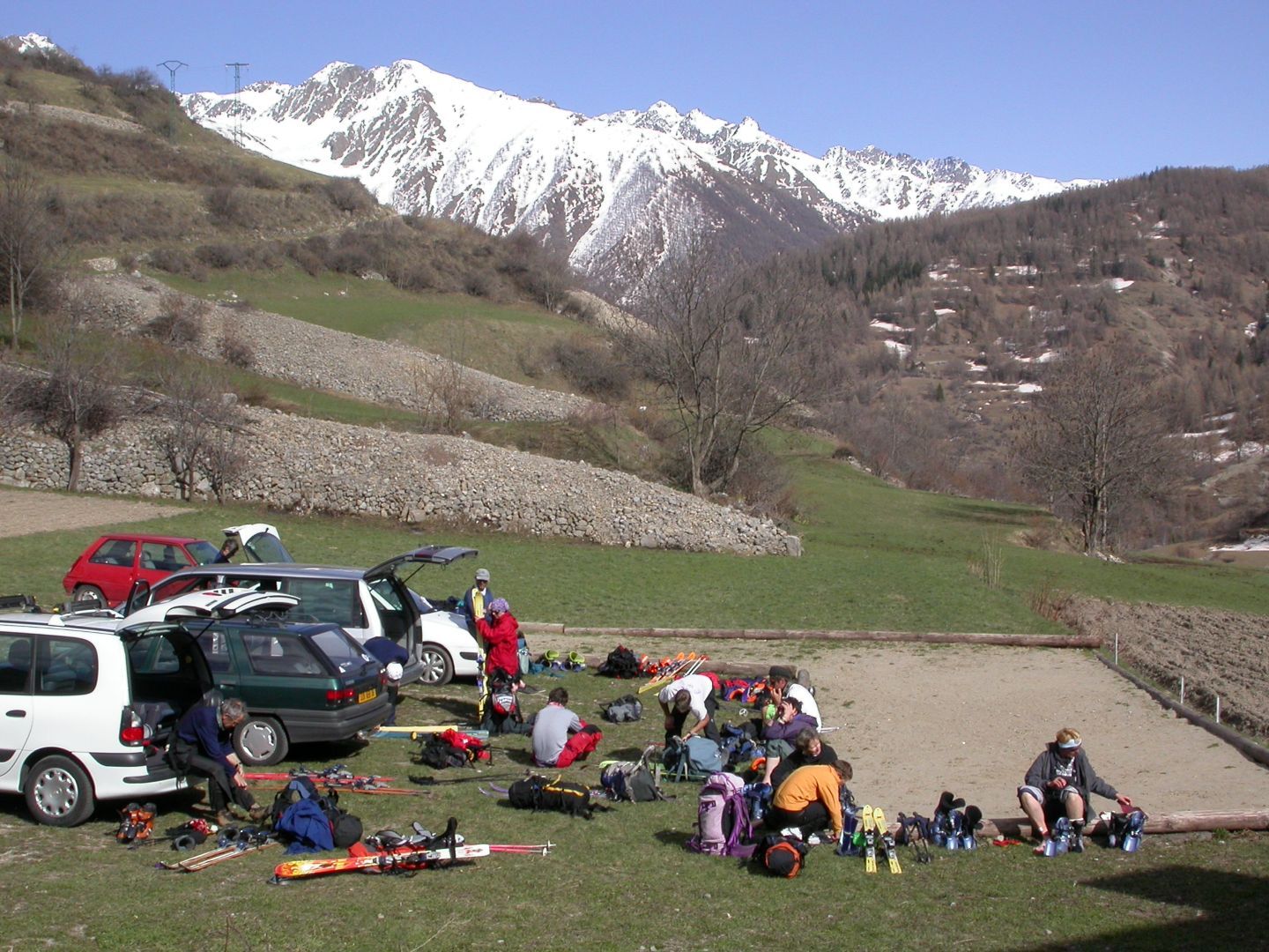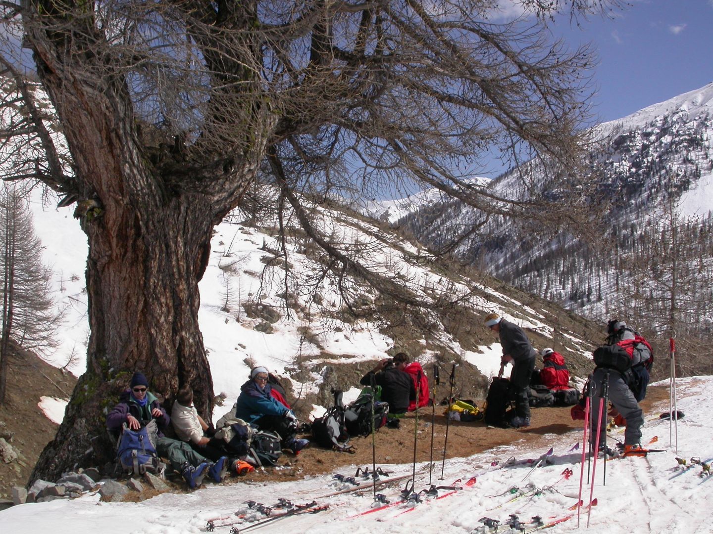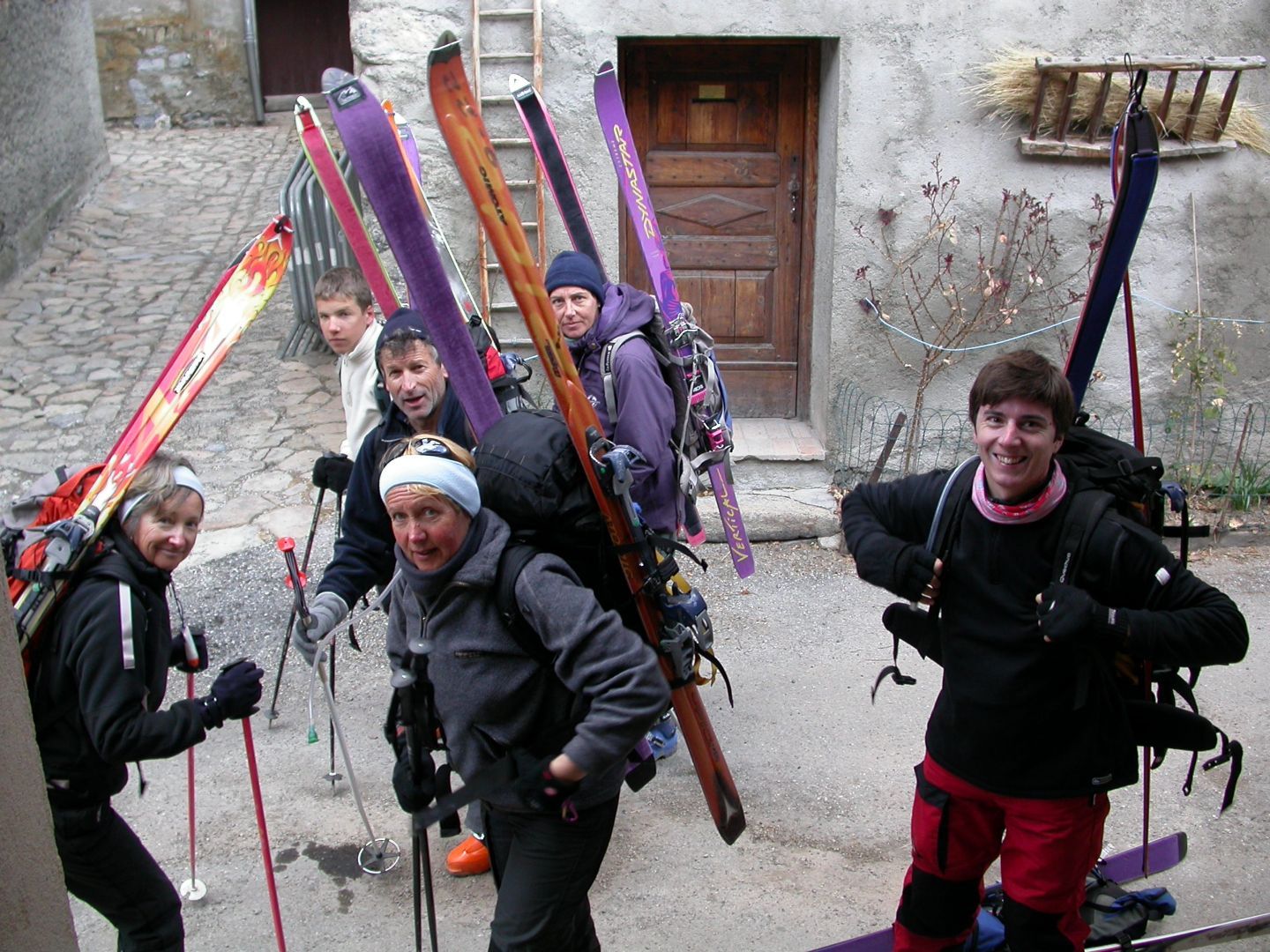 - Lundi : le col de la Roche Trouée (2583m) et la pointe de la Côte de l’Âne (2916m) depuis St Dalmas de Selvage (1500m). Remontée du vallon de Gialorgues jusqu’au refuge du même nom, puis col de la Roche Trouée. Dénivelé de montée : 1100m. Descente en face nord par une belle pente raide en neige dure… pour rejoindre le haut du vallon de Sanguinière. Pause « casse-croute » : il est midi !!!!!! Une fois rassasiés, ascension par un vent d’une rare violence de la face ouest de la pointe de la Côte de l’Âne qui s’atteint par une fine et aérienne arête de neige suivie d’une escalade débonnaire de la pyramide rocheuse sommitale. Dénivelé total de montée : 1500m. Descente sur le vallon de Sanguinière pour rejoindre le hameau d’Estenc (1778m) au cadre enchanteur. Etape au relais hôtel de la Cayolle chez Axelle.