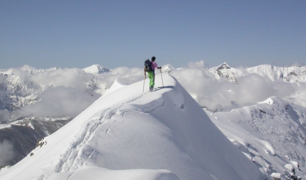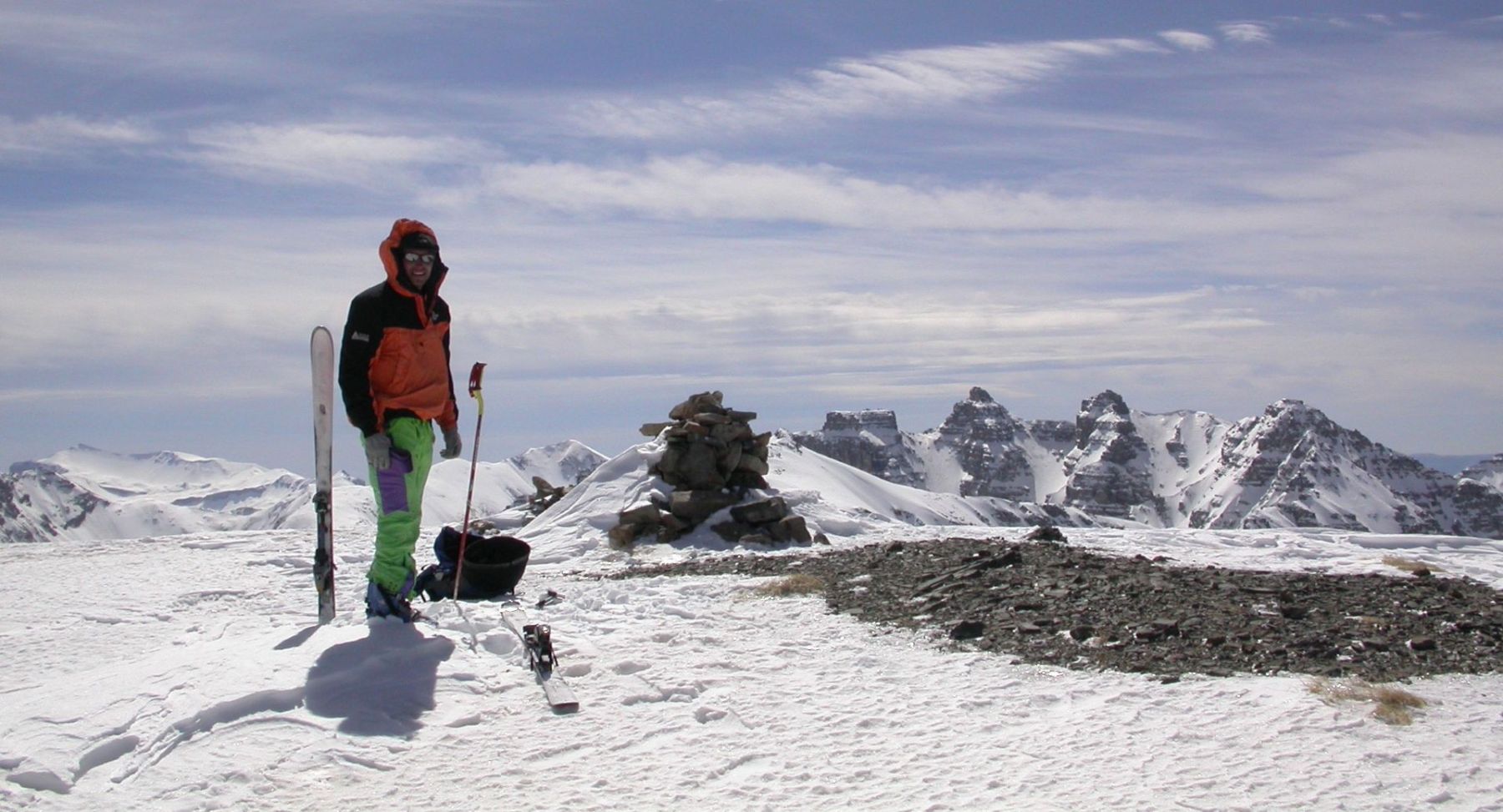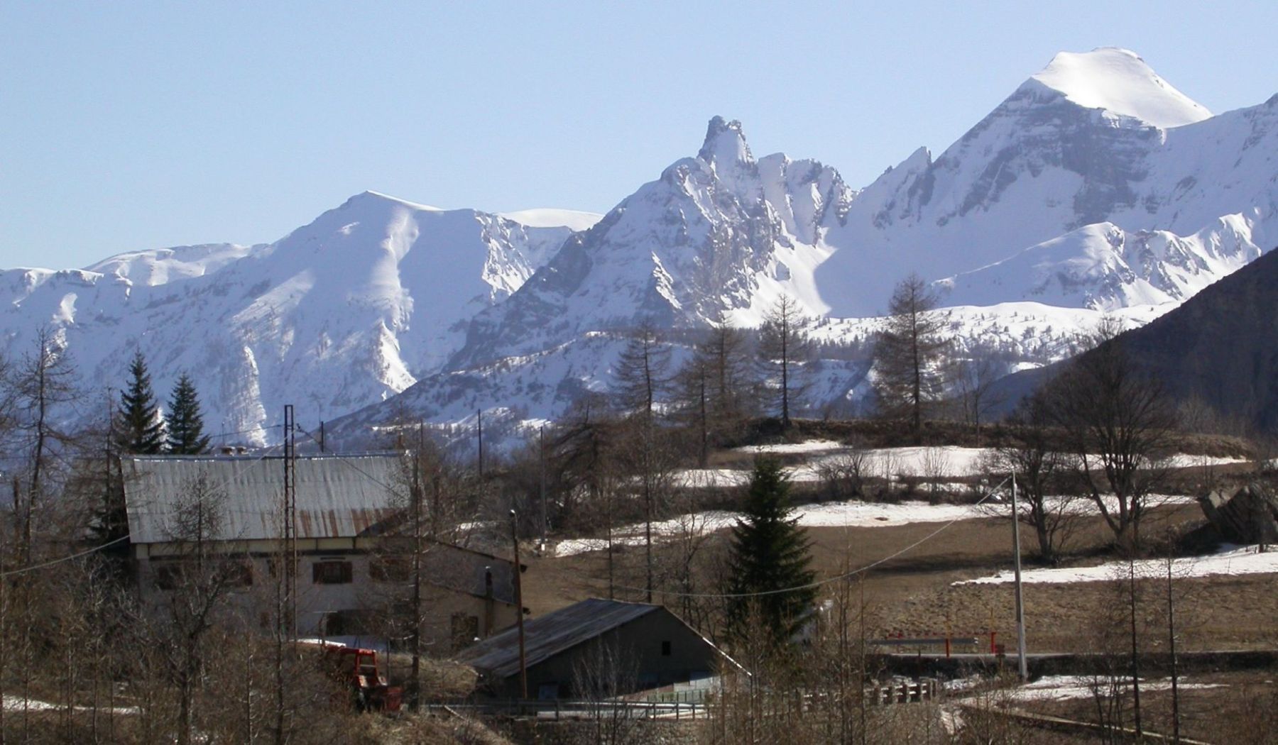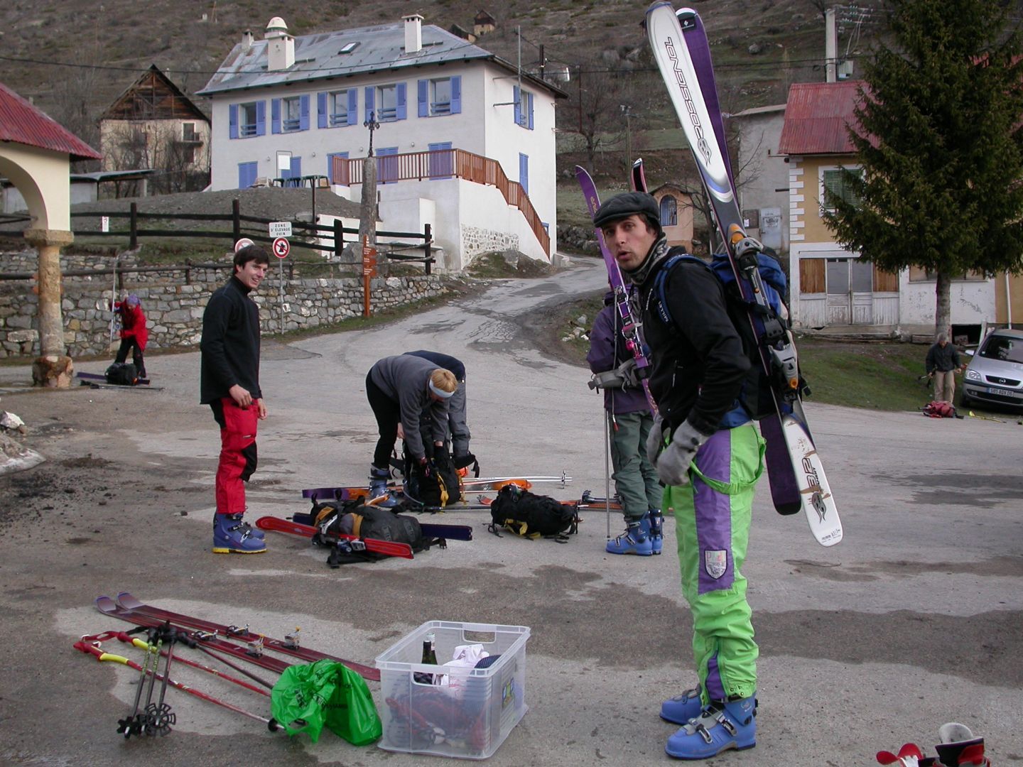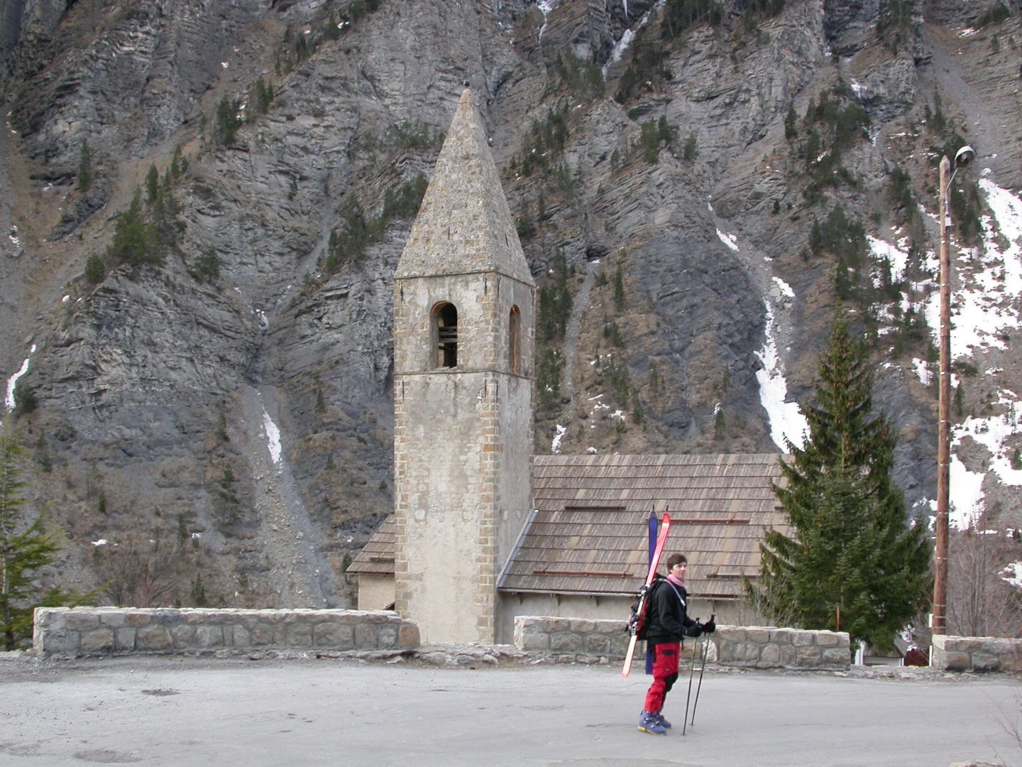 - Lundi : le col de la Roche Trouée (2583m) et la pointe de la Côte de l’Âne (2916m) depuis St Dalmas de Selvage (1500m). Remontée du vallon de Gialorgues jusqu’au refuge du même nom, puis col de la Roche Trouée. Dénivelé de montée : 1100m. Descente en face nord par une belle pente raide en neige dure… pour rejoindre le haut du vallon de Sanguinière. Pause « casse-croute » : il est midi !!!!!! Une fois rassasiés, ascension par un vent d’une rare violence de la face ouest de la pointe de la Côte de l’Âne qui s’atteint par une fine et aérienne arête de neige suivie d’une escalade débonnaire de la pyramide rocheuse sommitale. Dénivelé total de montée : 1500m. Descente sur le vallon de Sanguinière pour rejoindre le hameau d’Estenc (1778m) au cadre enchanteur. Etape au relais hôtel de la Cayolle chez Axelle.