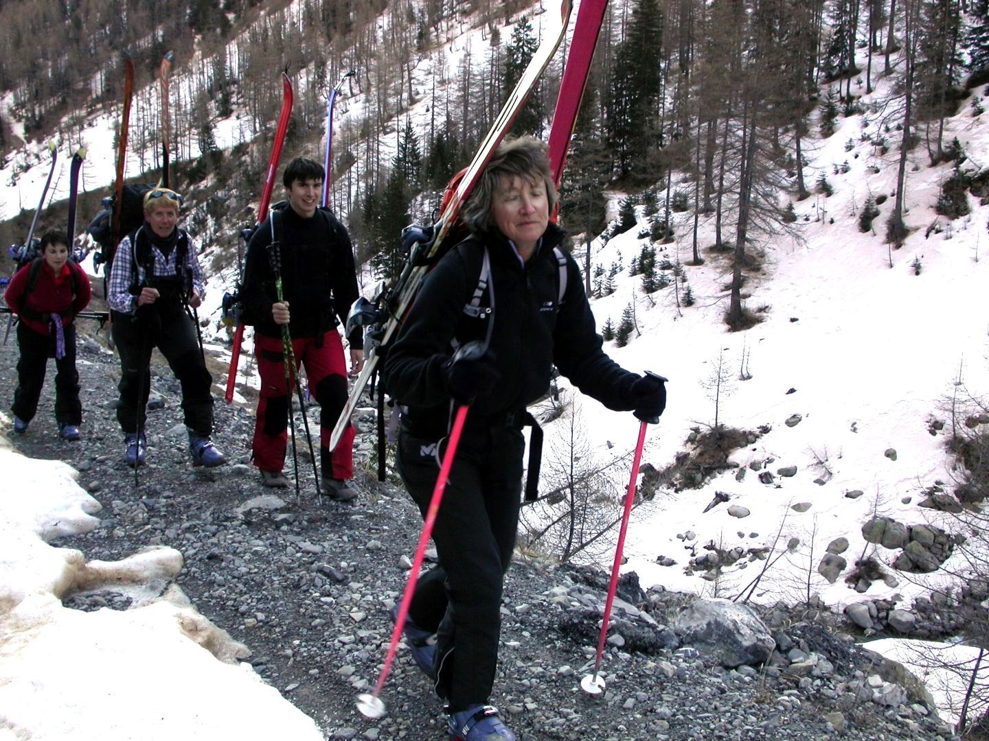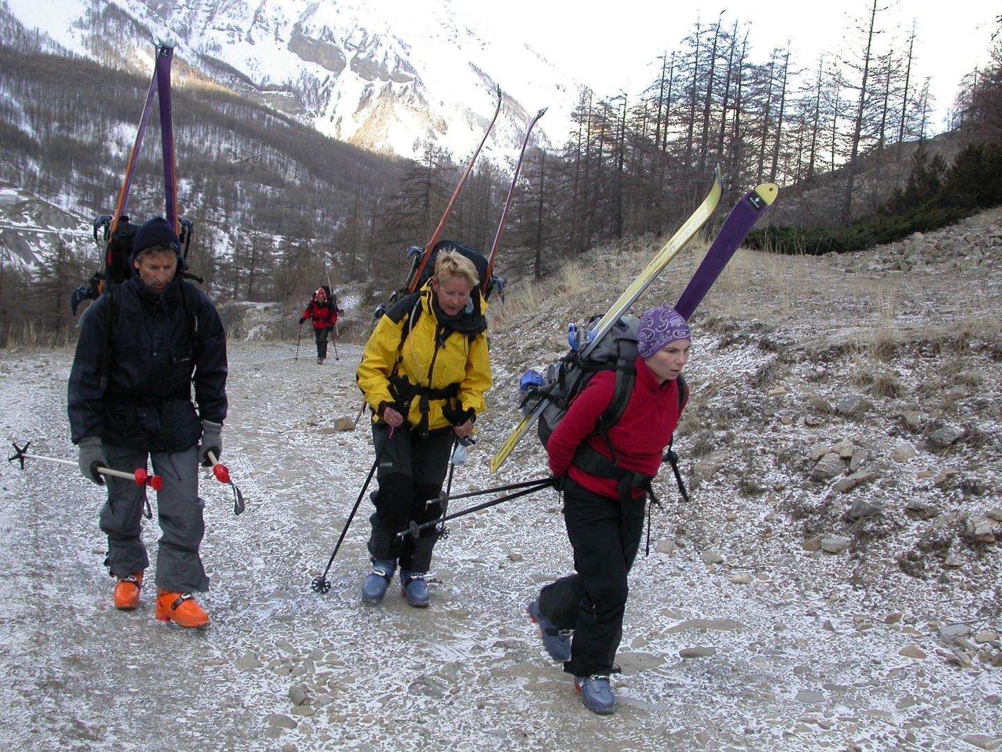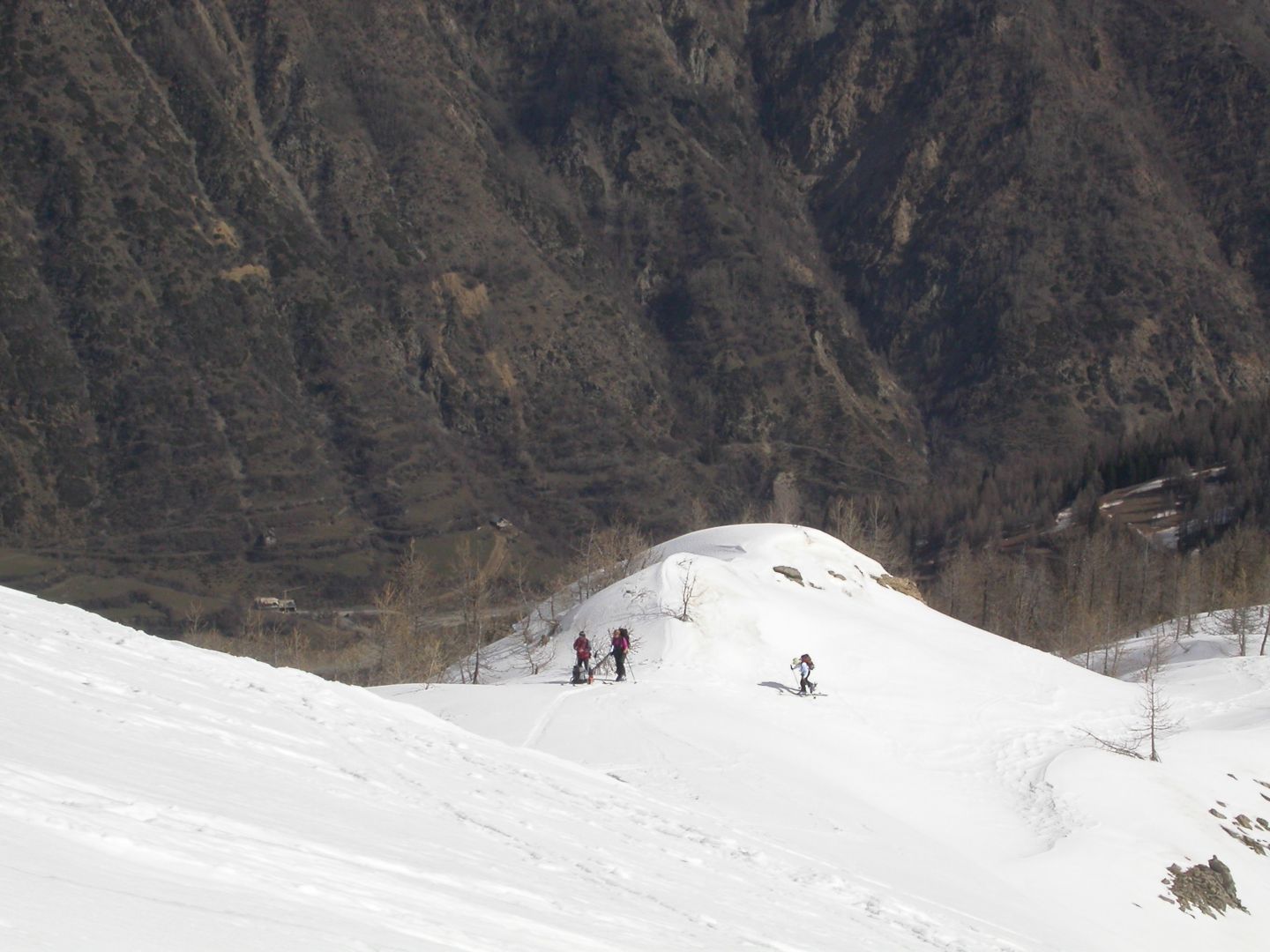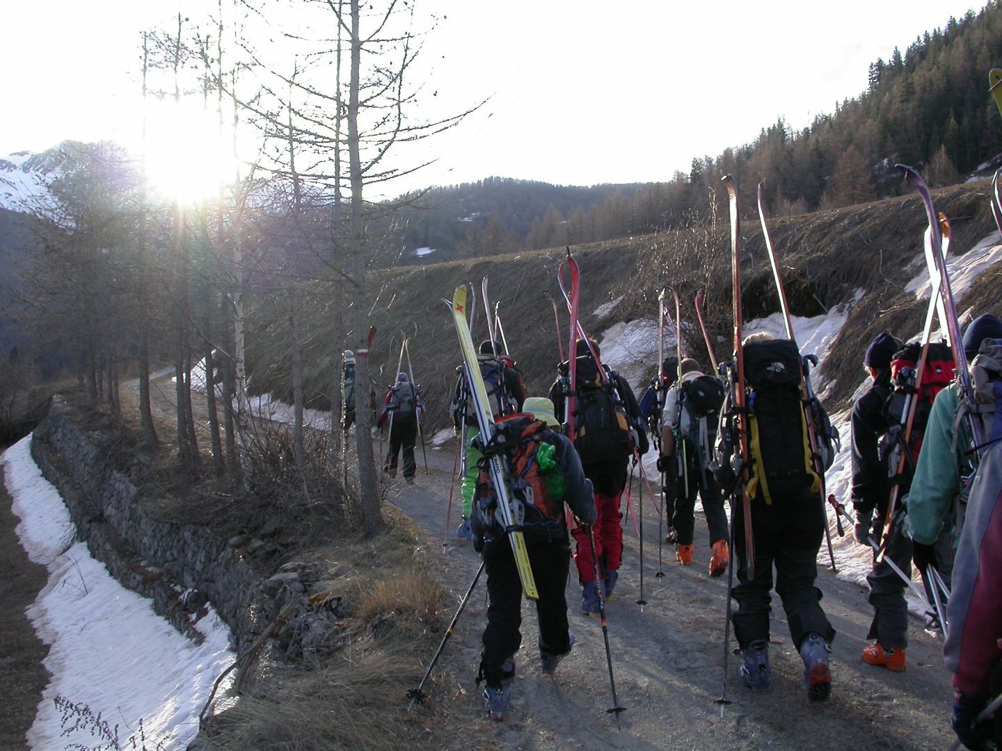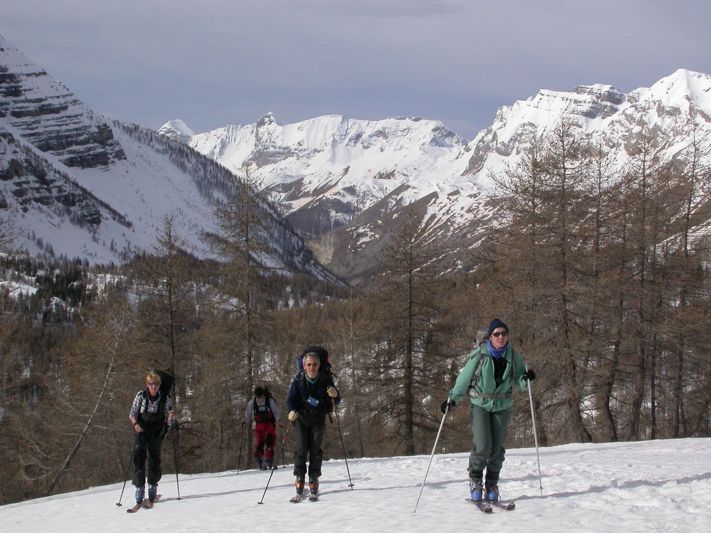 - Lundi : le col de la Roche Trouée (2583m) et la pointe de la Côte de l’Âne (2916m) depuis St Dalmas de Selvage (1500m). Remontée du vallon de Gialorgues jusqu’au refuge du même nom, puis col de la Roche Trouée. Dénivelé de montée : 1100m. Descente en face nord par une belle pente raide en neige dure… pour rejoindre le haut du vallon de Sanguinière. Pause « casse-croute » : il est midi !!!!!! Une fois rassasiés, ascension par un vent d’une rare violence de la face ouest de la pointe de la Côte de l’Âne qui s’atteint par une fine et aérienne arête de neige suivie d’une escalade débonnaire de la pyramide rocheuse sommitale. Dénivelé total de montée : 1500m. Descente sur le vallon de Sanguinière pour rejoindre le hameau d’Estenc (1778m) au cadre enchanteur. Etape au relais hôtel de la Cayolle chez Axelle.