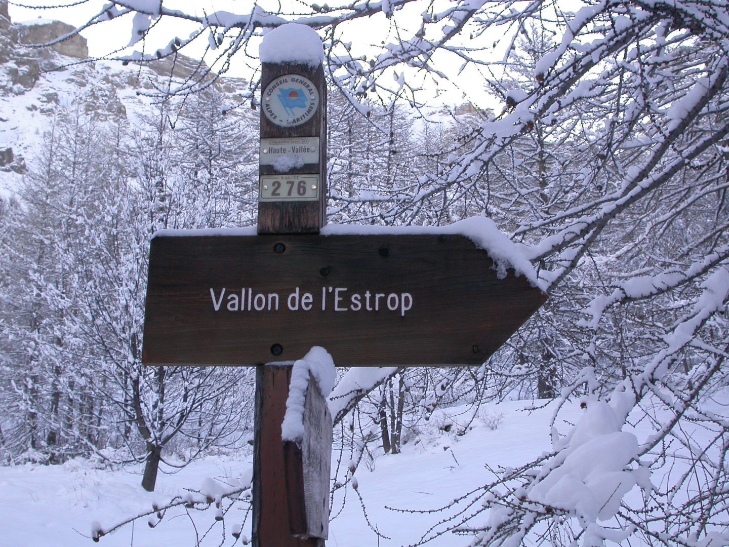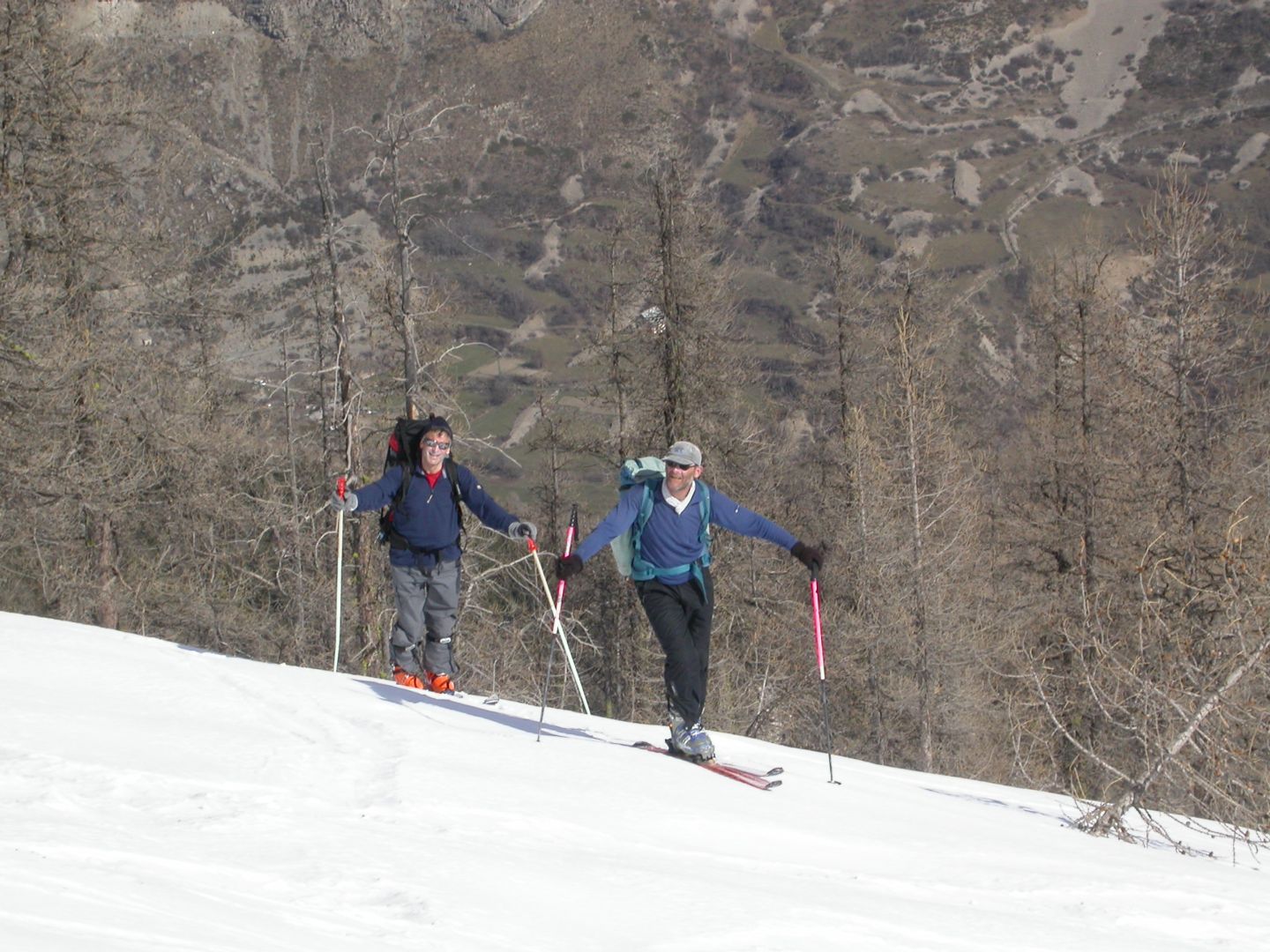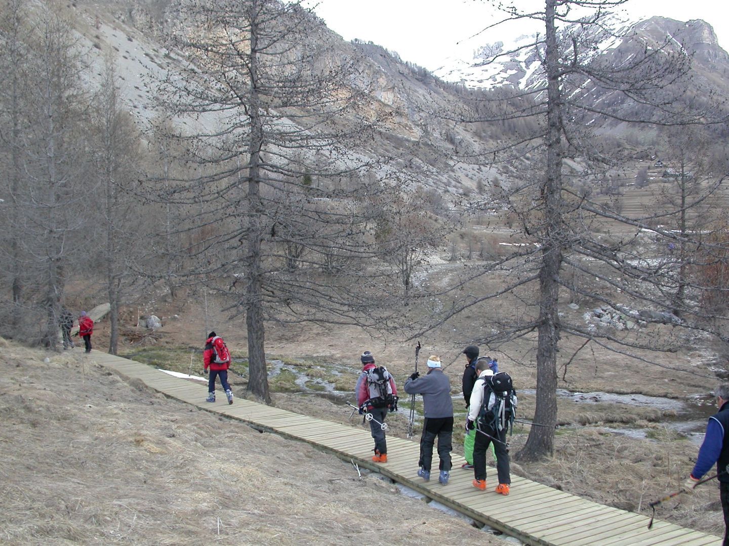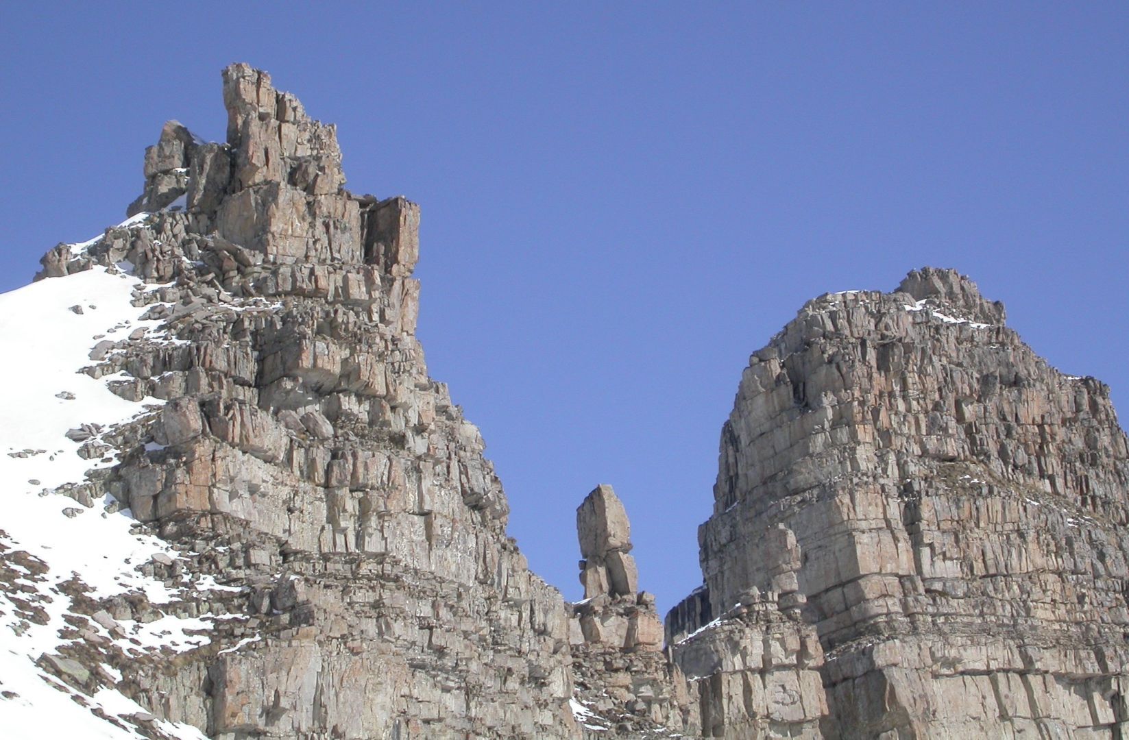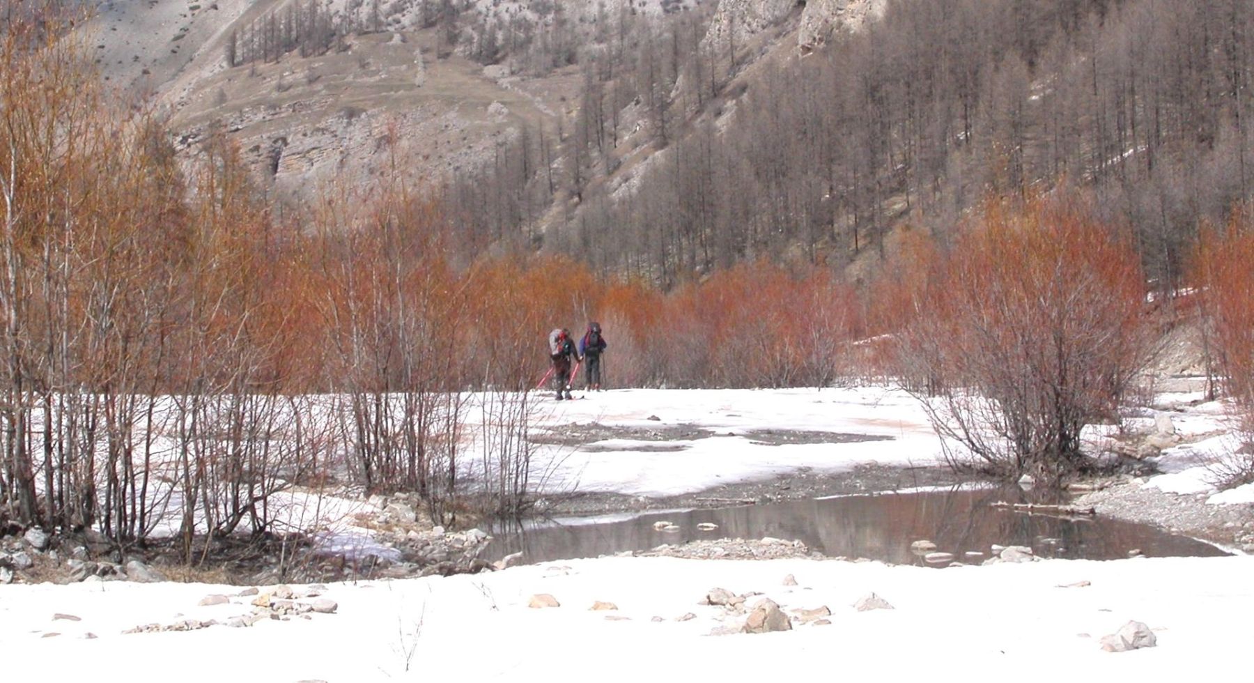 - Lundi : le col de la Roche Trouée (2583m) et la pointe de la Côte de l’Âne (2916m) depuis St Dalmas de Selvage (1500m). Remontée du vallon de Gialorgues jusqu’au refuge du même nom, puis col de la Roche Trouée. Dénivelé de montée : 1100m. Descente en face nord par une belle pente raide en neige dure… pour rejoindre le haut du vallon de Sanguinière. Pause « casse-croute » : il est midi !!!!!! Une fois rassasiés, ascension par un vent d’une rare violence de la face ouest de la pointe de la Côte de l’Âne qui s’atteint par une fine et aérienne arête de neige suivie d’une escalade débonnaire de la pyramide rocheuse sommitale. Dénivelé total de montée : 1500m. Descente sur le vallon de Sanguinière pour rejoindre le hameau d’Estenc (1778m) au cadre enchanteur. Etape au relais hôtel de la Cayolle chez Axelle.