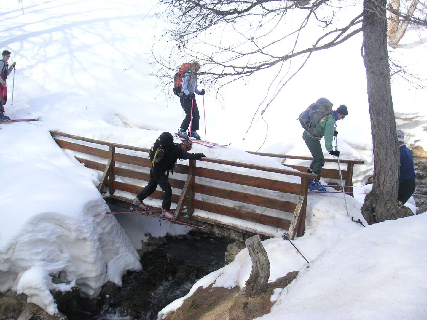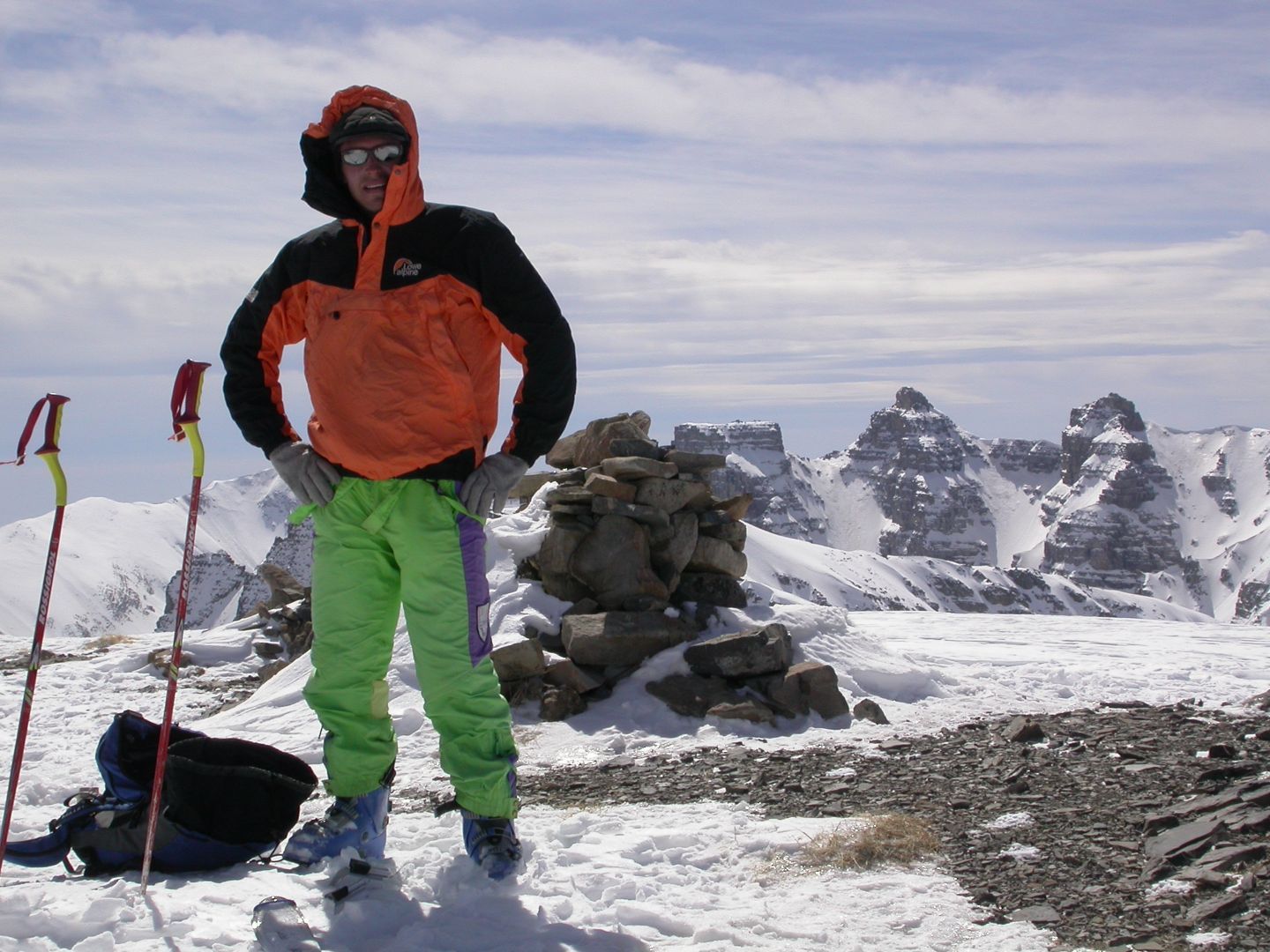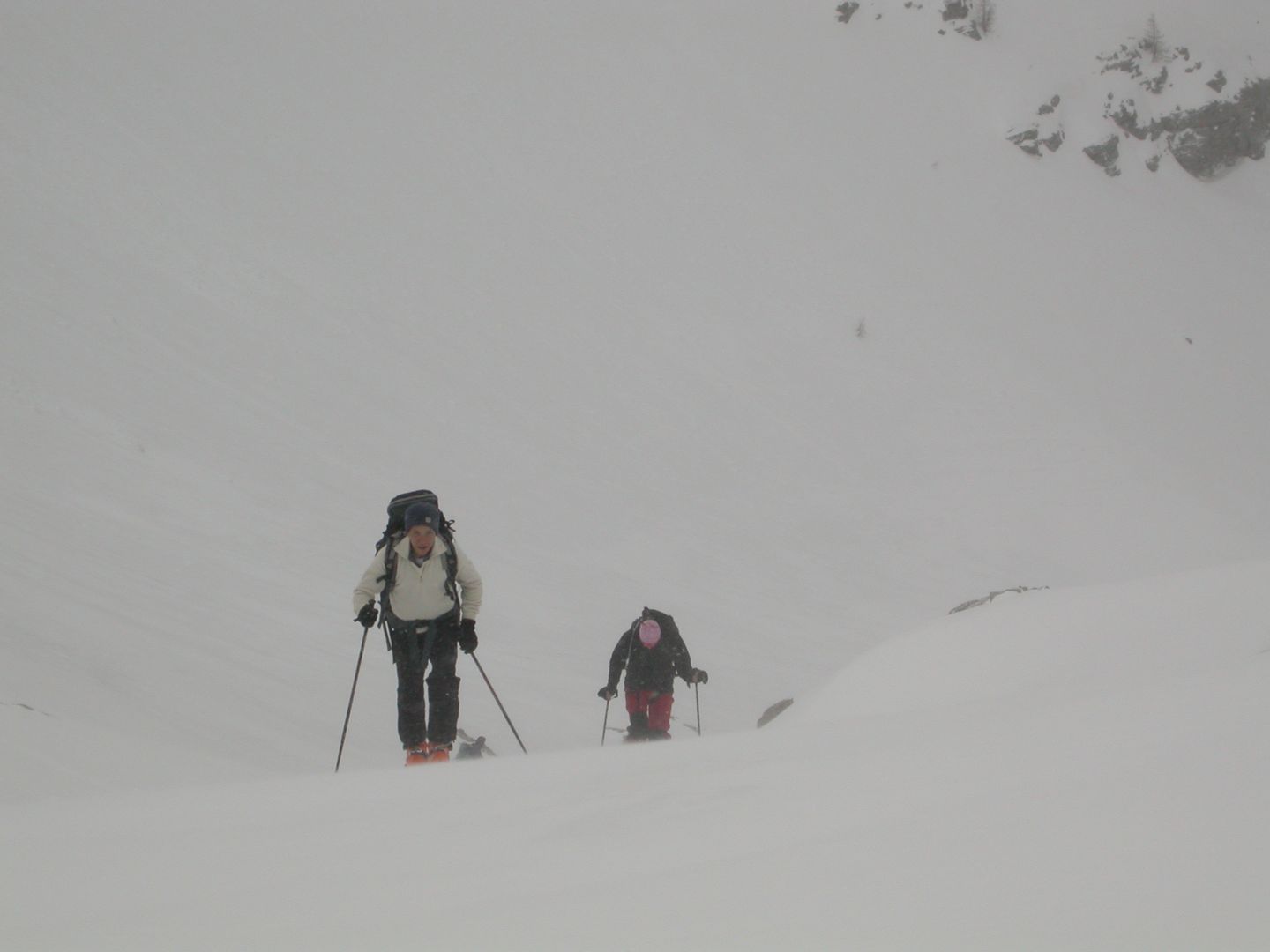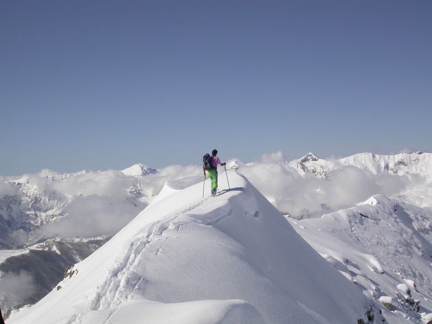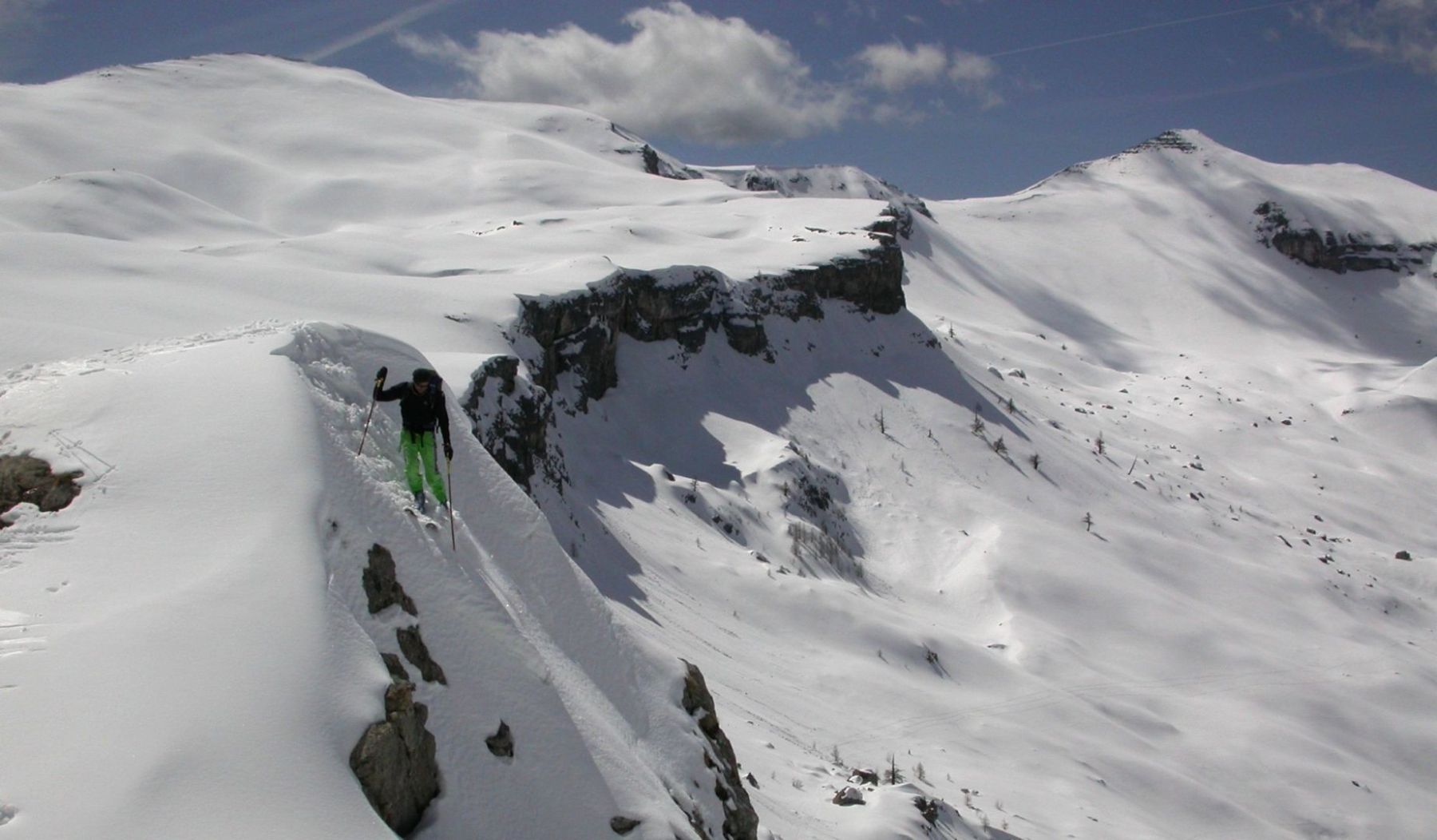 - Lundi : le col de la Roche Trouée (2583m) et la pointe de la Côte de l’Âne (2916m) depuis St Dalmas de Selvage (1500m). Remontée du vallon de Gialorgues jusqu’au refuge du même nom, puis col de la Roche Trouée. Dénivelé de montée : 1100m. Descente en face nord par une belle pente raide en neige dure… pour rejoindre le haut du vallon de Sanguinière. Pause « casse-croute » : il est midi !!!!!! Une fois rassasiés, ascension par un vent d’une rare violence de la face ouest de la pointe de la Côte de l’Âne qui s’atteint par une fine et aérienne arête de neige suivie d’une escalade débonnaire de la pyramide rocheuse sommitale. Dénivelé total de montée : 1500m. Descente sur le vallon de Sanguinière pour rejoindre le hameau d’Estenc (1778m) au cadre enchanteur. Etape au relais hôtel de la Cayolle chez Axelle.