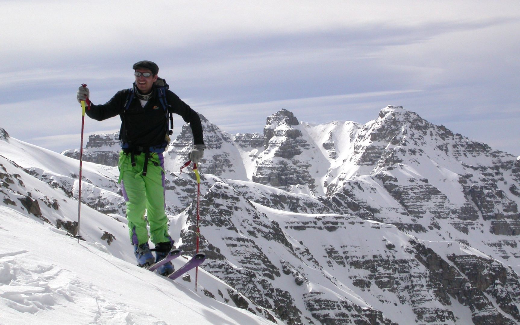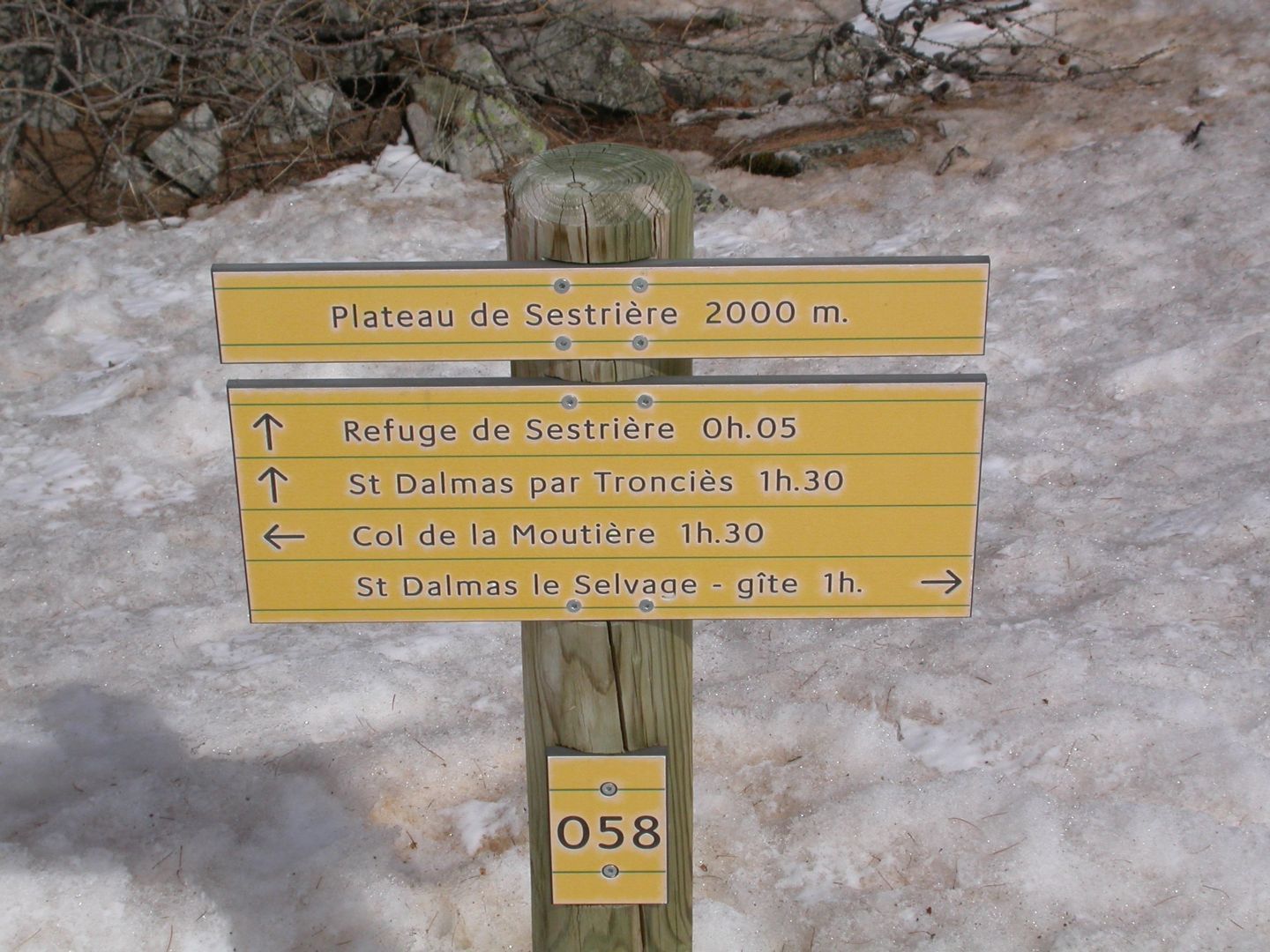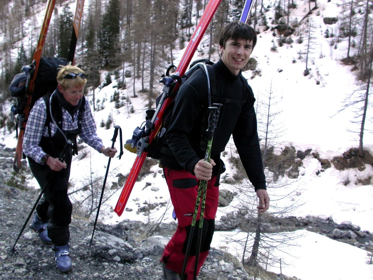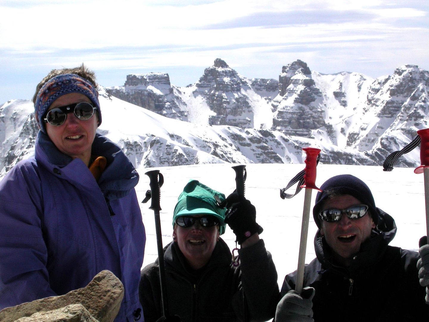 - Lundi : le col de la Roche Trouée (2583m) et la pointe de la Côte de l’Âne (2916m) depuis St Dalmas de Selvage (1500m). Remontée du vallon de Gialorgues jusqu’au refuge du même nom, puis col de la Roche Trouée. Dénivelé de montée : 1100m. Descente en face nord par une belle pente raide en neige dure… pour rejoindre le haut du vallon de Sanguinière. Pause « casse-croute » : il est midi !!!!!! Une fois rassasiés, ascension par un vent d’une rare violence de la face ouest de la pointe de la Côte de l’Âne qui s’atteint par une fine et aérienne arête de neige suivie d’une escalade débonnaire de la pyramide rocheuse sommitale. Dénivelé total de montée : 1500m. Descente sur le vallon de Sanguinière pour rejoindre le hameau d’Estenc (1778m) au cadre enchanteur. Etape au relais hôtel de la Cayolle chez Axelle.