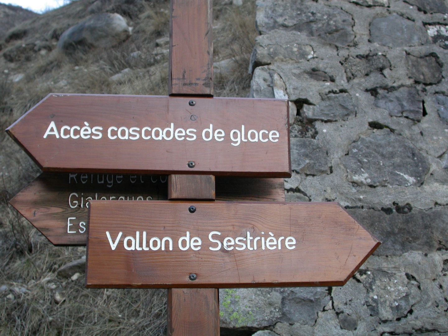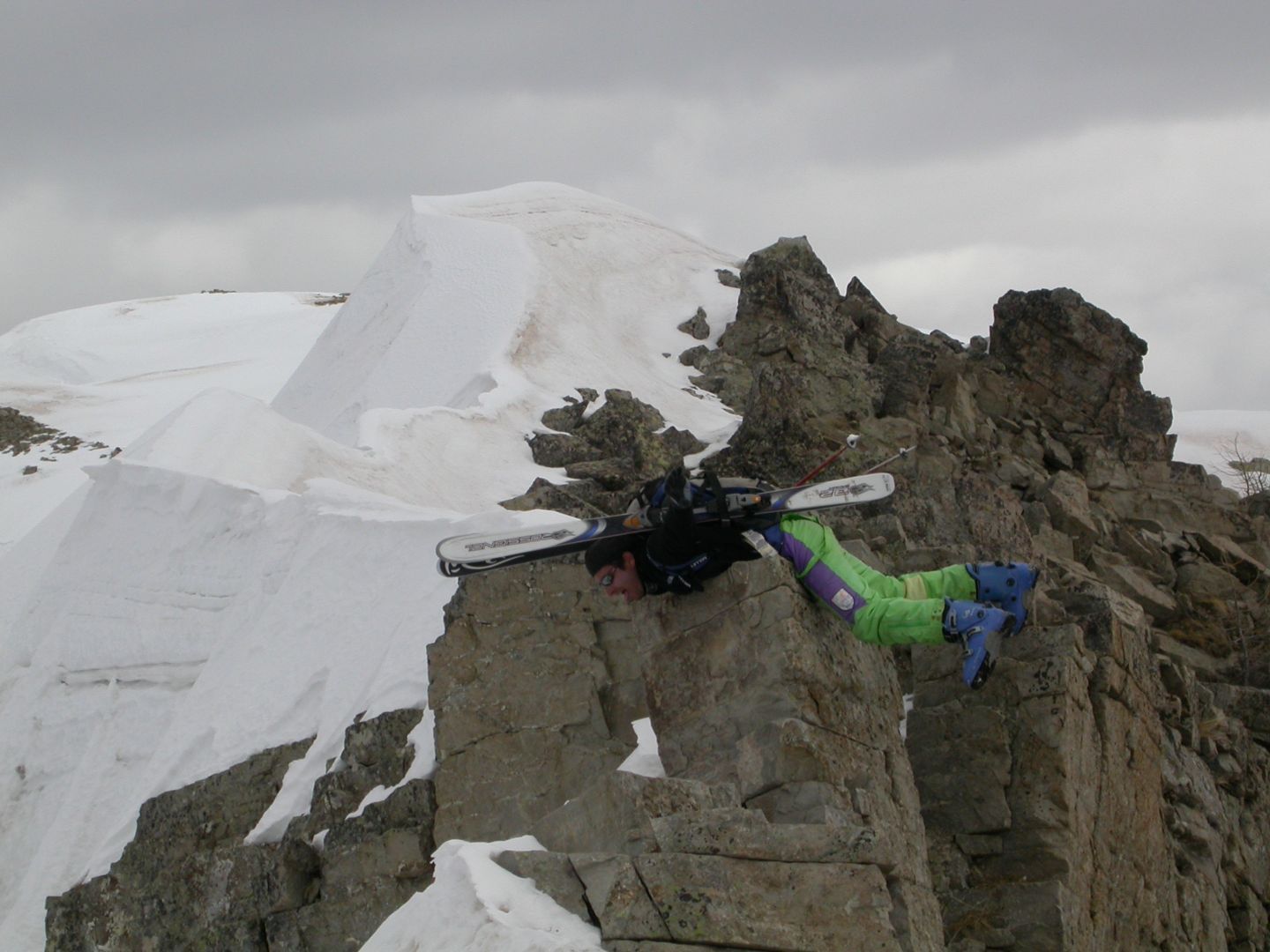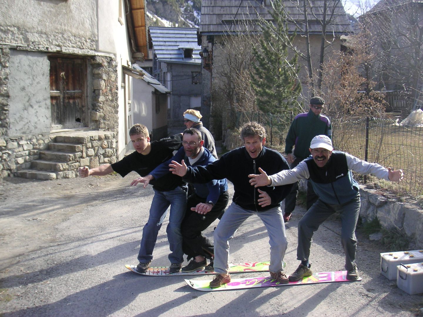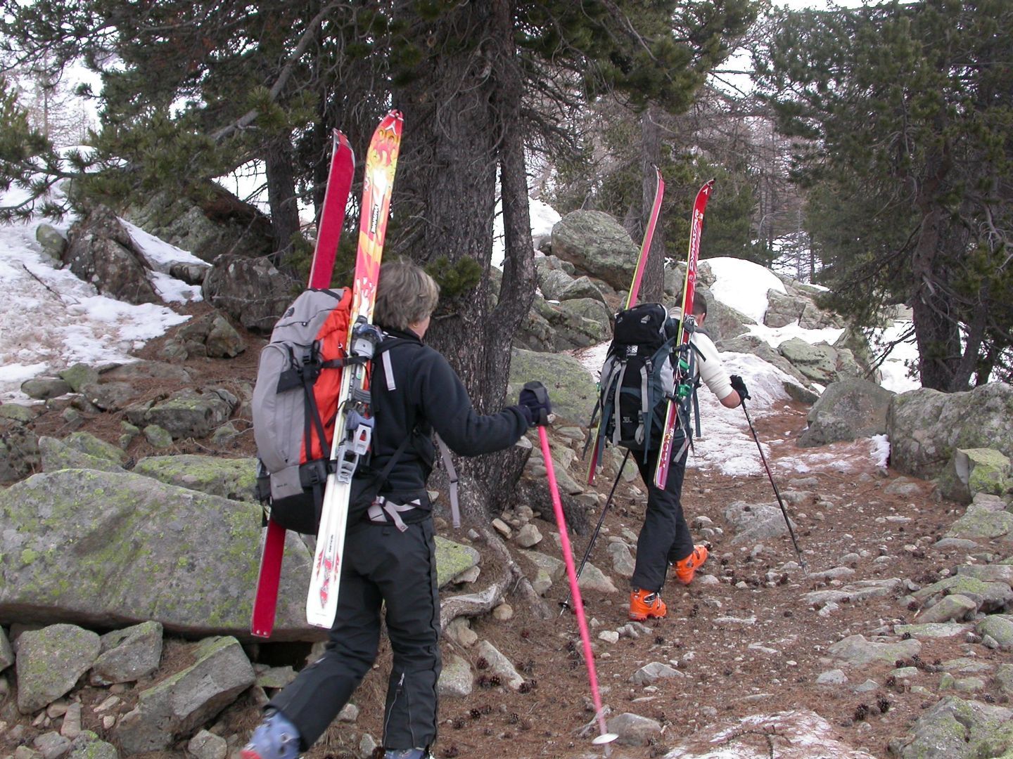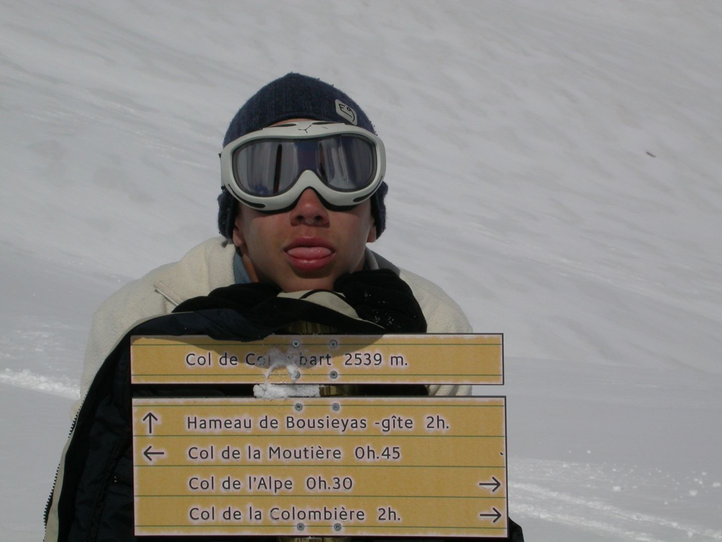 - Lundi : le col de la Roche Trouée (2583m) et la pointe de la Côte de l’Âne (2916m) depuis St Dalmas de Selvage (1500m). Remontée du vallon de Gialorgues jusqu’au refuge du même nom, puis col de la Roche Trouée. Dénivelé de montée : 1100m. Descente en face nord par une belle pente raide en neige dure… pour rejoindre le haut du vallon de Sanguinière. Pause « casse-croute » : il est midi !!!!!! Une fois rassasiés, ascension par un vent d’une rare violence de la face ouest de la pointe de la Côte de l’Âne qui s’atteint par une fine et aérienne arête de neige suivie d’une escalade débonnaire de la pyramide rocheuse sommitale. Dénivelé total de montée : 1500m. Descente sur le vallon de Sanguinière pour rejoindre le hameau d’Estenc (1778m) au cadre enchanteur. Etape au relais hôtel de la Cayolle chez Axelle.