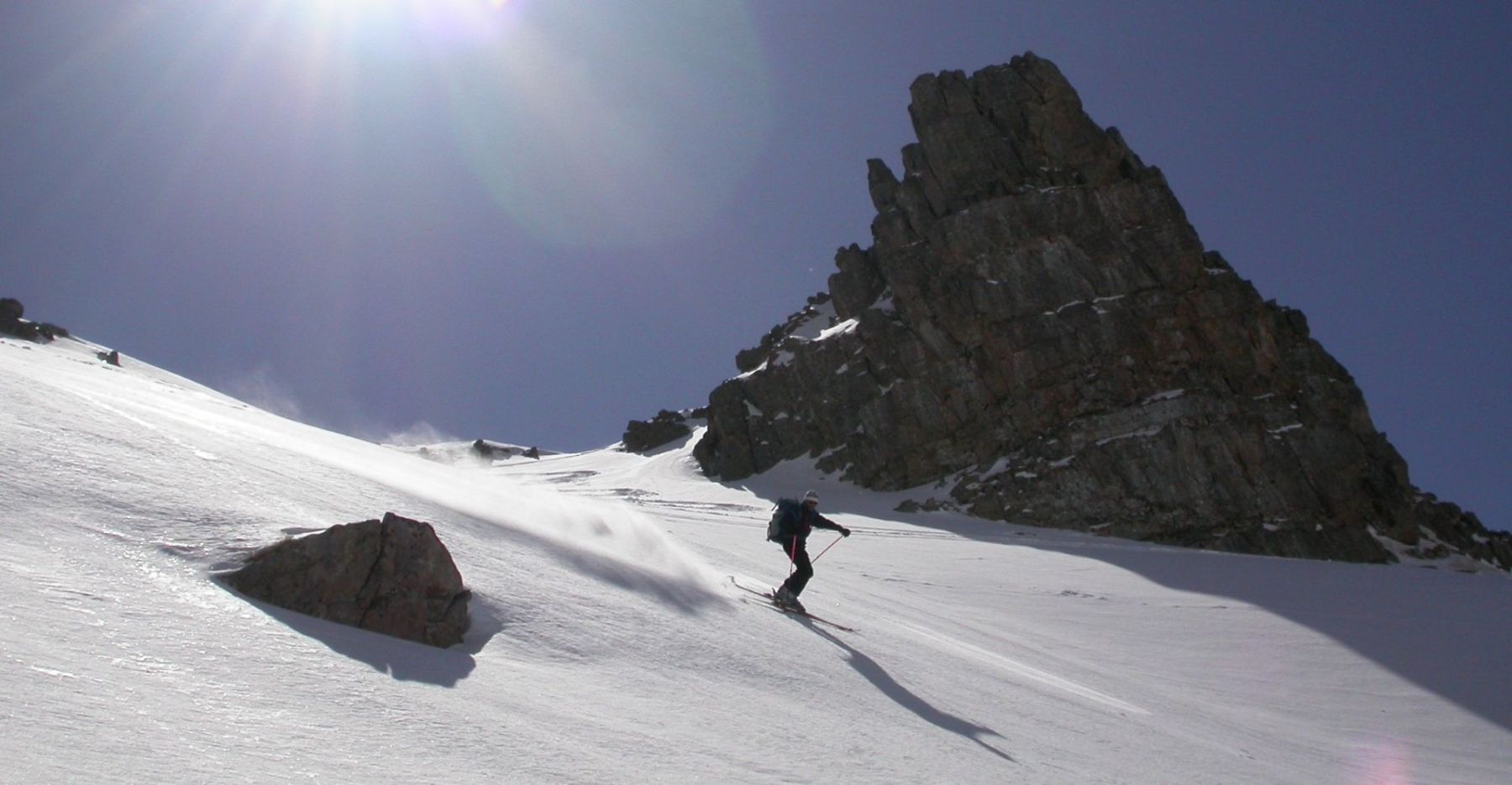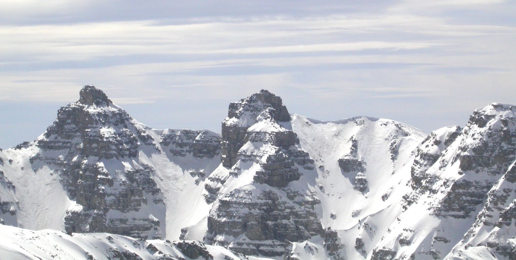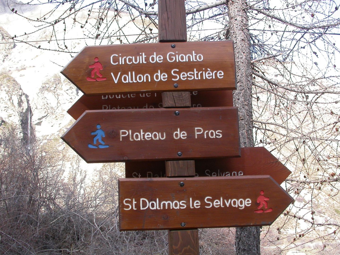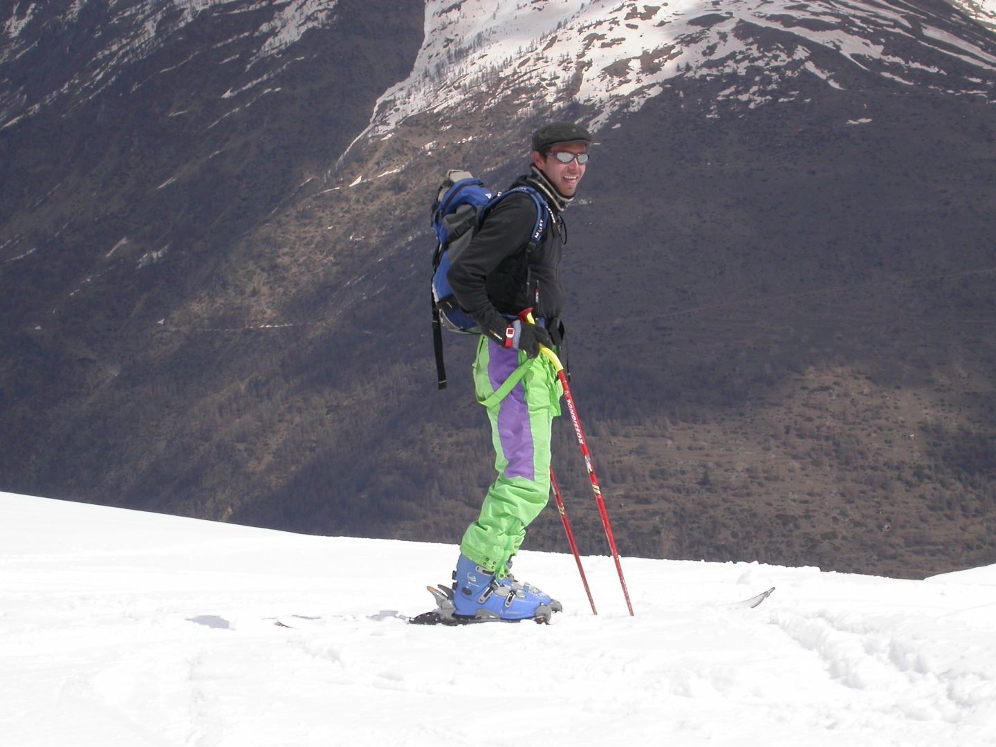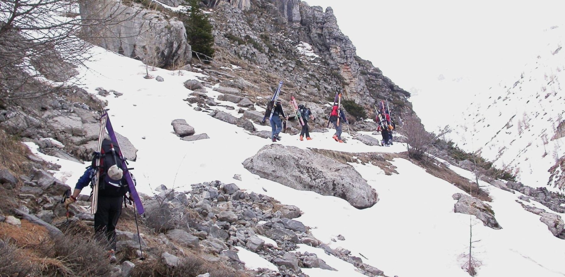 - Lundi : le col de la Roche Trouée (2583m) et la pointe de la Côte de l’Âne (2916m) depuis St Dalmas de Selvage (1500m). Remontée du vallon de Gialorgues jusqu’au refuge du même nom, puis col de la Roche Trouée. Dénivelé de montée : 1100m. Descente en face nord par une belle pente raide en neige dure… pour rejoindre le haut du vallon de Sanguinière. Pause « casse-croute » : il est midi !!!!!! Une fois rassasiés, ascension par un vent d’une rare violence de la face ouest de la pointe de la Côte de l’Âne qui s’atteint par une fine et aérienne arête de neige suivie d’une escalade débonnaire de la pyramide rocheuse sommitale. Dénivelé total de montée : 1500m. Descente sur le vallon de Sanguinière pour rejoindre le hameau d’Estenc (1778m) au cadre enchanteur. Etape au relais hôtel de la Cayolle chez Axelle.