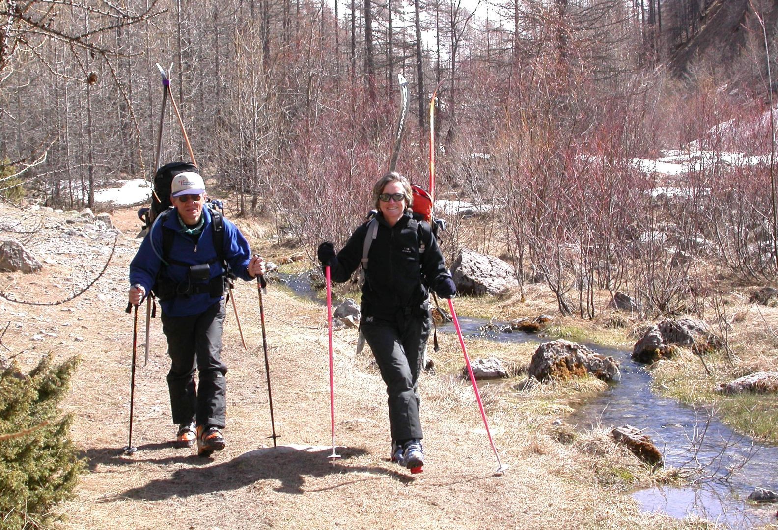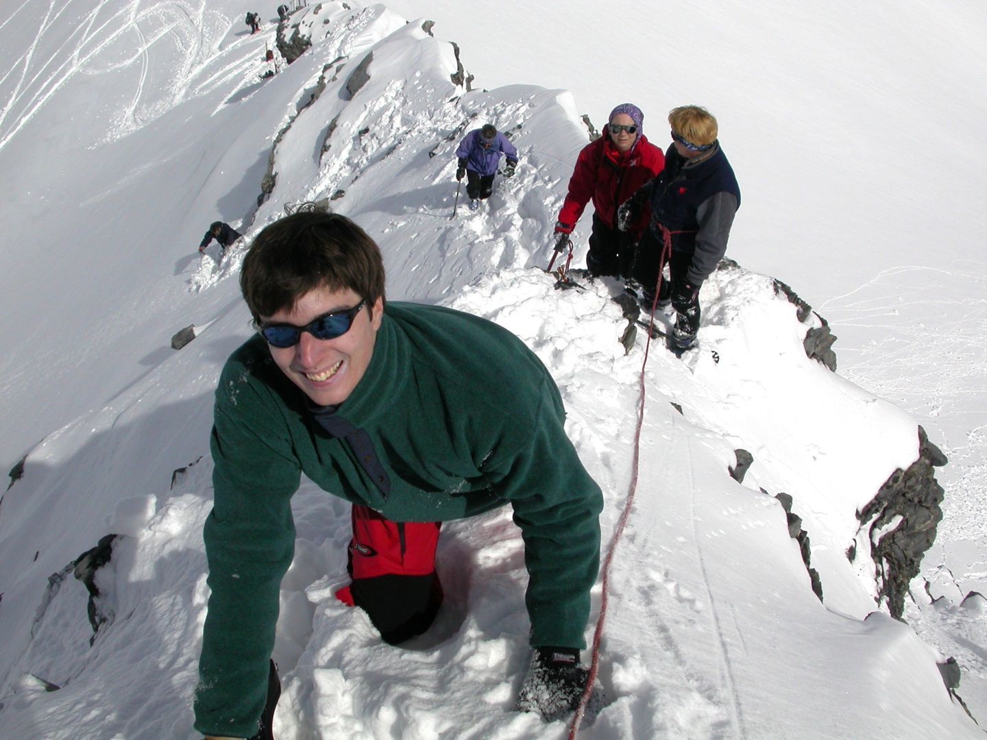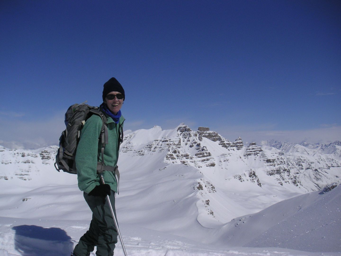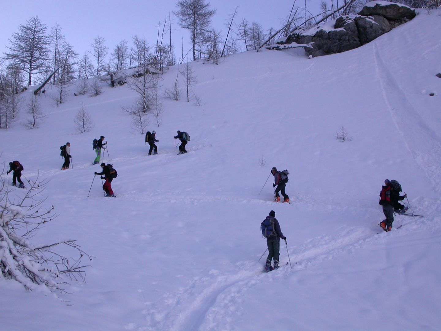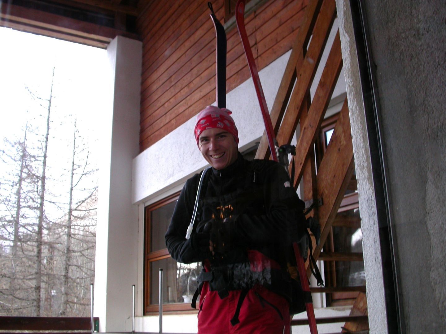 - Lundi : le col de la Roche Trouée (2583m) et la pointe de la Côte de l’Âne (2916m) depuis St Dalmas de Selvage (1500m). Remontée du vallon de Gialorgues jusqu’au refuge du même nom, puis col de la Roche Trouée. Dénivelé de montée : 1100m. Descente en face nord par une belle pente raide en neige dure… pour rejoindre le haut du vallon de Sanguinière. Pause « casse-croute » : il est midi !!!!!! Une fois rassasiés, ascension par un vent d’une rare violence de la face ouest de la pointe de la Côte de l’Âne qui s’atteint par une fine et aérienne arête de neige suivie d’une escalade débonnaire de la pyramide rocheuse sommitale. Dénivelé total de montée : 1500m. Descente sur le vallon de Sanguinière pour rejoindre le hameau d’Estenc (1778m) au cadre enchanteur. Etape au relais hôtel de la Cayolle chez Axelle.