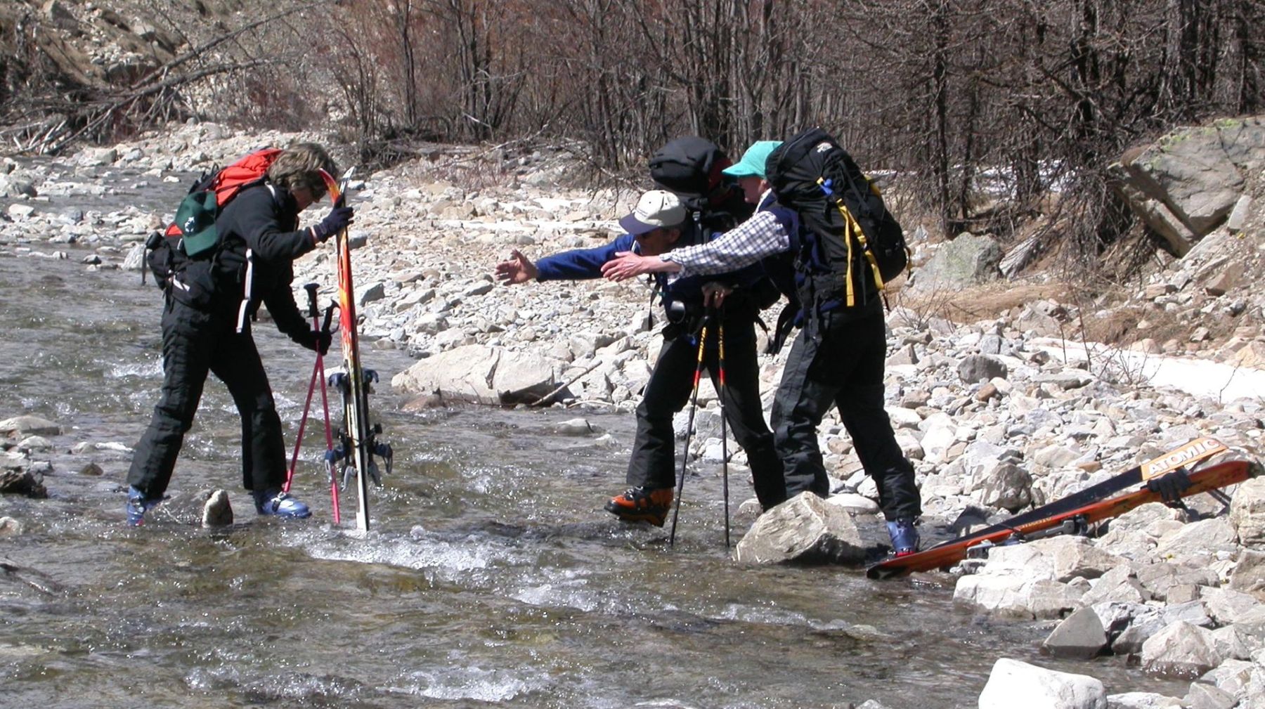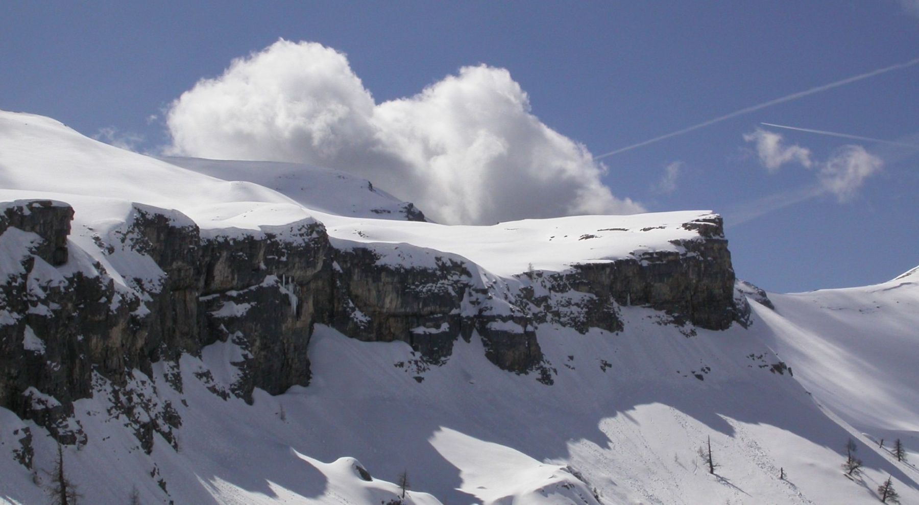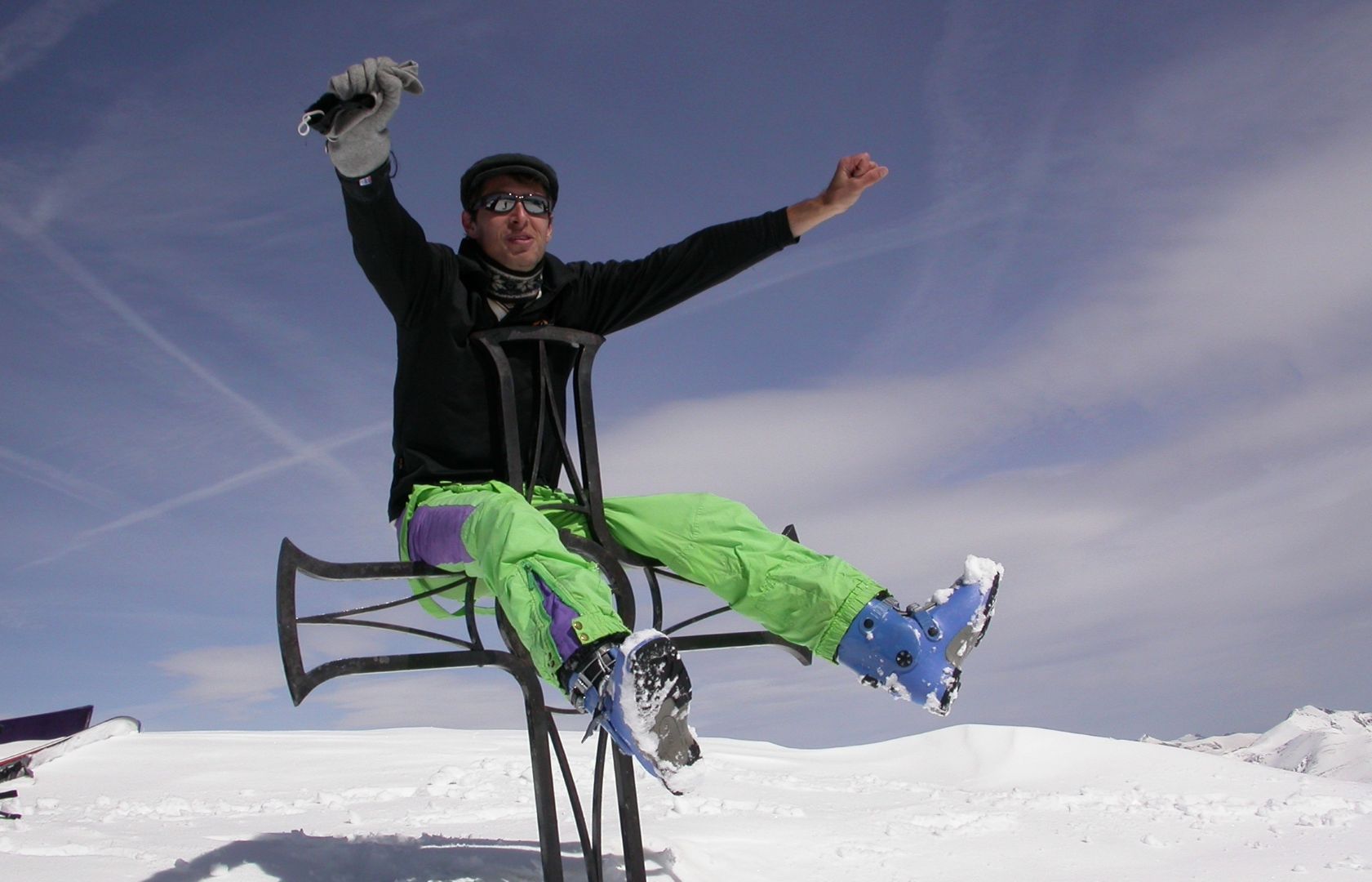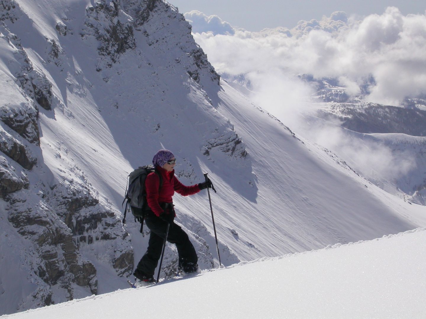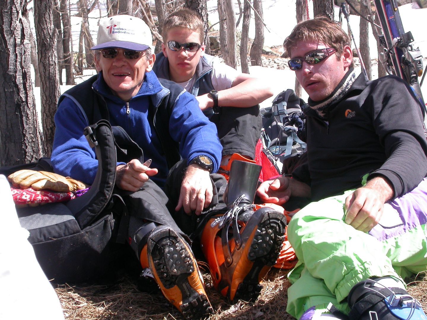 - Lundi : le col de la Roche Trouée (2583m) et la pointe de la Côte de l’Âne (2916m) depuis St Dalmas de Selvage (1500m). Remontée du vallon de Gialorgues jusqu’au refuge du même nom, puis col de la Roche Trouée. Dénivelé de montée : 1100m. Descente en face nord par une belle pente raide en neige dure… pour rejoindre le haut du vallon de Sanguinière. Pause « casse-croute » : il est midi !!!!!! Une fois rassasiés, ascension par un vent d’une rare violence de la face ouest de la pointe de la Côte de l’Âne qui s’atteint par une fine et aérienne arête de neige suivie d’une escalade débonnaire de la pyramide rocheuse sommitale. Dénivelé total de montée : 1500m. Descente sur le vallon de Sanguinière pour rejoindre le hameau d’Estenc (1778m) au cadre enchanteur. Etape au relais hôtel de la Cayolle chez Axelle.