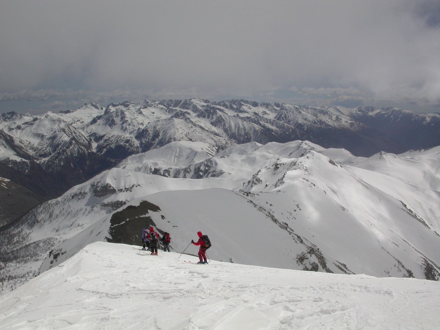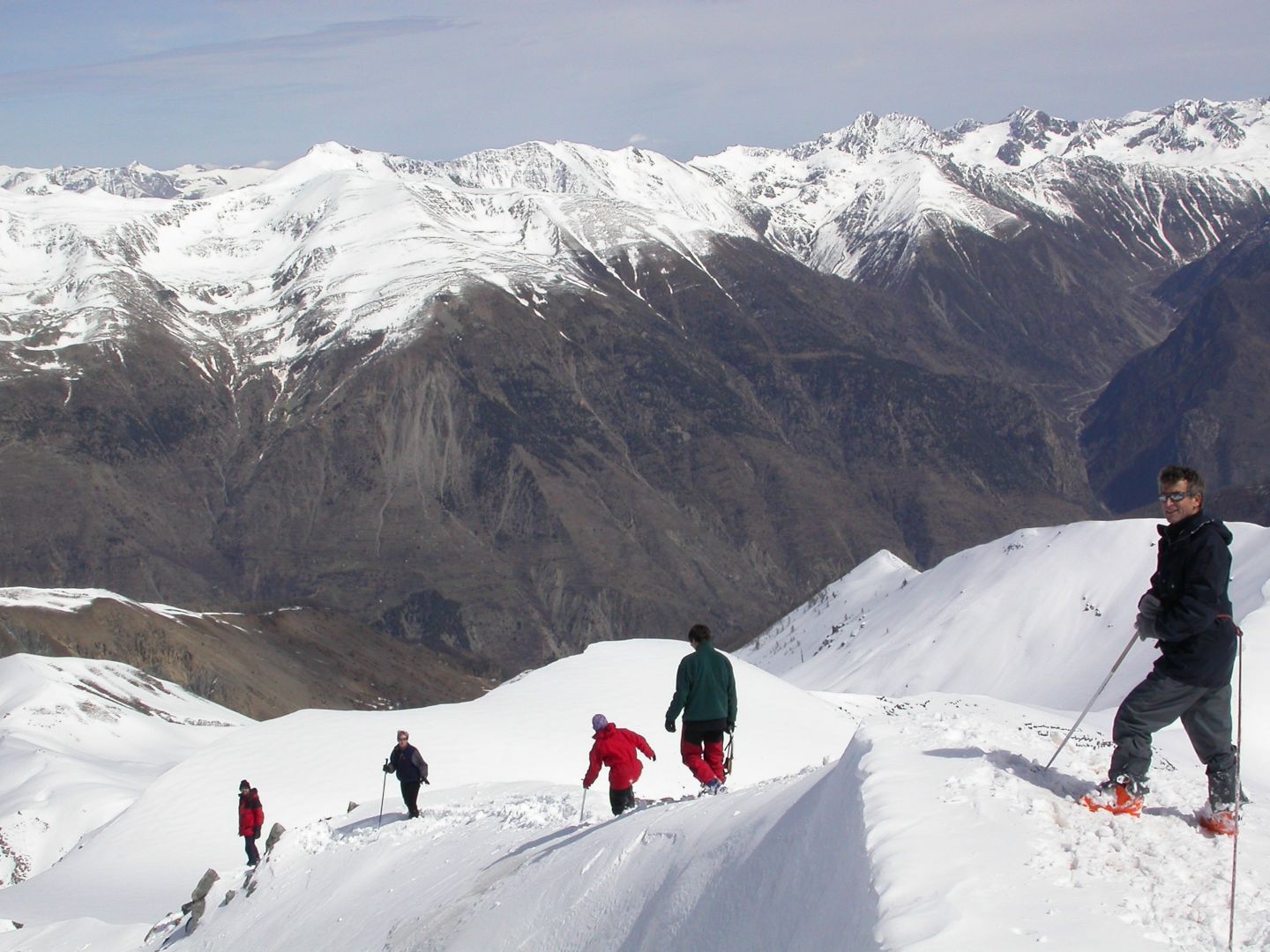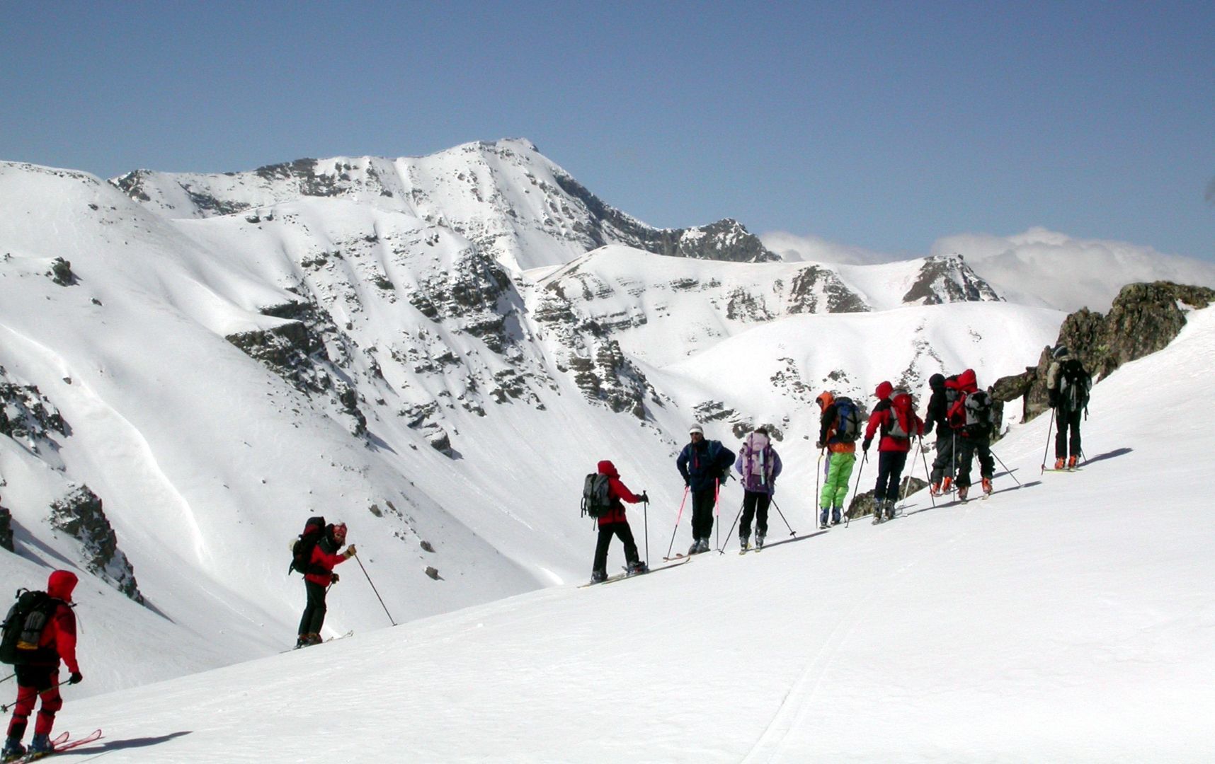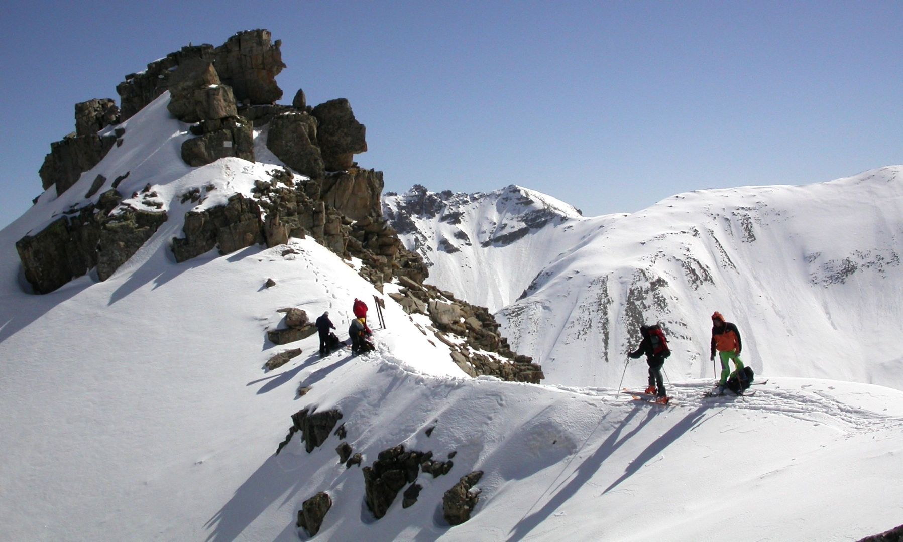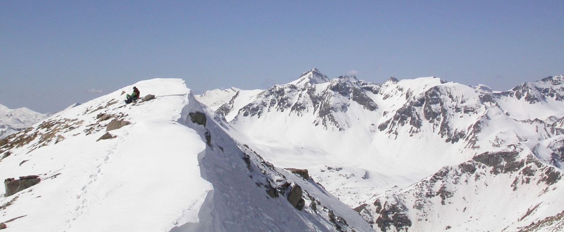 - Mardi : col du Colombier (2759m), Tête du Colombier (2789m) et Tête de Sanguinière (2856m). Remontée aux cabanes de Sanguinière (2049m), puis au col du Colombier par une pente large et bien raide. A gauche du col, montée à la tête du Colombier par une arête mixte facile. A droite du col, traversée par une belle arête de neige sur la tête de Sanguinière. Dénivelé : 1200m. Descente sur le col de la Braisse (2599m) puis le vallon de Sanguinière et le vallon du Bachelard jusqu’au gîte de Bayasse (1800m) chez Olivier.