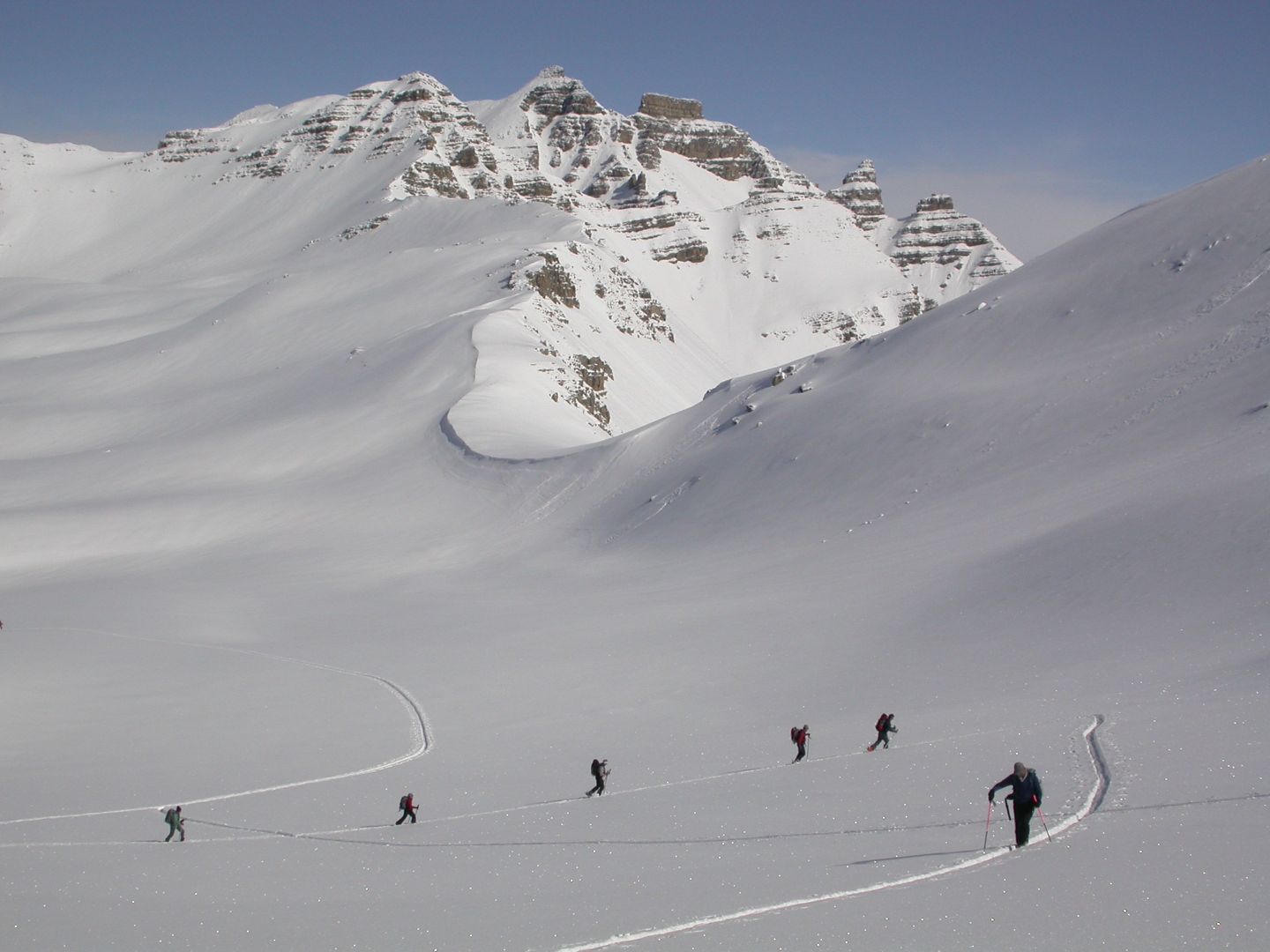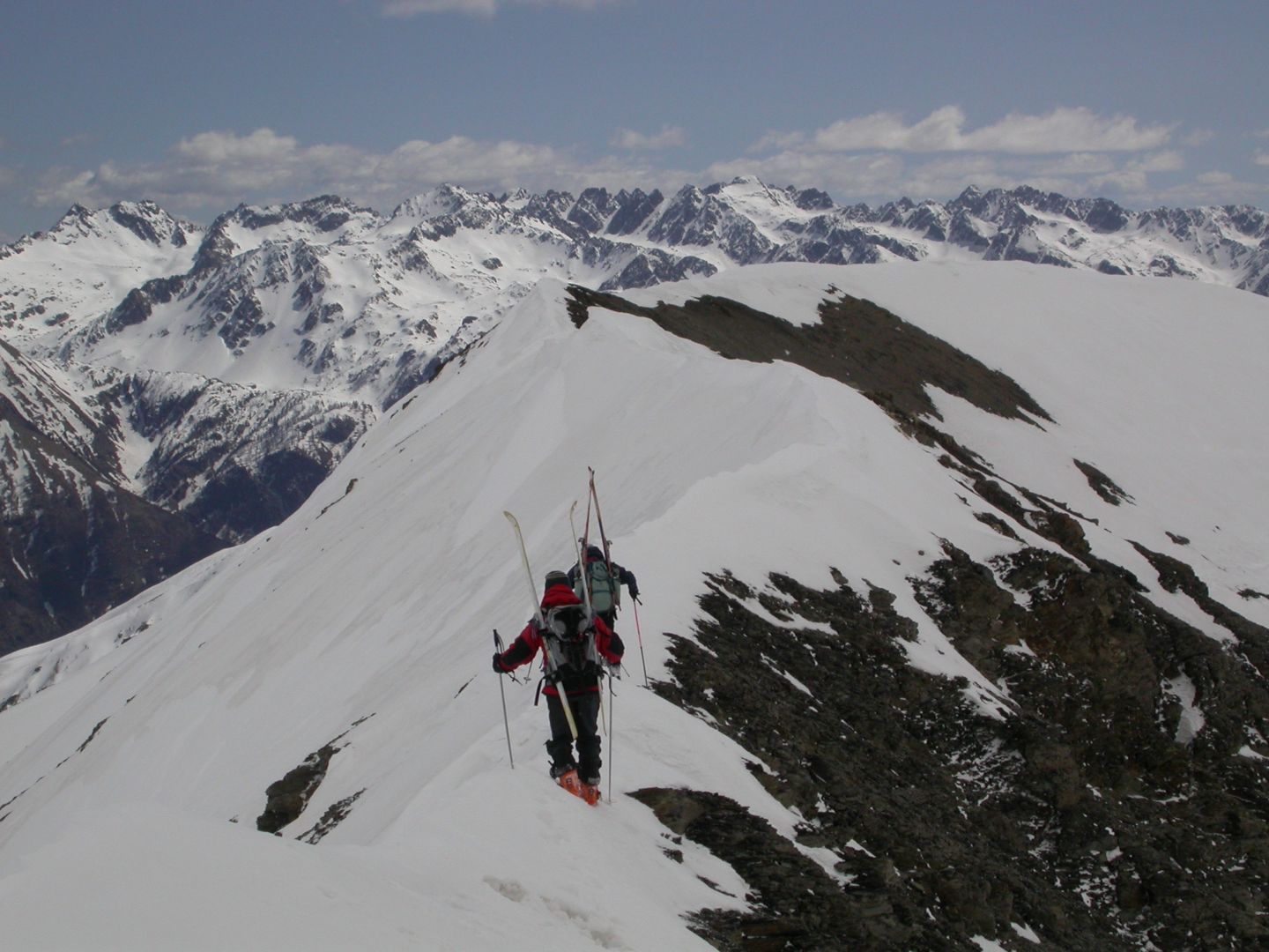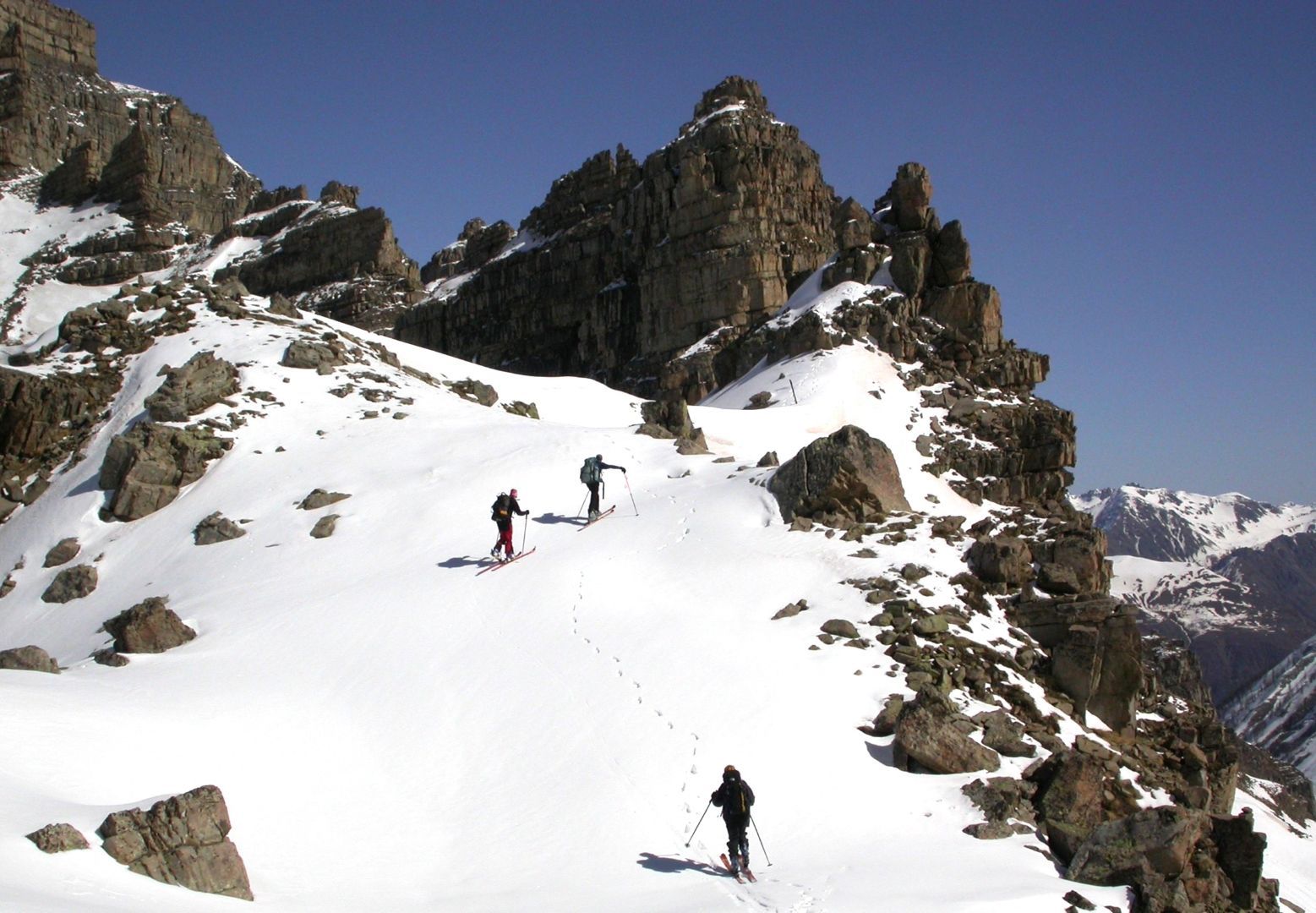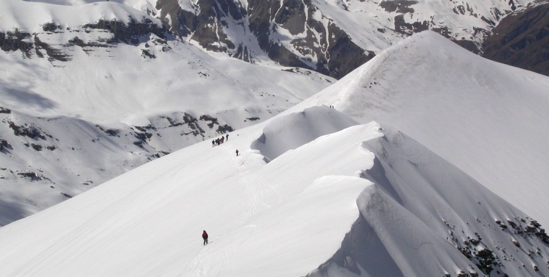 - Mardi : col du Colombier (2759m), Tête du Colombier (2789m) et Tête de Sanguinière (2856m). Remontée aux cabanes de Sanguinière (2049m), puis au col du Colombier par une pente large et bien raide. A gauche du col, montée à la tête du Colombier par une arête mixte facile. A droite du col, traversée par une belle arête de neige sur la tête de Sanguinière. Dénivelé : 1200m. Descente sur le col de la Braisse (2599m) puis le vallon de Sanguinière et le vallon du Bachelard jusqu’au gîte de Bayasse (1800m) chez Olivier.