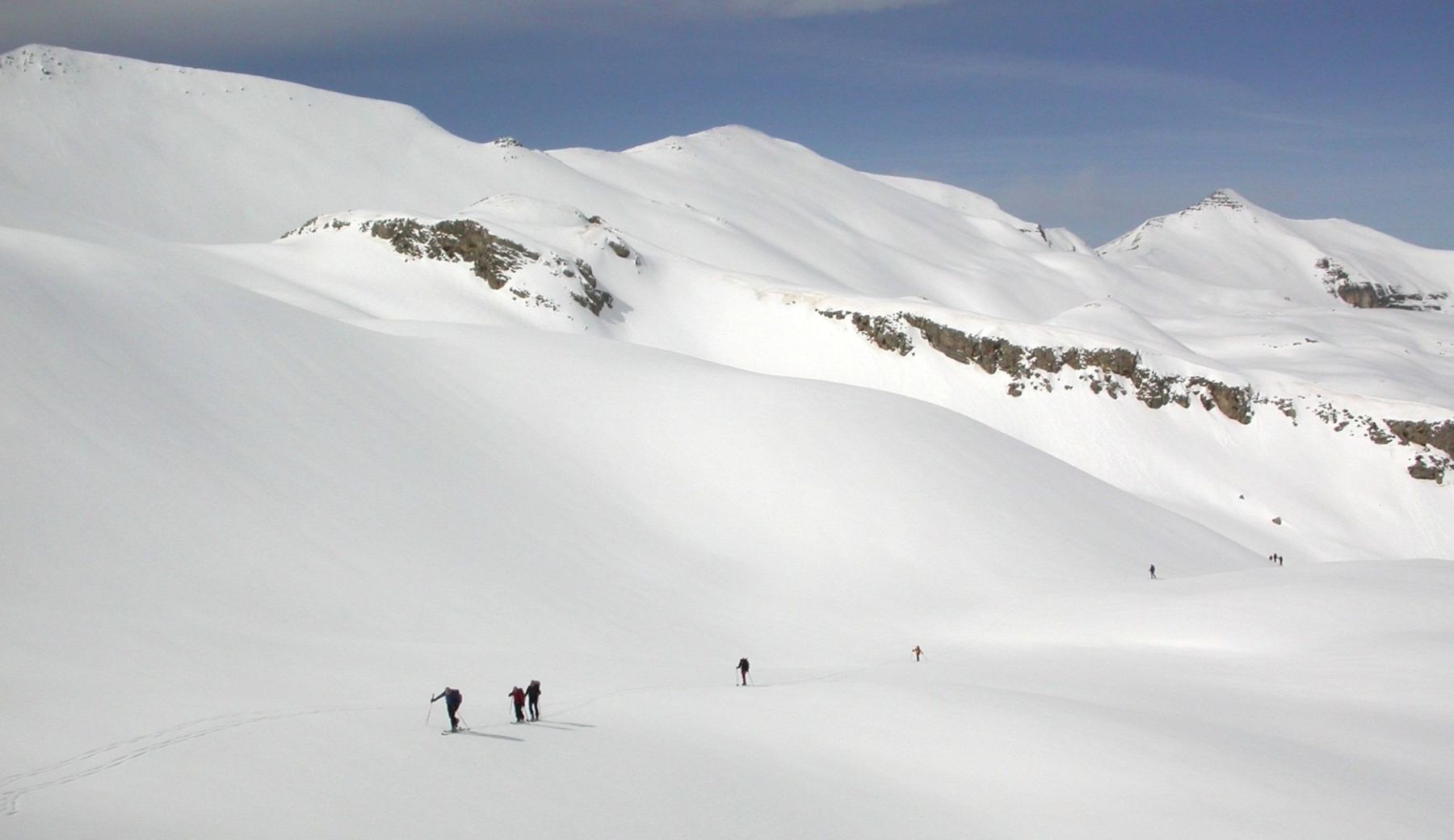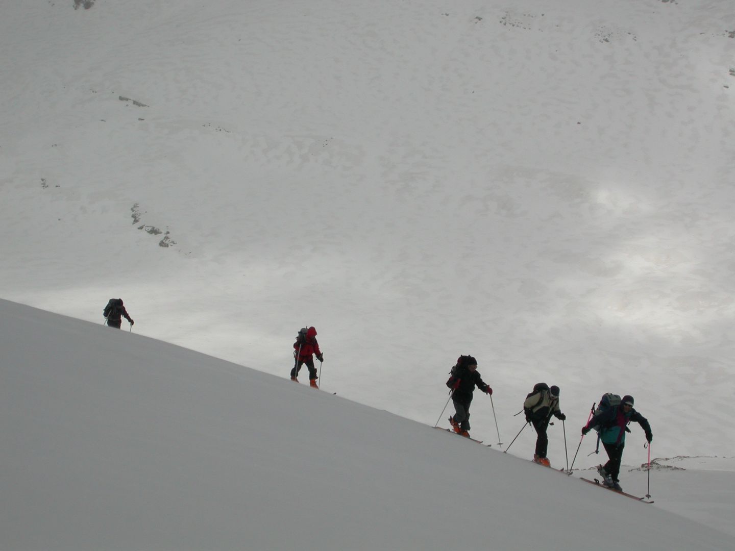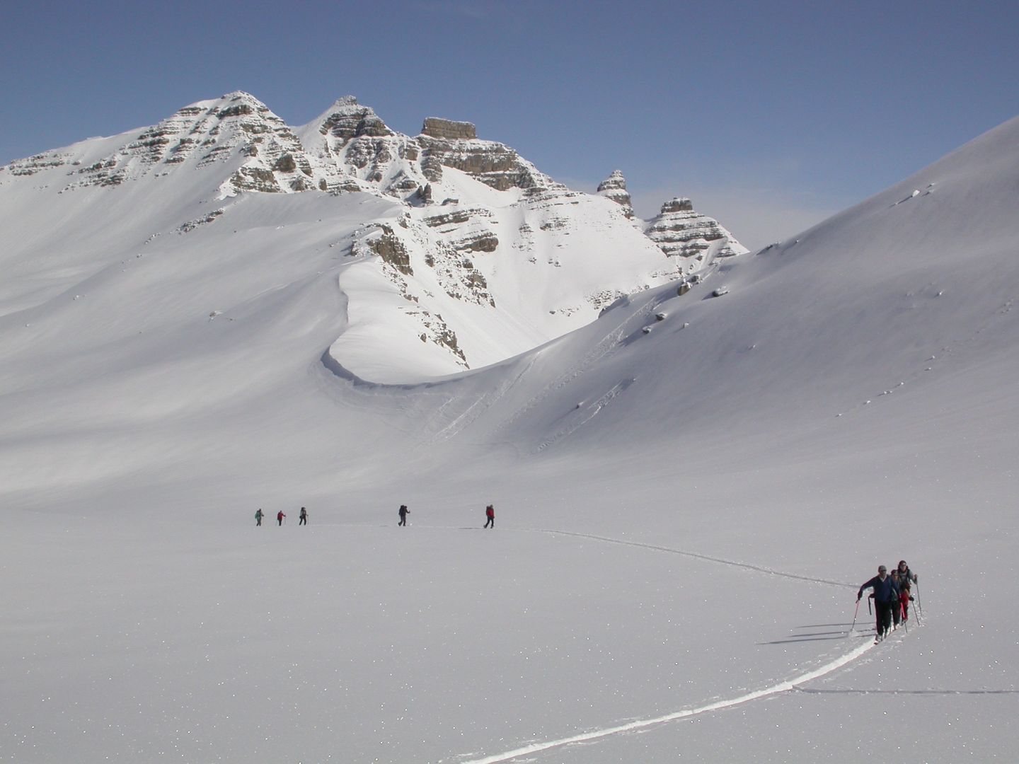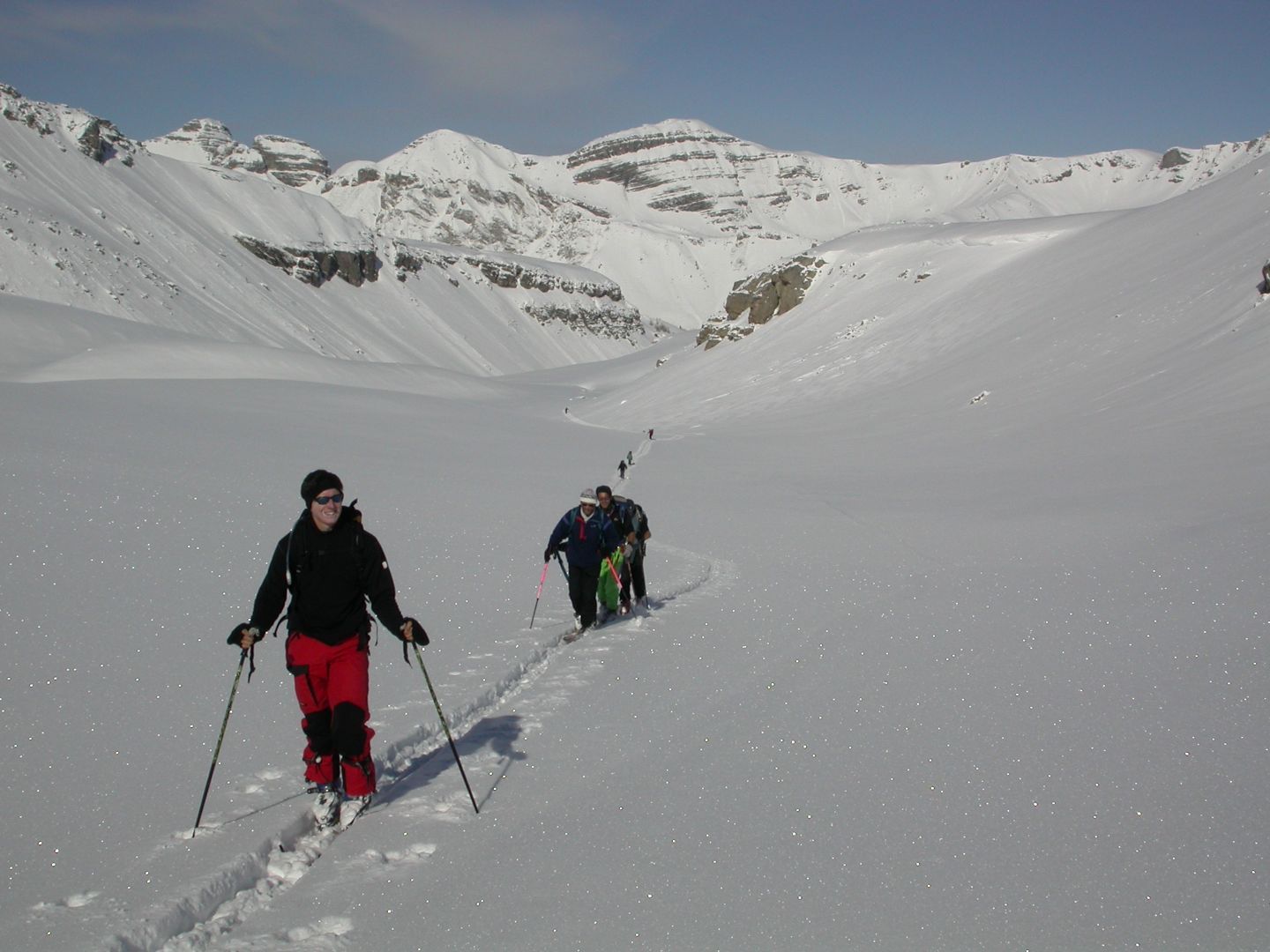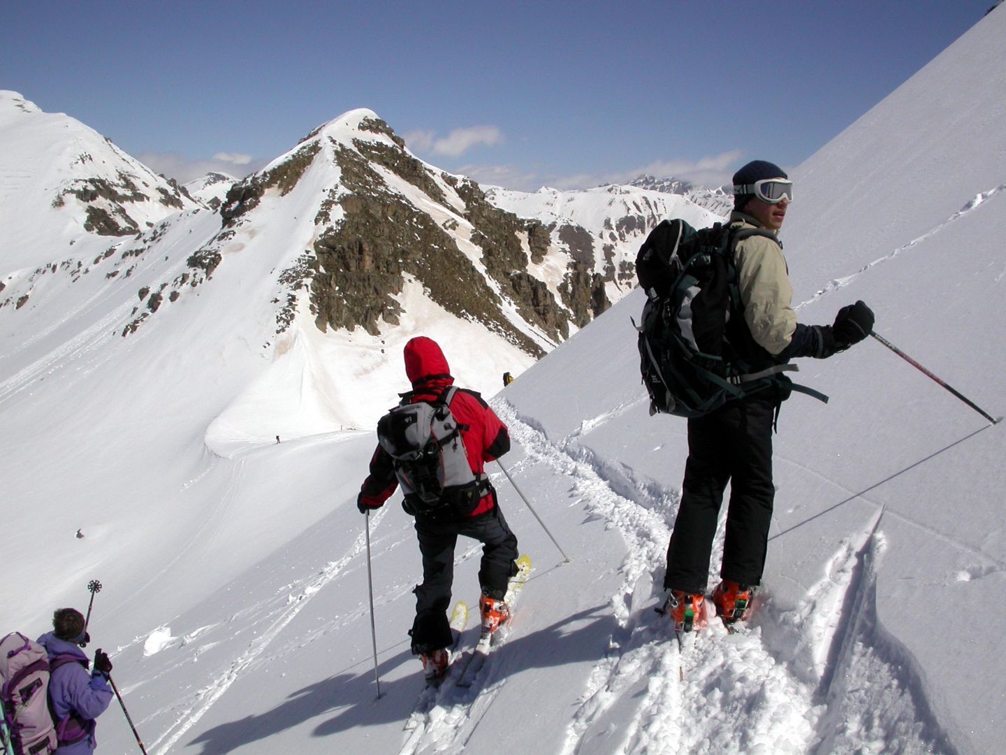 - Mardi : col du Colombier (2759m), Tête du Colombier (2789m) et Tête de Sanguinière (2856m). Remontée aux cabanes de Sanguinière (2049m), puis au col du Colombier par une pente large et bien raide. A gauche du col, montée à la tête du Colombier par une arête mixte facile. A droite du col, traversée par une belle arête de neige sur la tête de Sanguinière. Dénivelé : 1200m. Descente sur le col de la Braisse (2599m) puis le vallon de Sanguinière et le vallon du Bachelard jusqu’au gîte de Bayasse (1800m) chez Olivier.