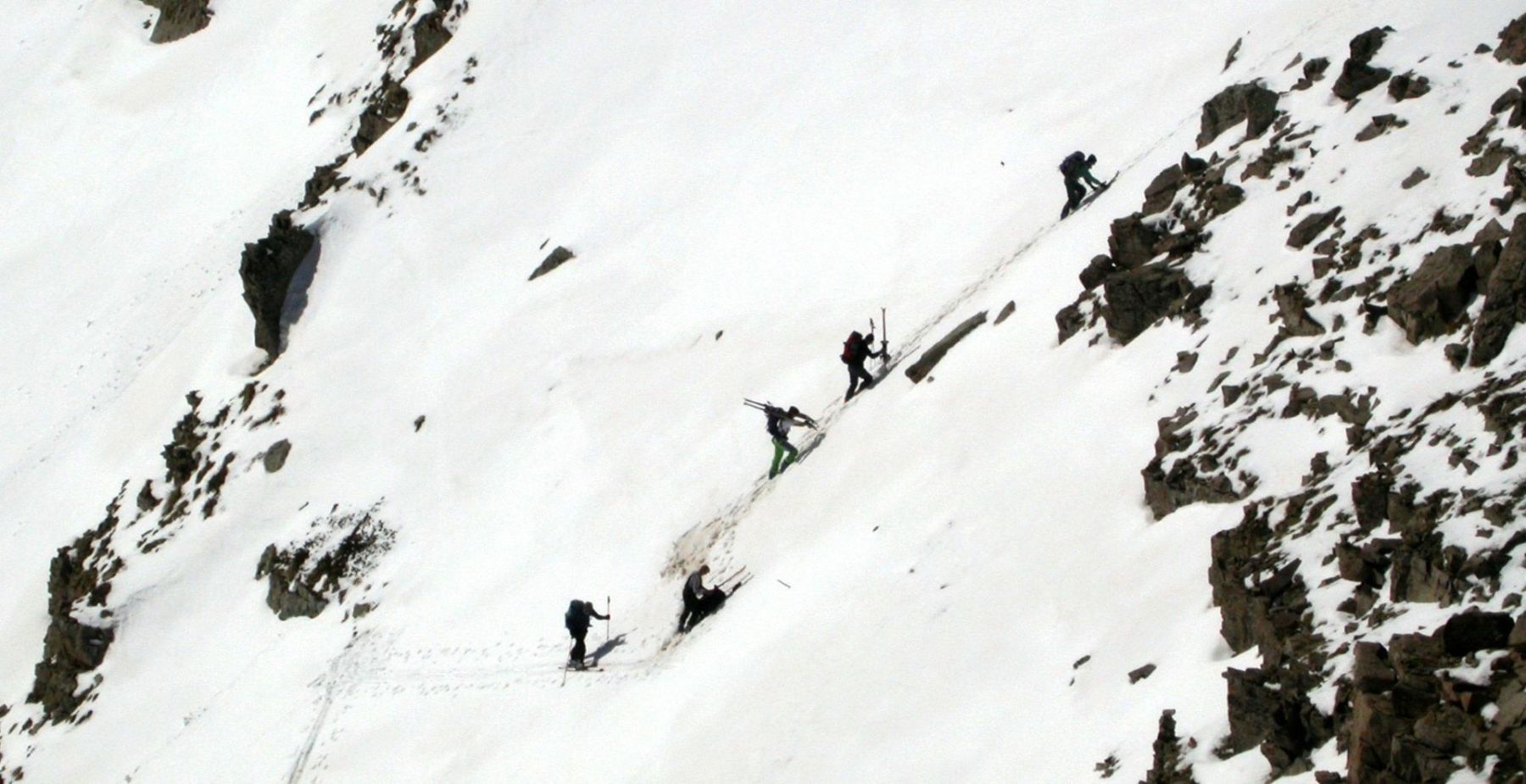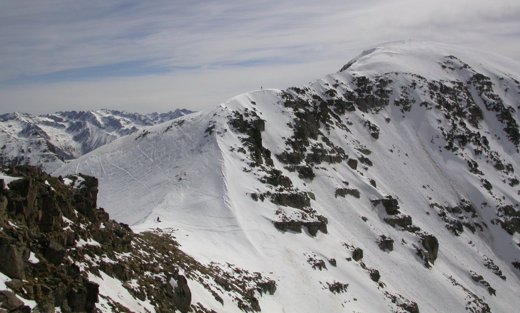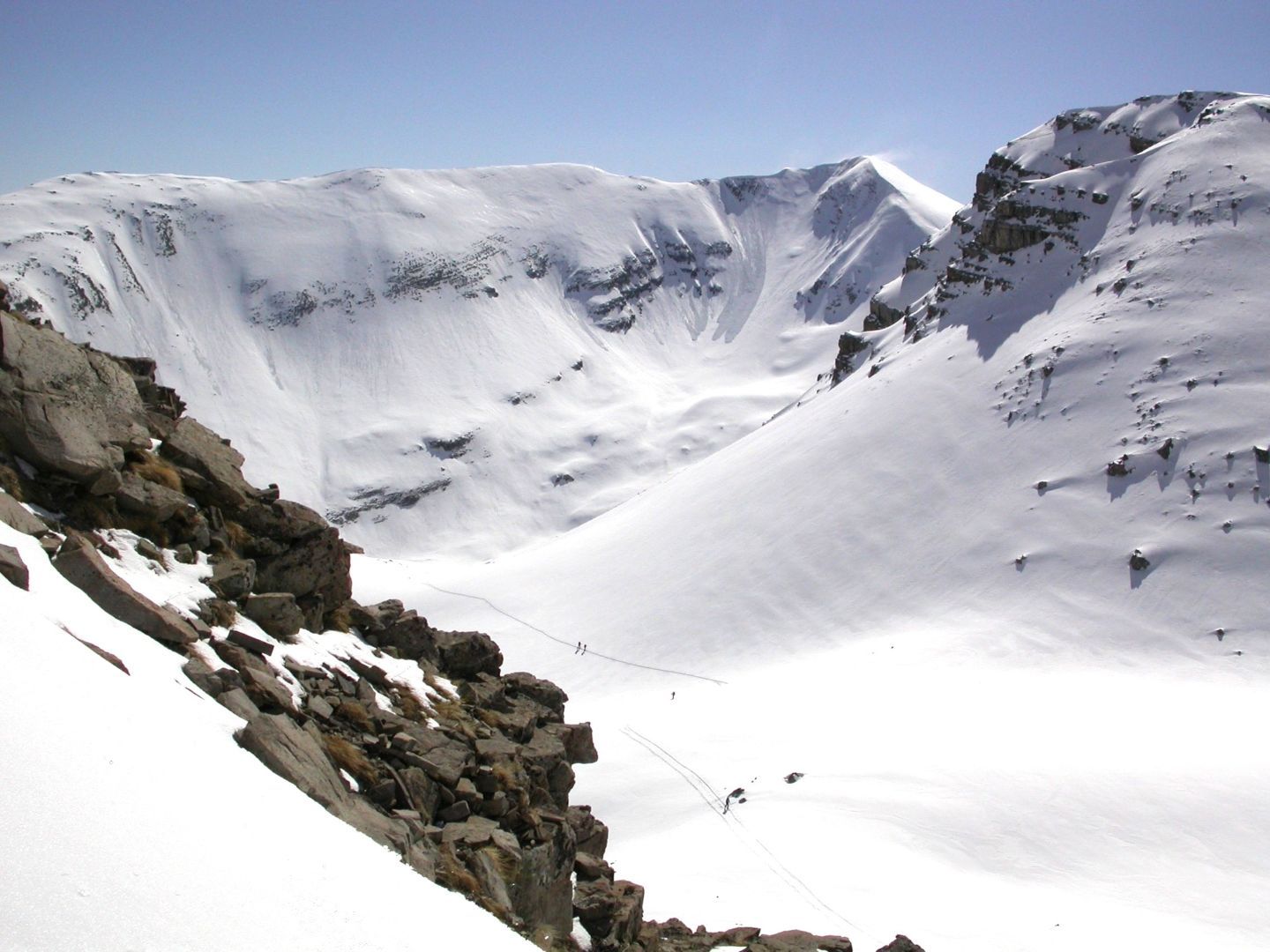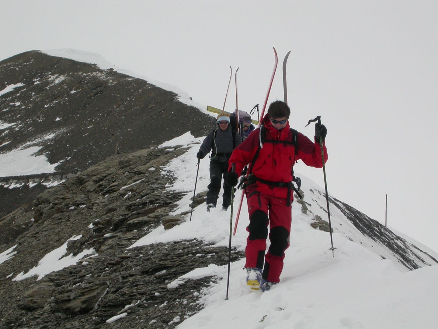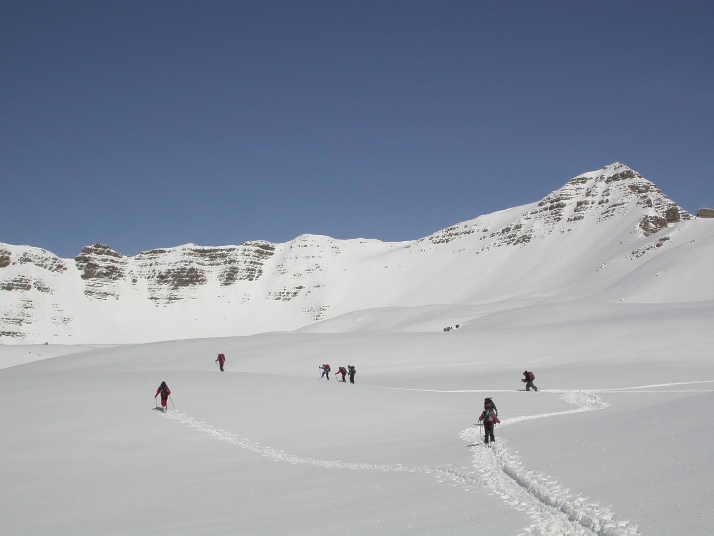 - Mardi : col du Colombier (2759m), Tête du Colombier (2789m) et Tête de Sanguinière (2856m). Remontée aux cabanes de Sanguinière (2049m), puis au col du Colombier par une pente large et bien raide. A gauche du col, montée à la tête du Colombier par une arête mixte facile. A droite du col, traversée par une belle arête de neige sur la tête de Sanguinière. Dénivelé : 1200m. Descente sur le col de la Braisse (2599m) puis le vallon de Sanguinière et le vallon du Bachelard jusqu’au gîte de Bayasse (1800m) chez Olivier.