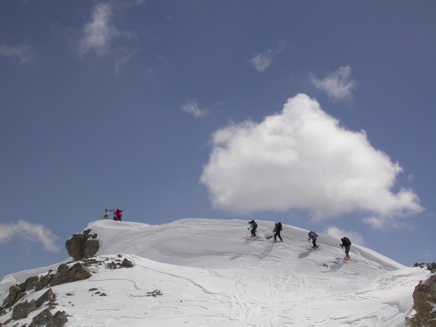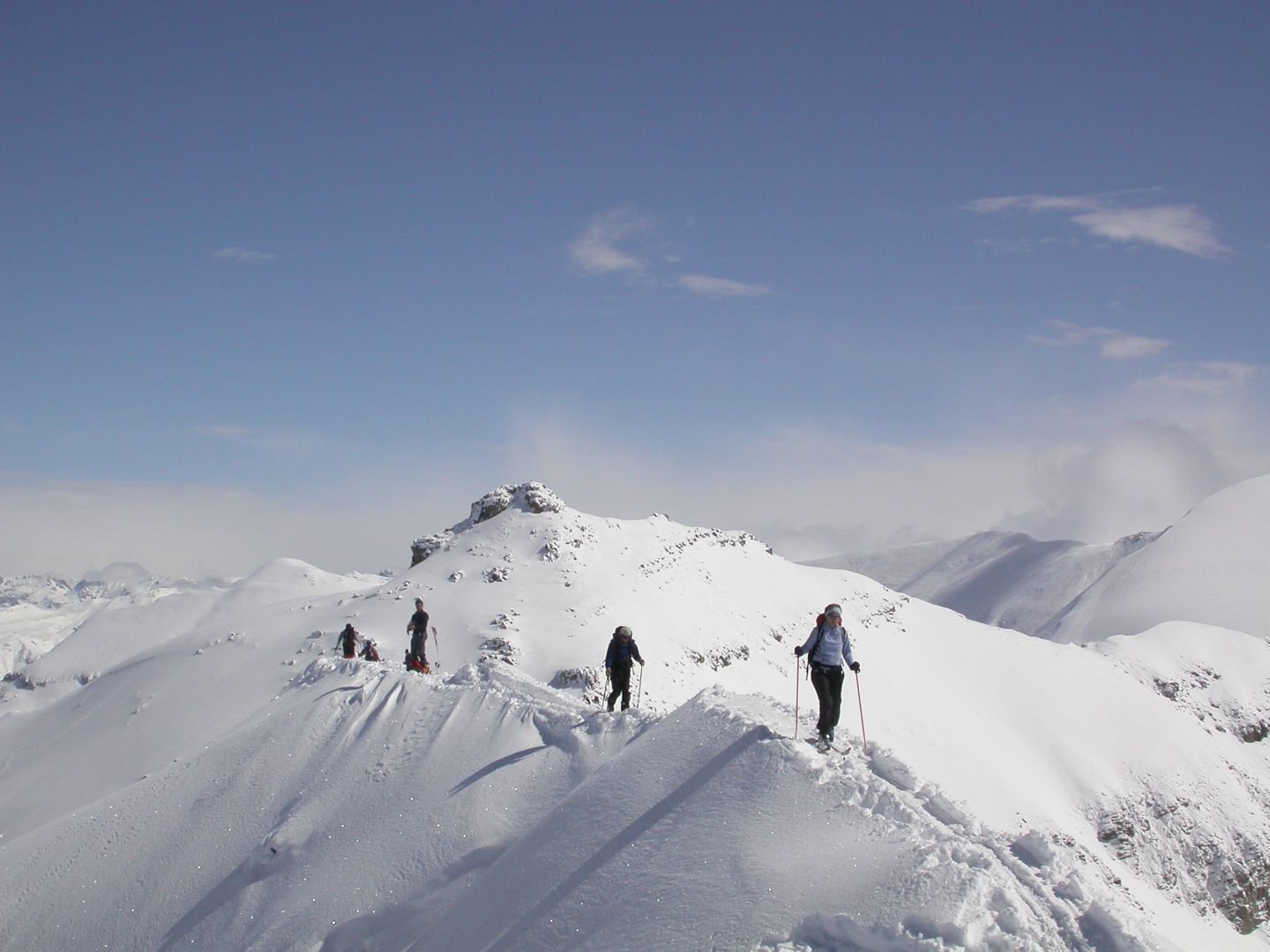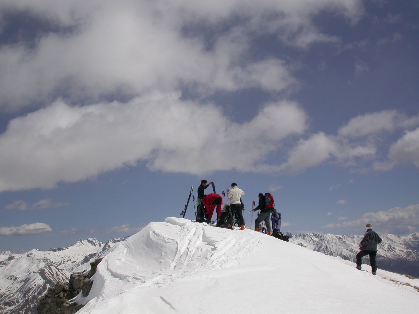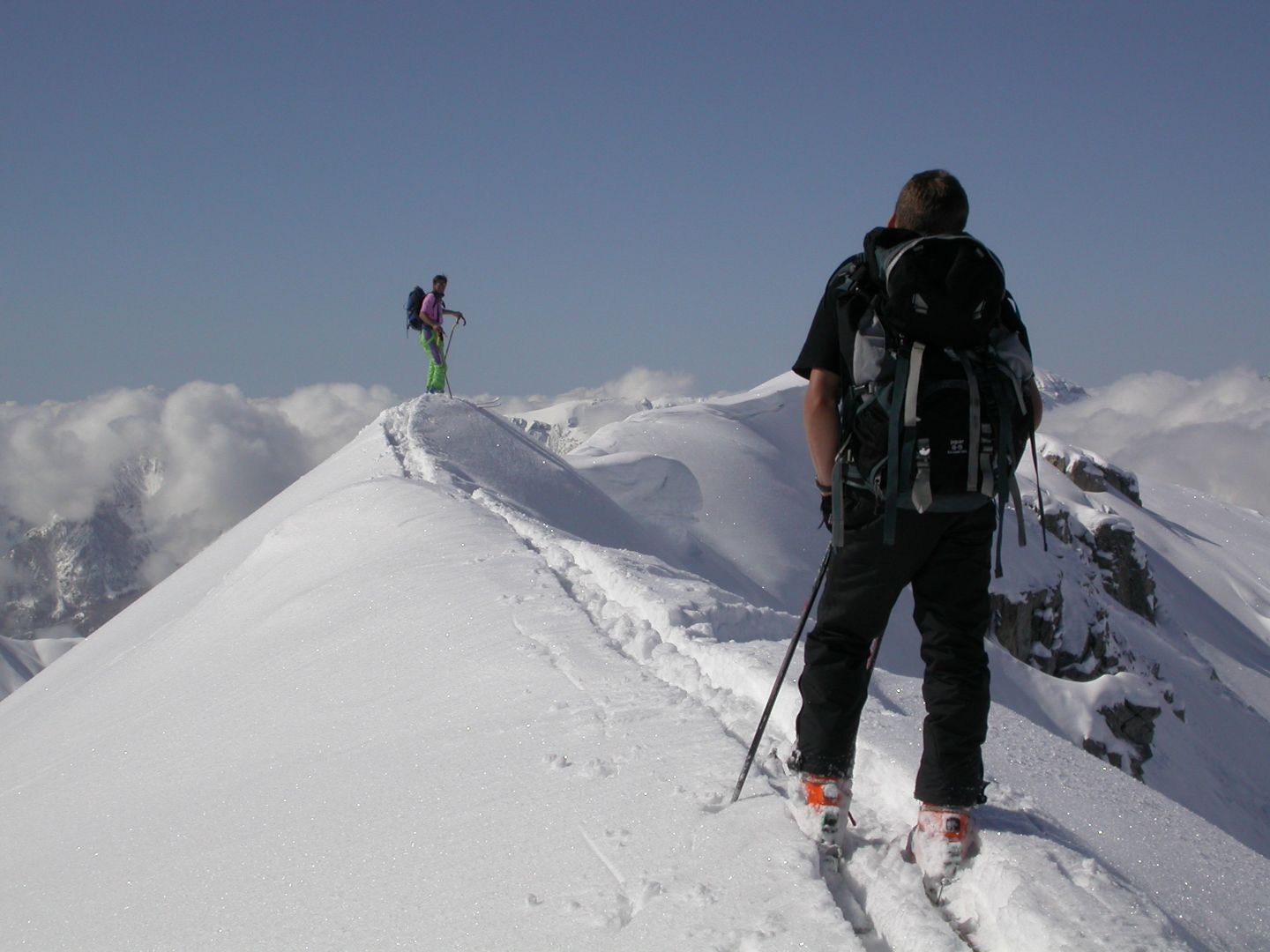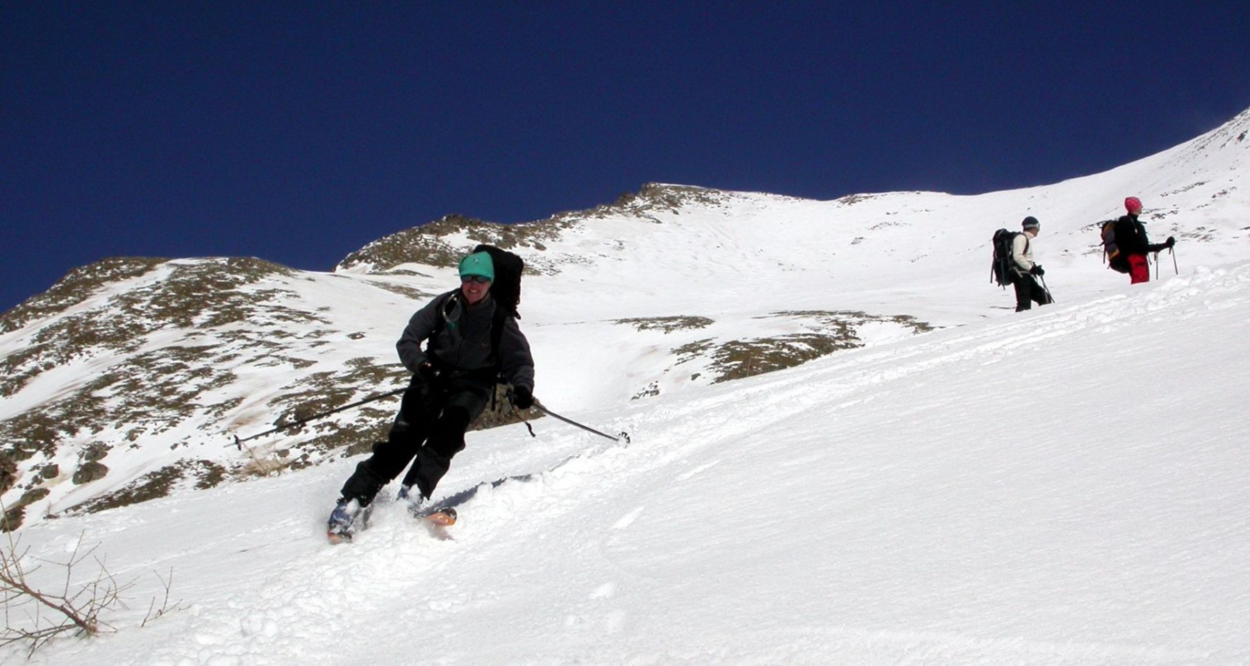 - Mardi : col du Colombier (2759m), Tête du Colombier (2789m) et Tête de Sanguinière (2856m). Remontée aux cabanes de Sanguinière (2049m), puis au col du Colombier par une pente large et bien raide. A gauche du col, montée à la tête du Colombier par une arête mixte facile. A droite du col, traversée par une belle arête de neige sur la tête de Sanguinière. Dénivelé : 1200m. Descente sur le col de la Braisse (2599m) puis le vallon de Sanguinière et le vallon du Bachelard jusqu’au gîte de Bayasse (1800m) chez Olivier.
