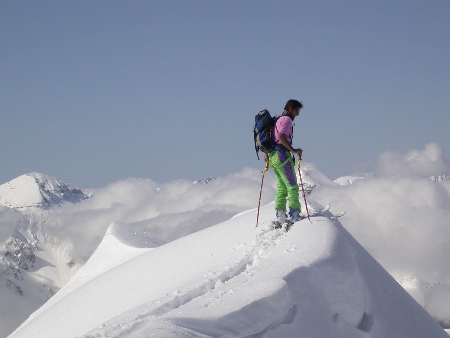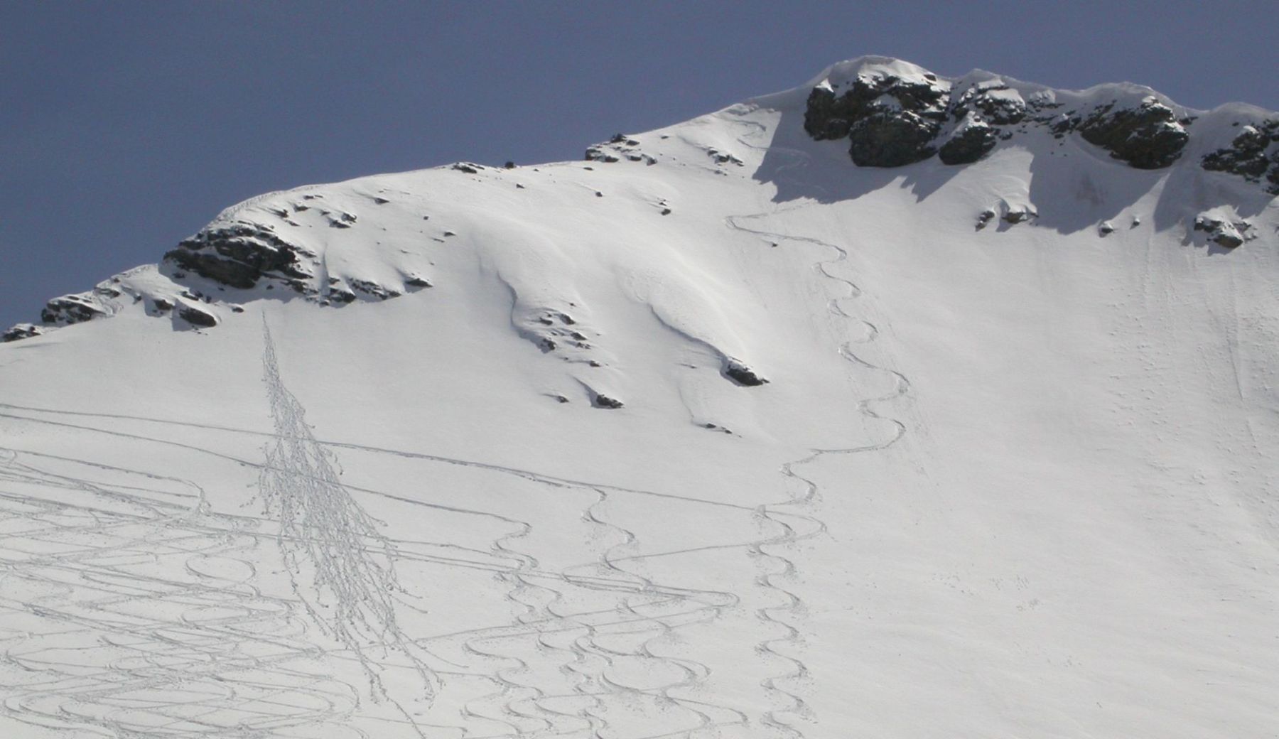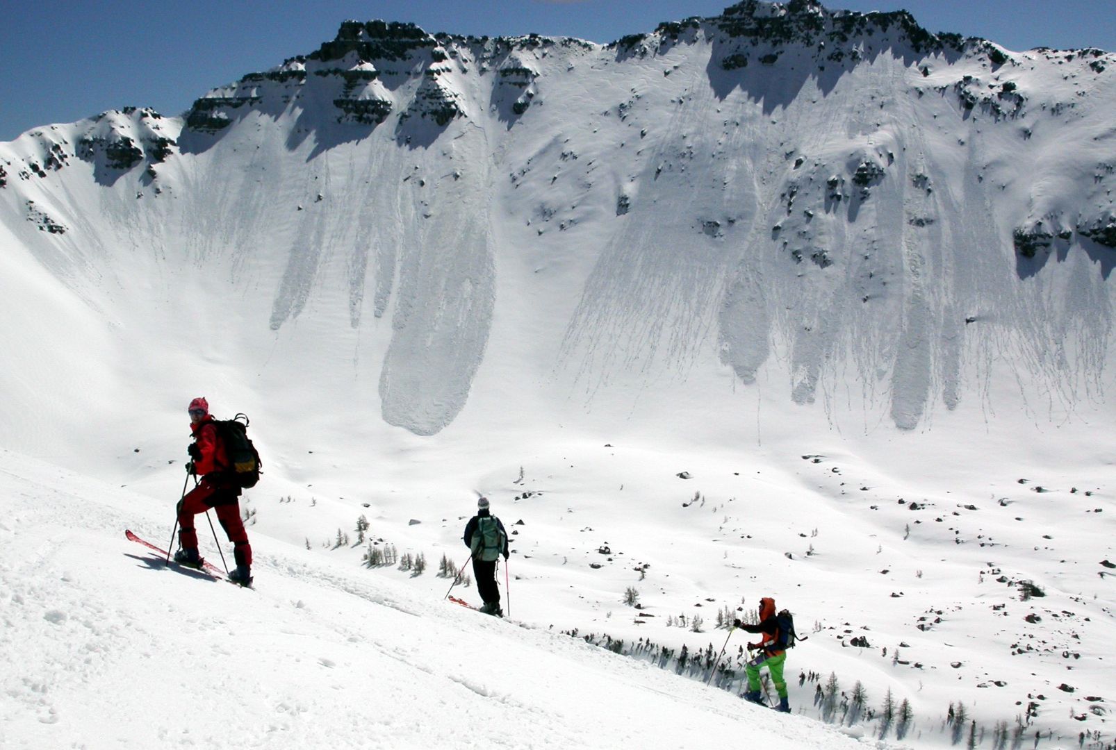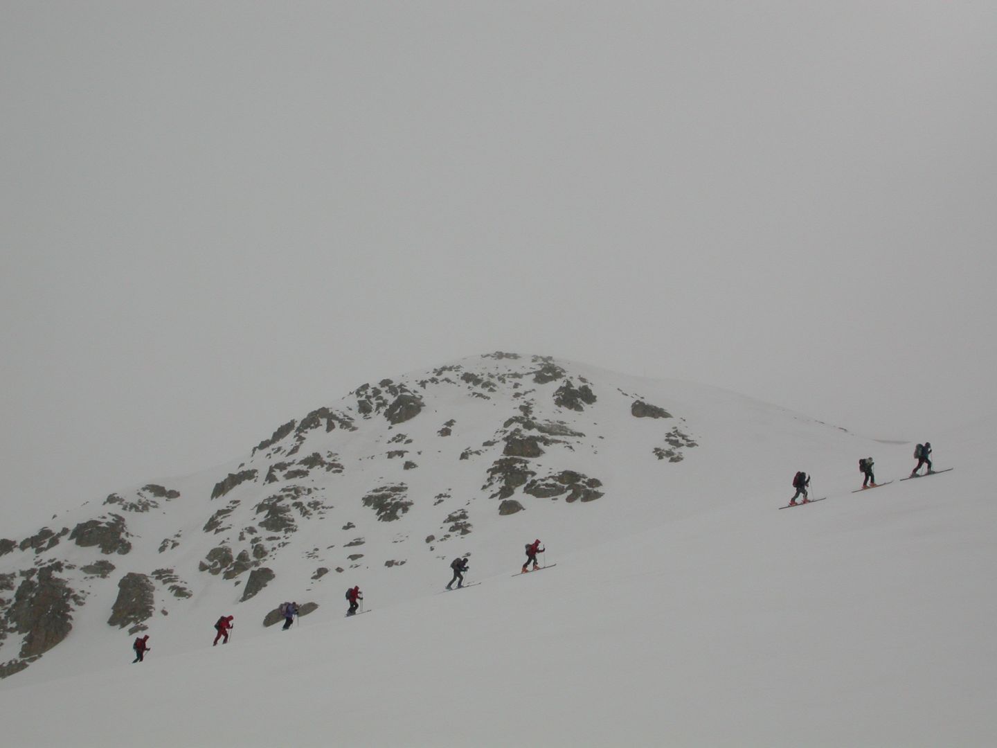 - Mardi : col du Colombier (2759m), Tête du Colombier (2789m) et Tête de Sanguinière (2856m). Remontée aux cabanes de Sanguinière (2049m), puis au col du Colombier par une pente large et bien raide. A gauche du col, montée à la tête du Colombier par une arête mixte facile. A droite du col, traversée par une belle arête de neige sur la tête de Sanguinière. Dénivelé : 1200m. Descente sur le col de la Braisse (2599m) puis le vallon de Sanguinière et le vallon du Bachelard jusqu’au gîte de Bayasse (1800m) chez Olivier.