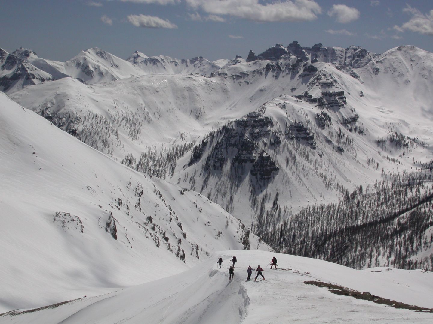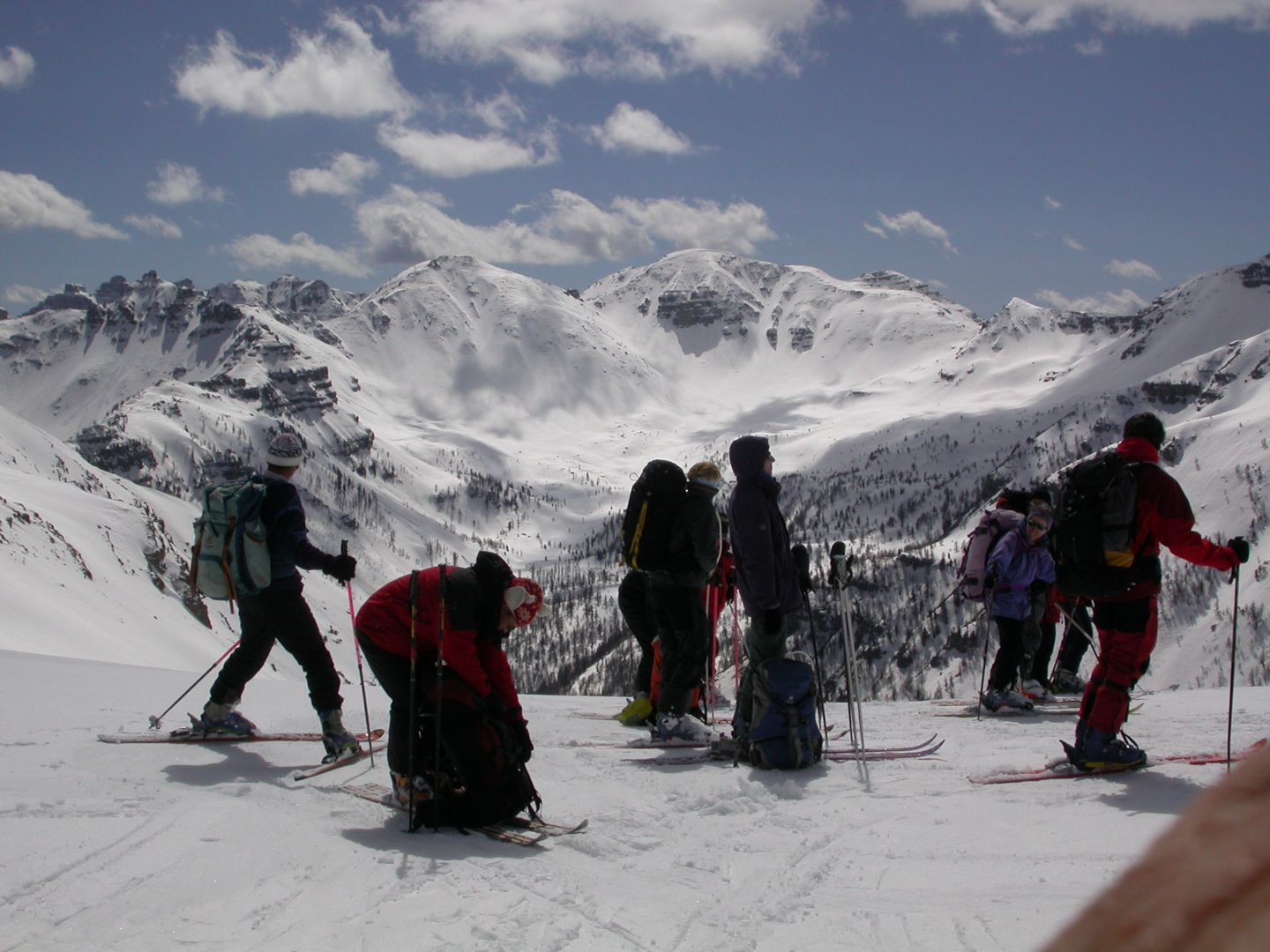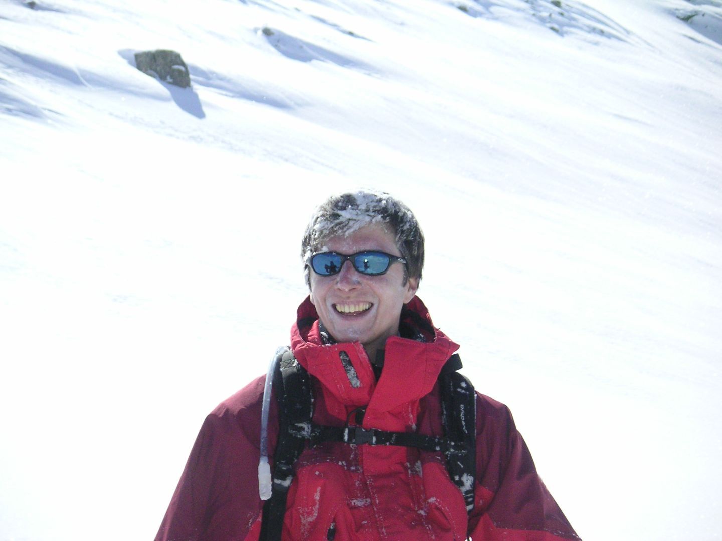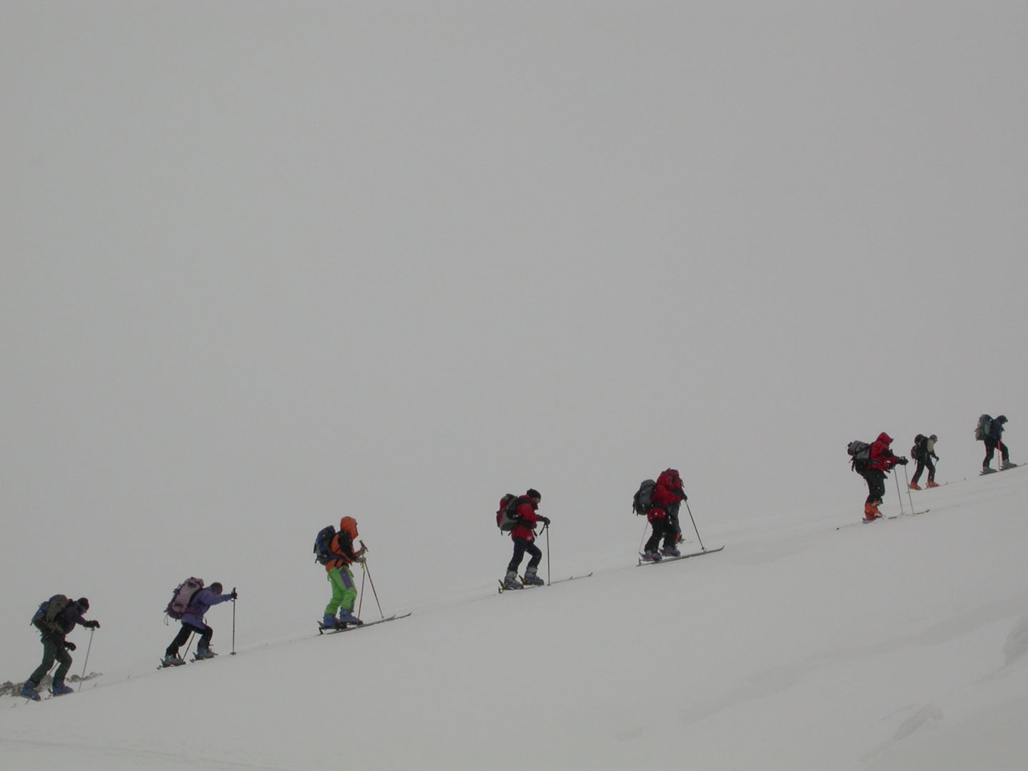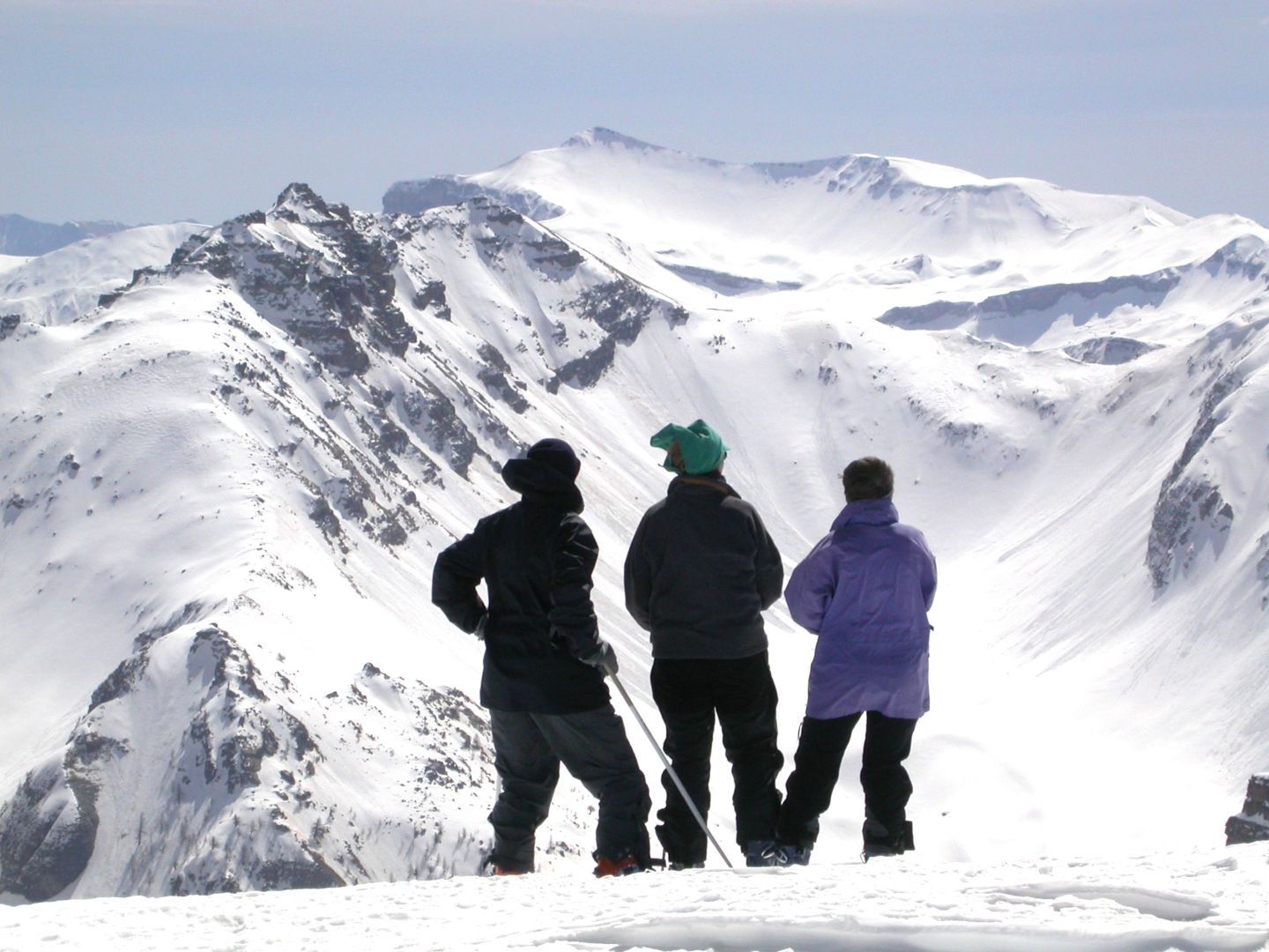 - Mardi : col du Colombier (2759m), Tête du Colombier (2789m) et Tête de Sanguinière (2856m). Remontée aux cabanes de Sanguinière (2049m), puis au col du Colombier par une pente large et bien raide. A gauche du col, montée à la tête du Colombier par une arête mixte facile. A droite du col, traversée par une belle arête de neige sur la tête de Sanguinière. Dénivelé : 1200m. Descente sur le col de la Braisse (2599m) puis le vallon de Sanguinière et le vallon du Bachelard jusqu’au gîte de Bayasse (1800m) chez Olivier.