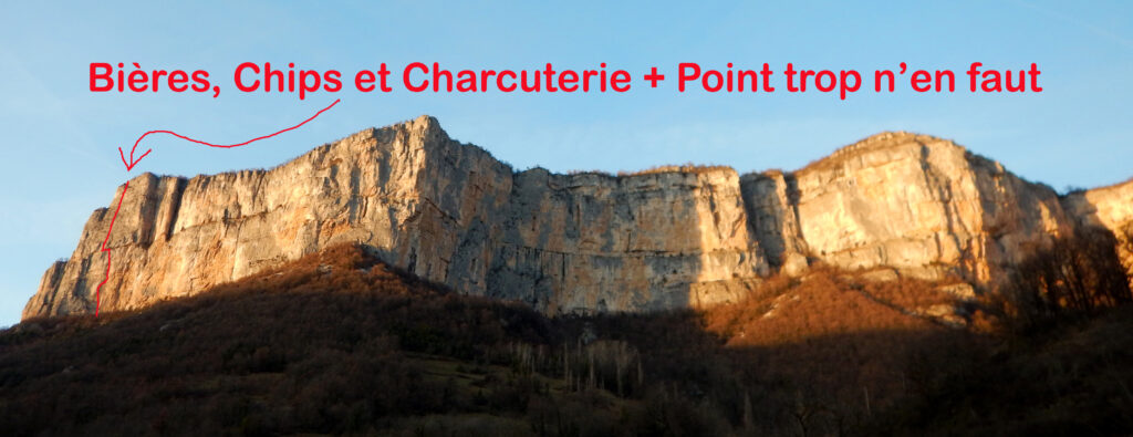 Arrivés à la vire médiane, endroit idéal pour saucissonner, nous avons rejoint le départ des cinq longueurs terminales de “Point Trop n’en Faut”. Une voie TA chichement équipée et qui se déroule essentiellement en fissures cheminées que j’ai trouvées éreintantes !