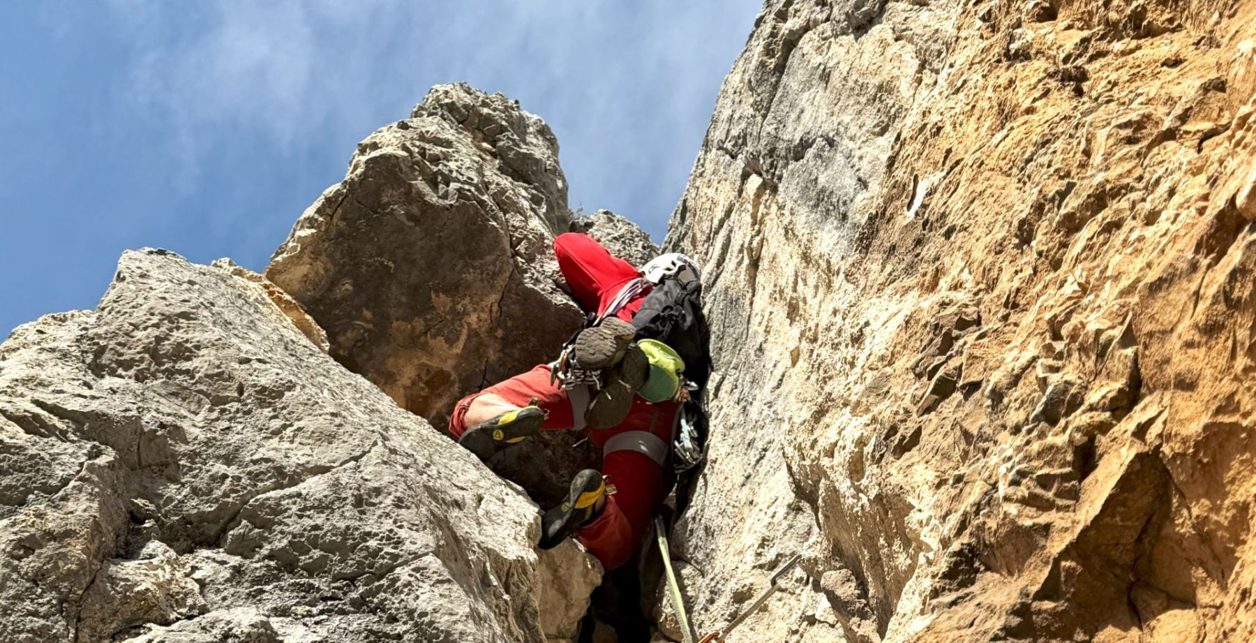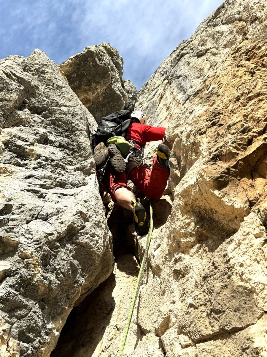 Arrivés à la vire médiane, endroit idéal pour saucissonner, nous avons rejoint le départ des cinq longueurs terminales de “Point Trop n’en Faut”. Une voie TA chichement équipée et qui se déroule essentiellement en fissures cheminées que j’ai trouvées éreintantes !