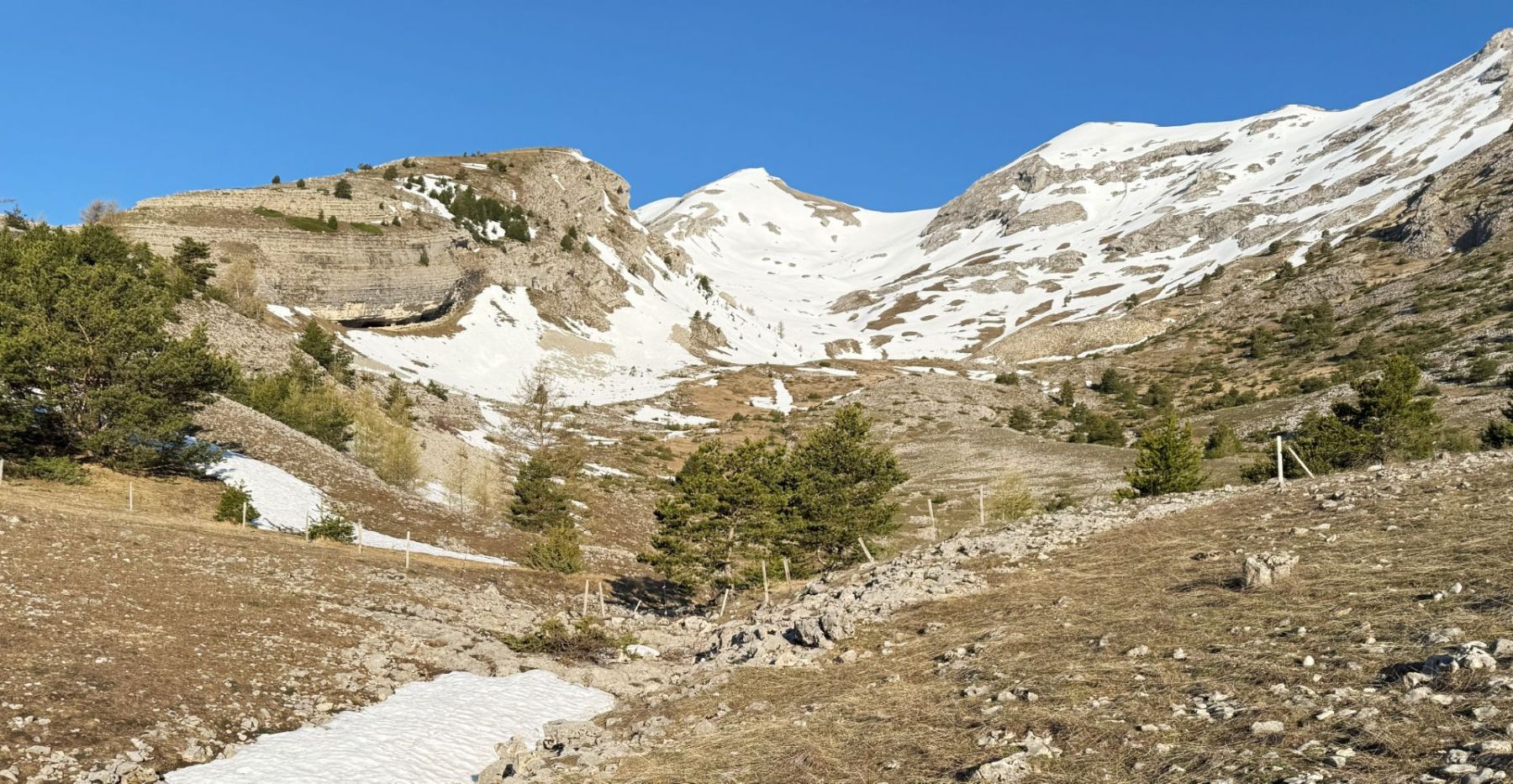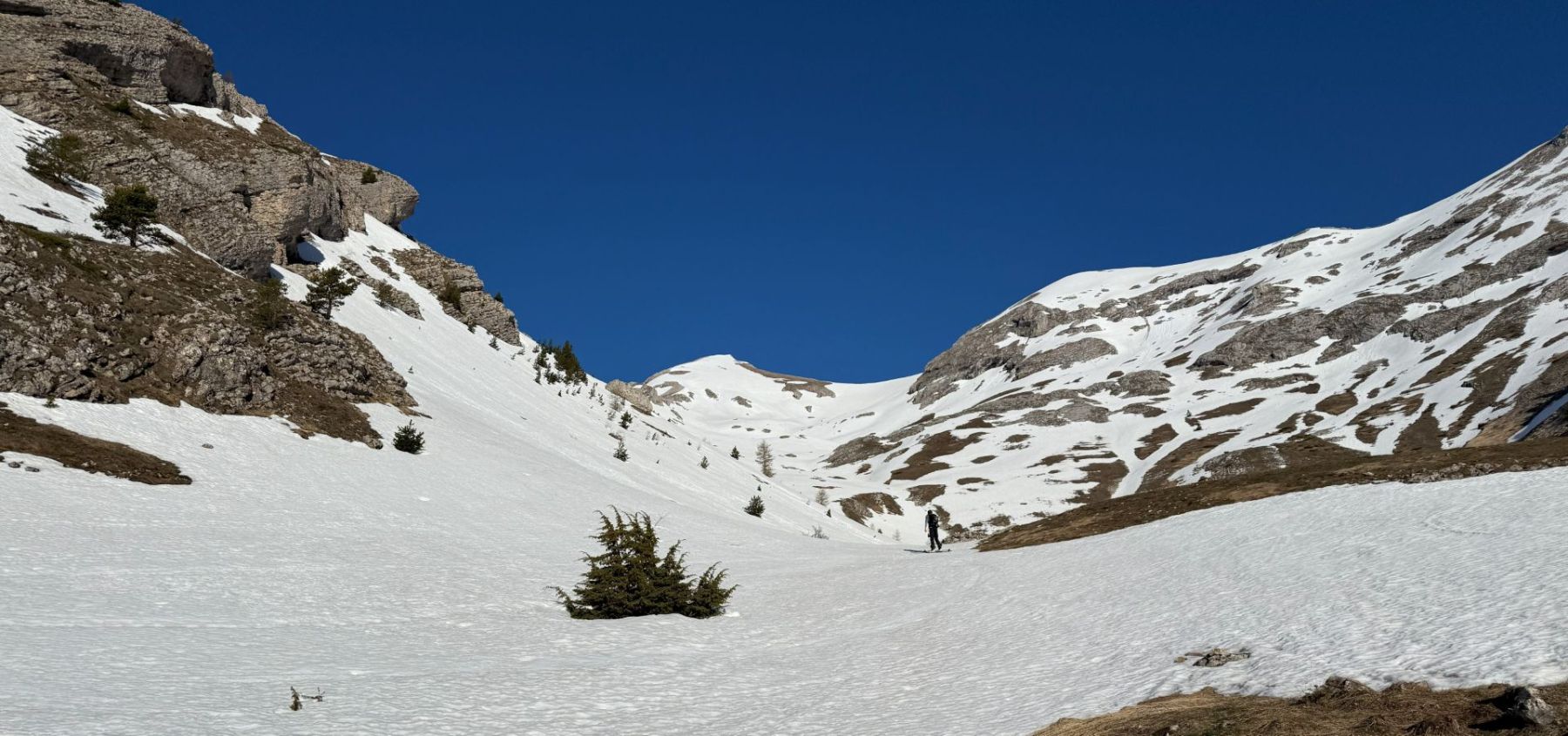 Au départ du hameau de Coutieres, très proche du Col du Festre, nous avons porté les skis pendant une grosse demi-heure jusqu’aux premières plaques de neige du vallon du Clot de Bachas.