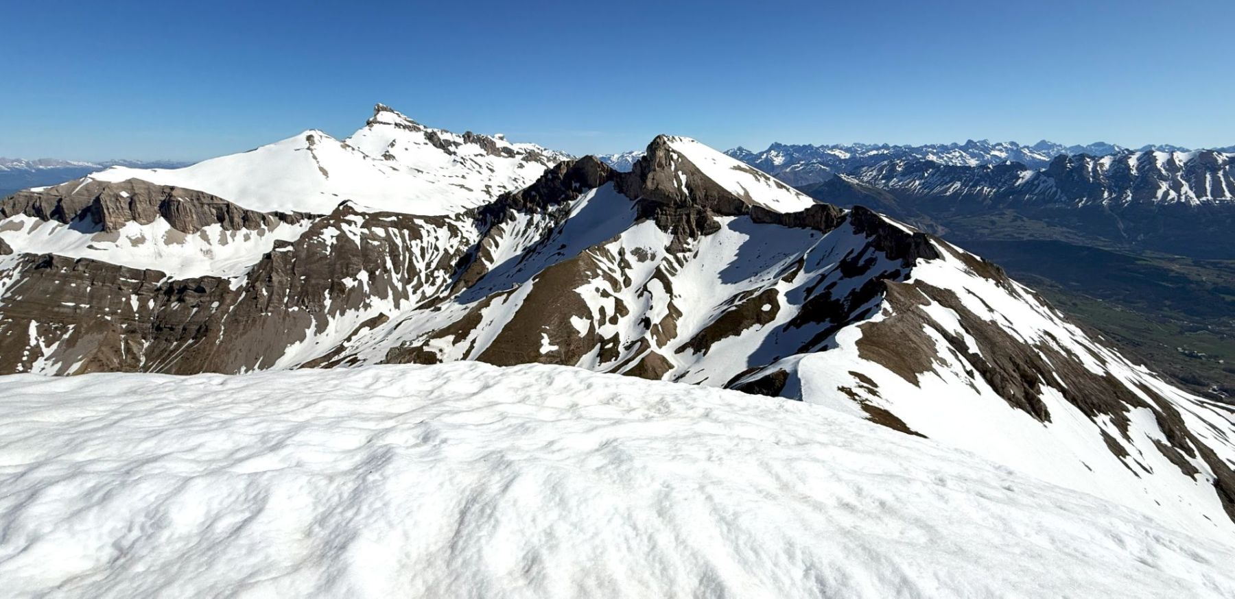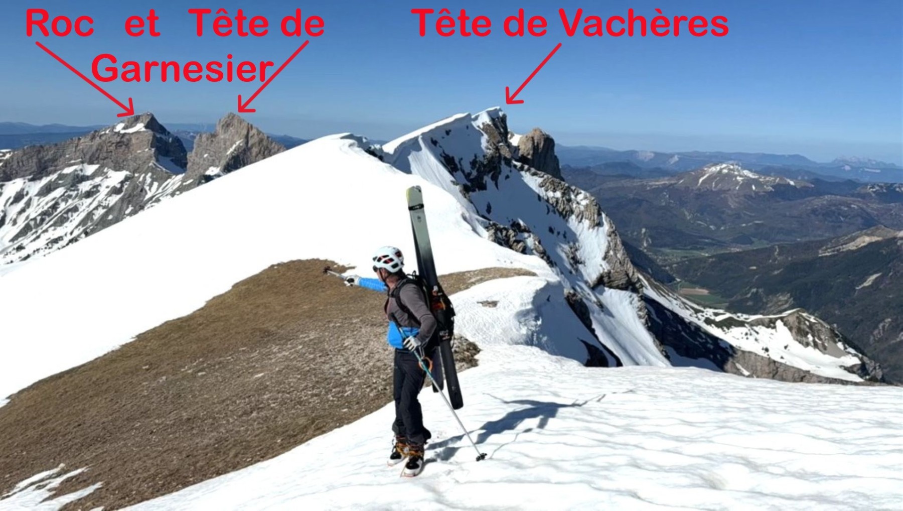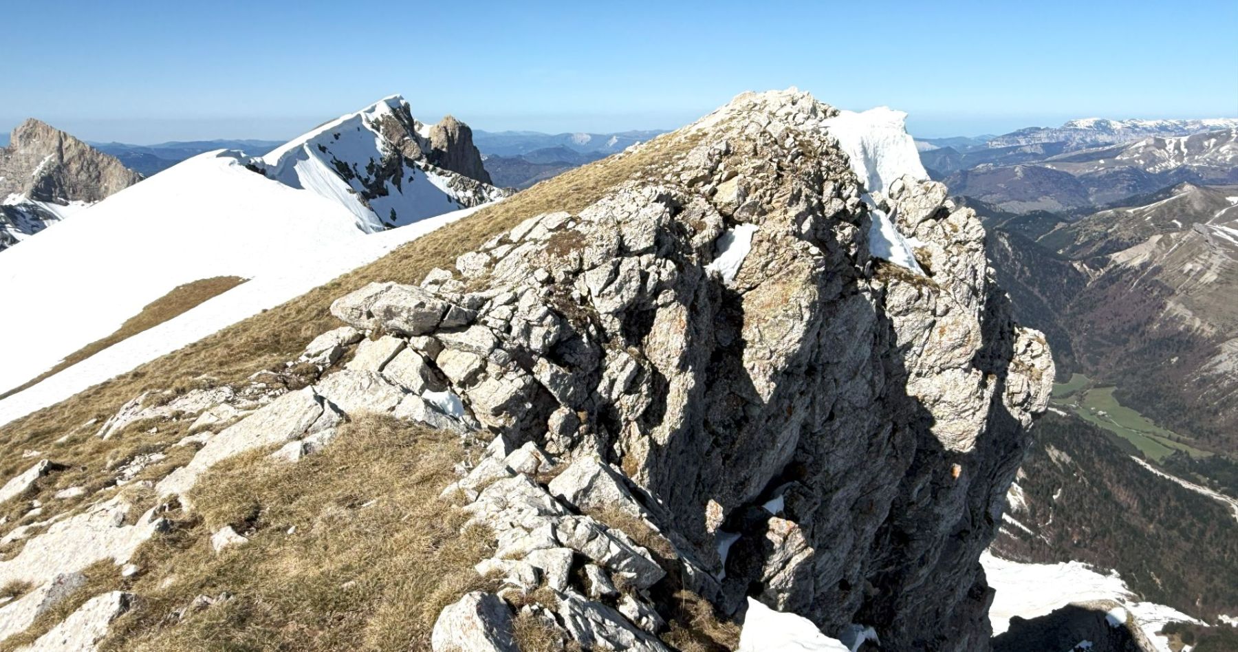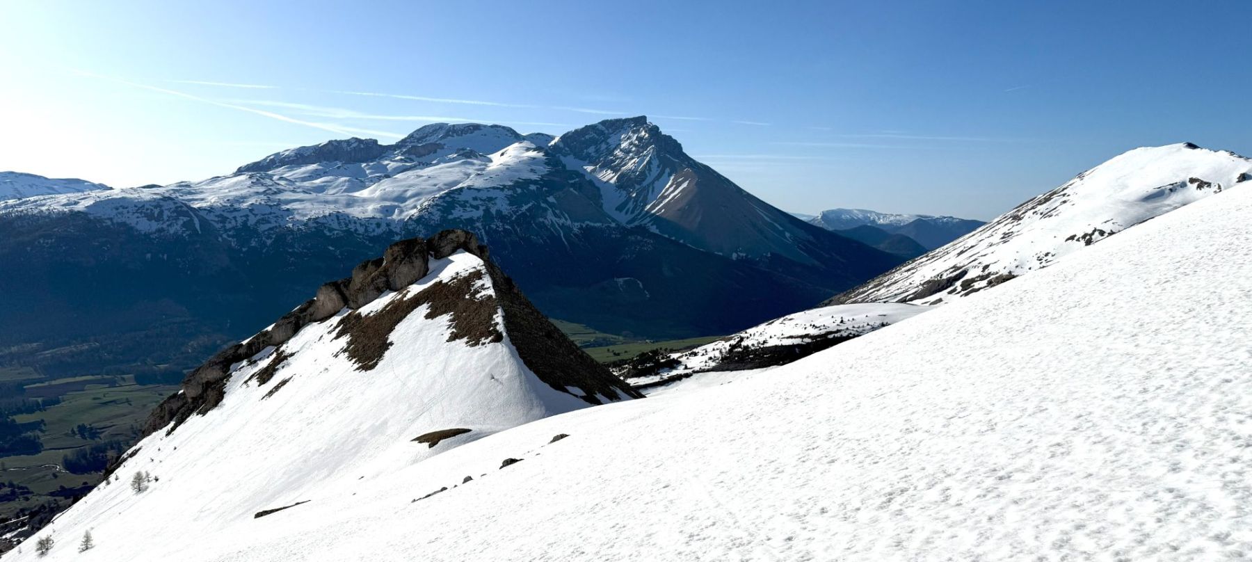 Comme souvent dans ce fabuleux petit Massif du Dévoluy, l’arrivée au sommet est magique avec la présence toute proche de rocs, de pics et de pentes qui, ici, plongent littéralement sur la région du Trièves !