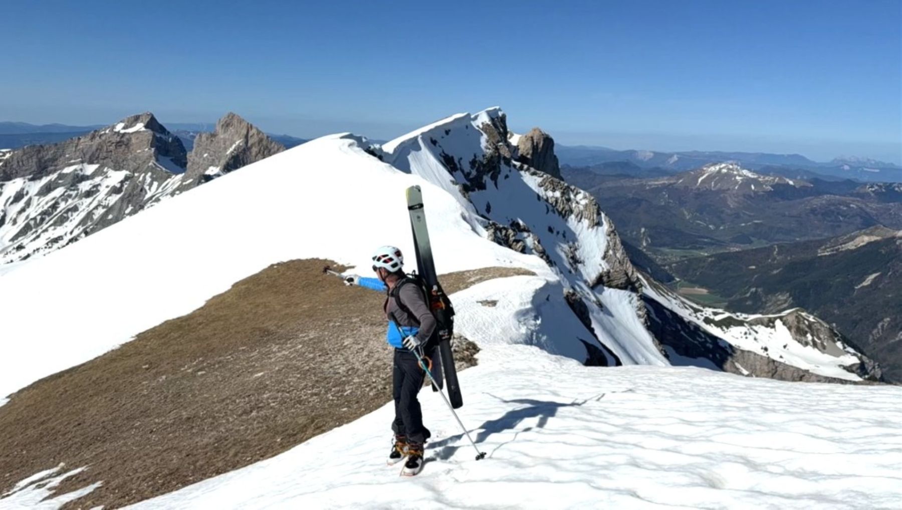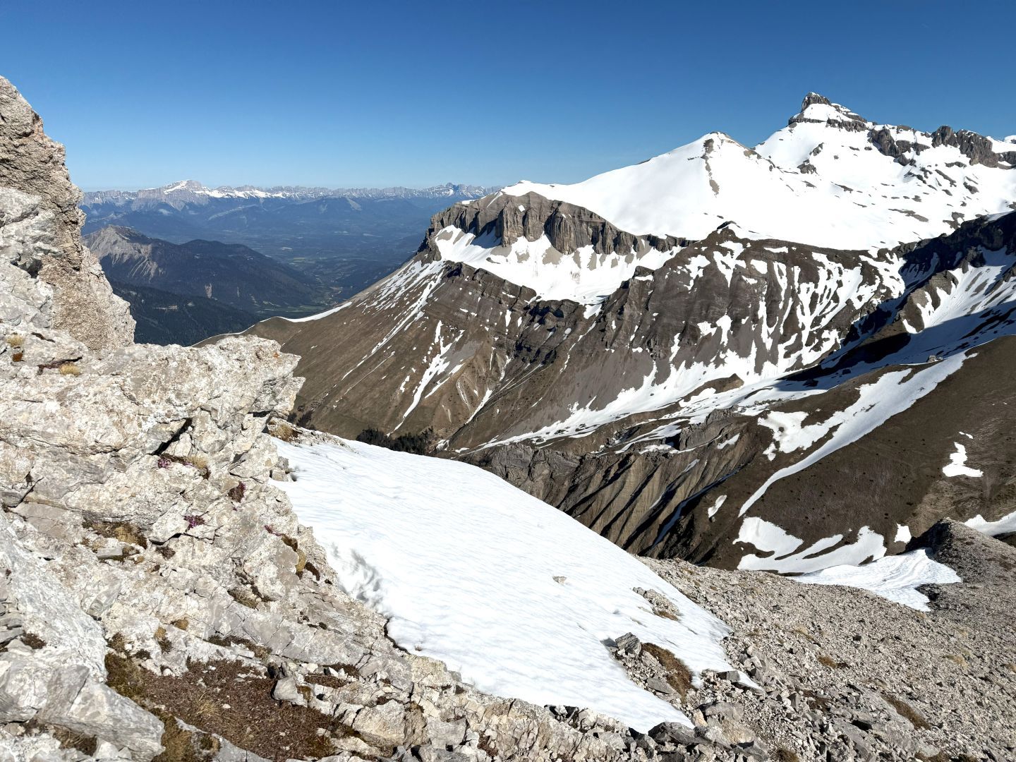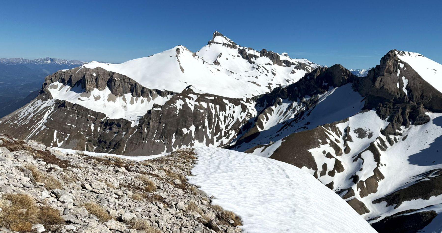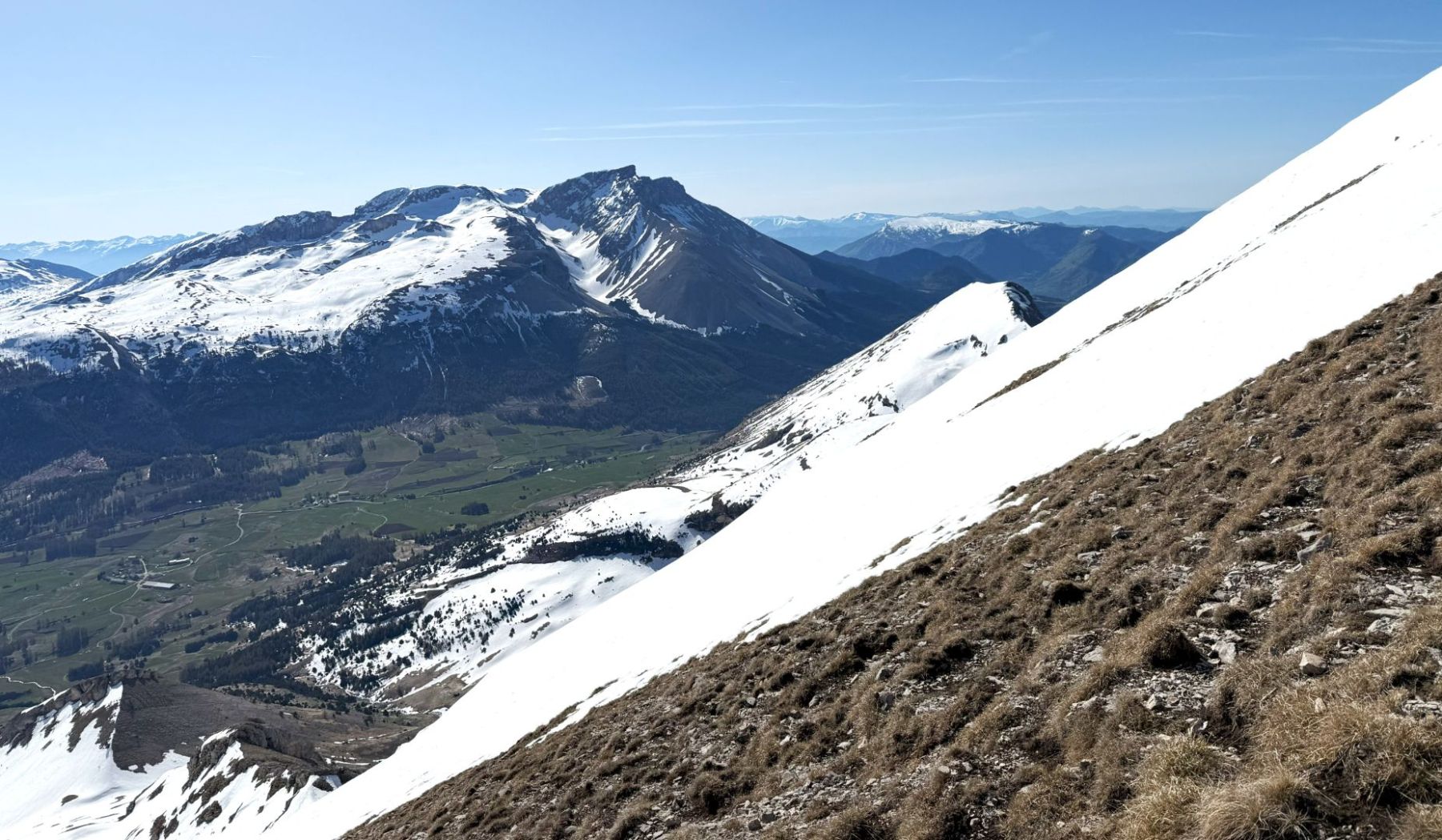 Comme souvent dans ce fabuleux petit Massif du Dévoluy, l’arrivée au sommet est magique avec la présence toute proche de rocs, de pics et de pentes qui, ici, plongent littéralement sur la région du Trièves !