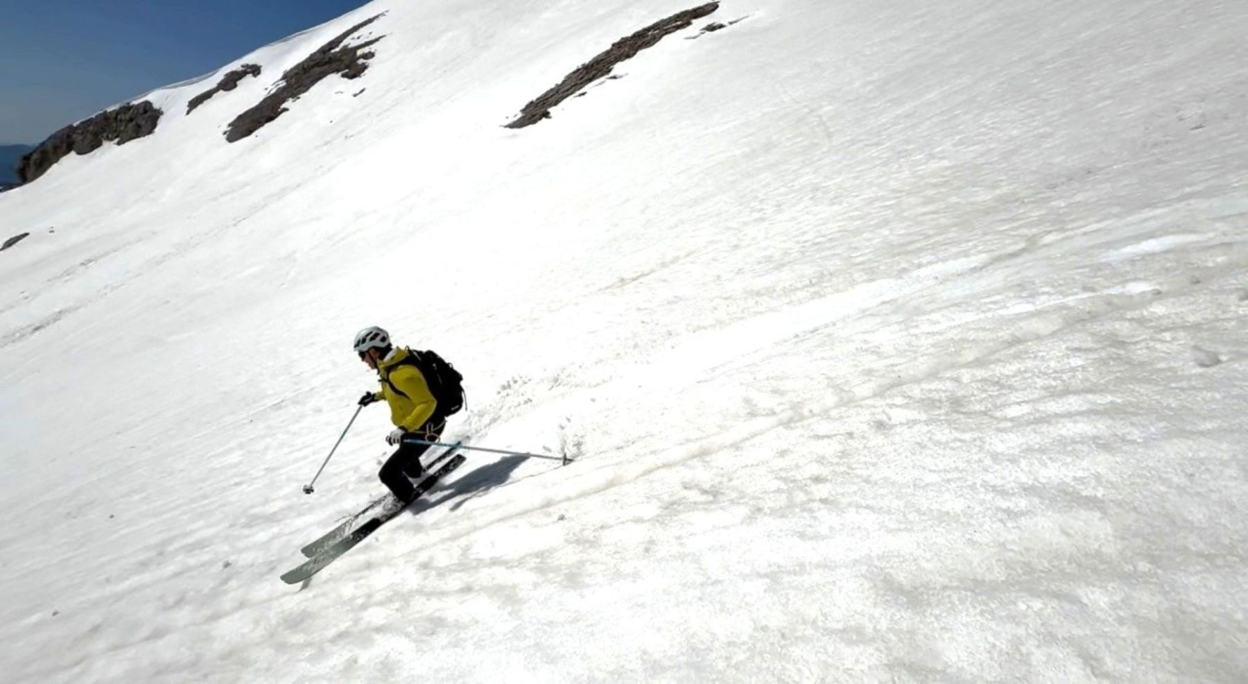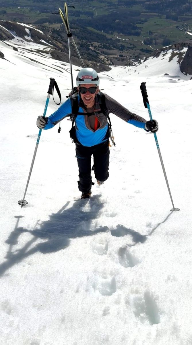 Ensuite presque tout droit dans de belles pentes vallonnées, nous sommes montés jusqu’à laisser sur la gauche le petit sommet triangulaire du Touret et rejoindre finalement la seule section soutenue de cette randonnée : une large et longue pente raide. De là, nous avons porté les skis pour éviter toute glissade intempestive lors des conversions dans cette neige déjà un peu ramollie !