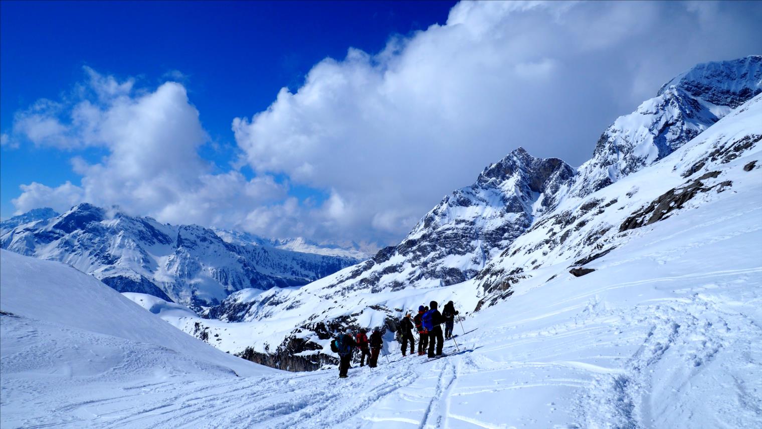 Départ au dessus du parking du téléphérique de Bure presque skis aux pieds et montée tous les sept jusqu’à la cabane du Vallon d’Âne. Puis deux groupes : Marceau et son Papé filent jusqu’au Pas du Follet. Pendant ce temps, le reste du groupe s’entraine aux conversions pour accéder au point 2019 de la Crête d’Âne.